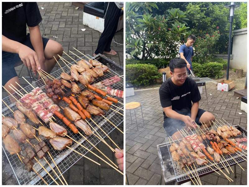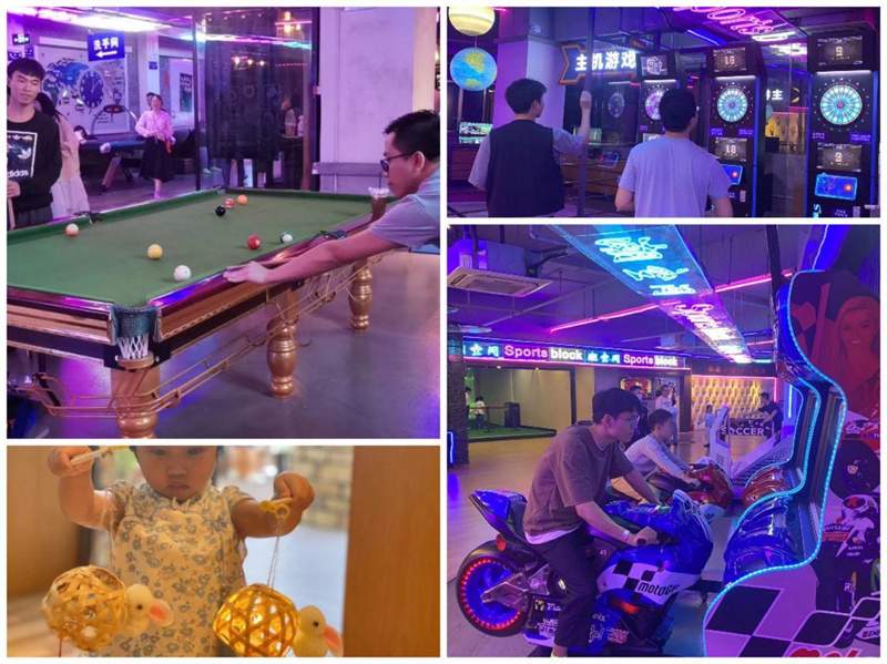 Colleagues gather together for a barbecue.Play a lot of games,like guess lantern riddles,playing billiards,playing basketball,etc.