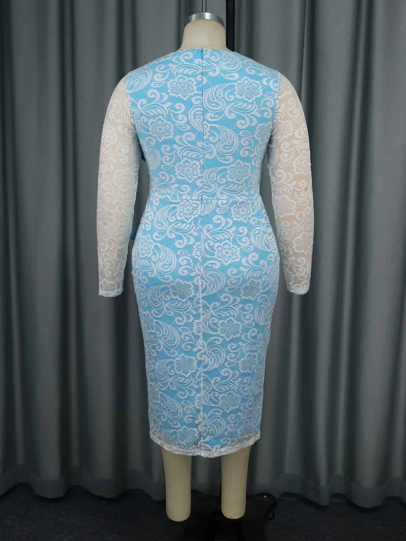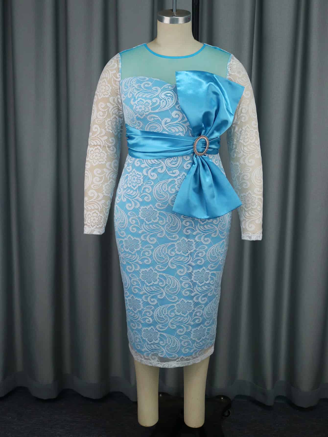Step into sophistication with our Blue Lace Patchwork Dress, perfect for any occasion. This elegant dress features a classic O-neckline and intricate lace patchwork, adding a refined and feminine touch. The long, see-through sleeves offer a delicate contrast, creating an ethereal look. A charming bowtie detail at the neckline adds a playful yet polished finish to the design.