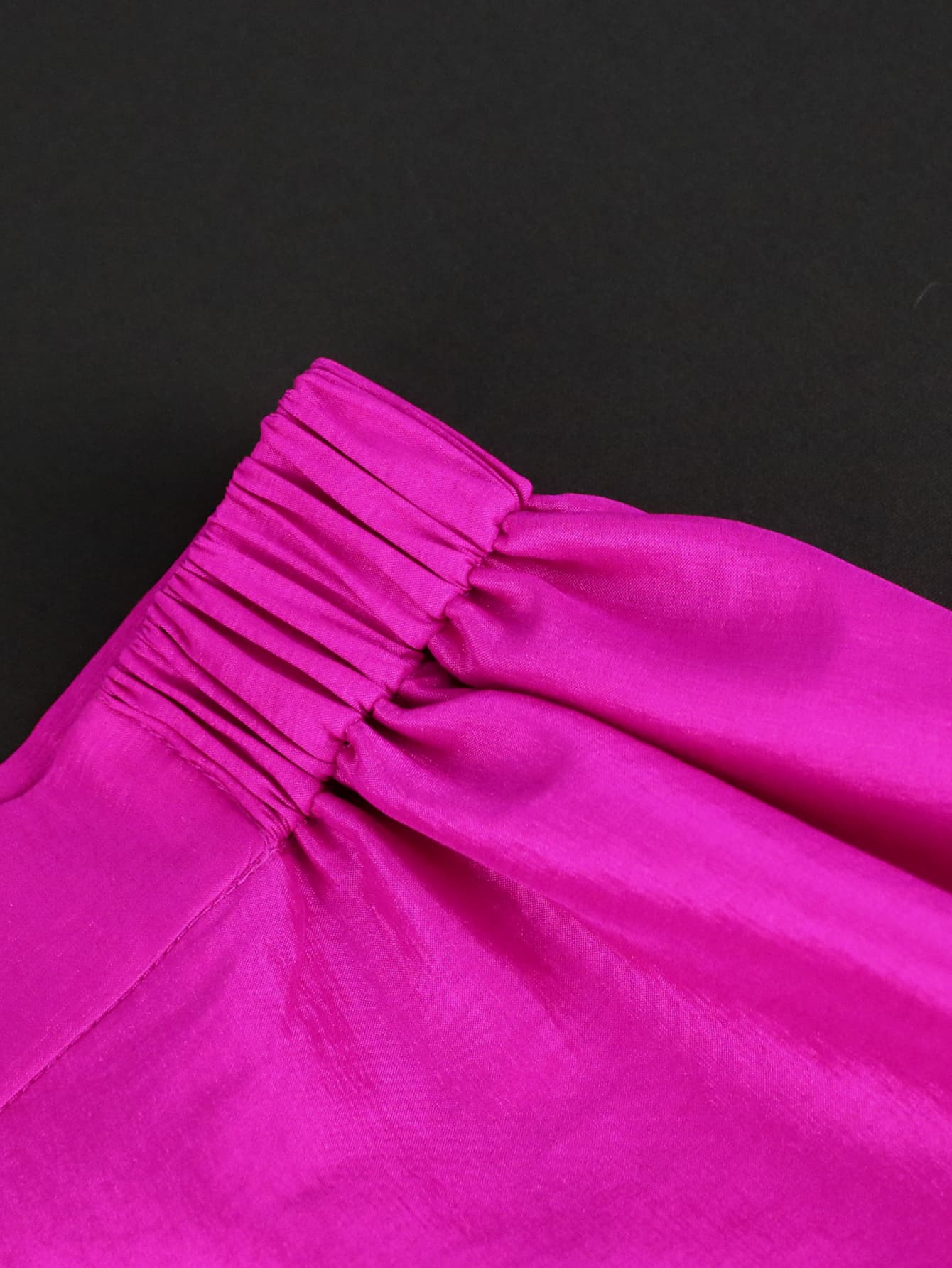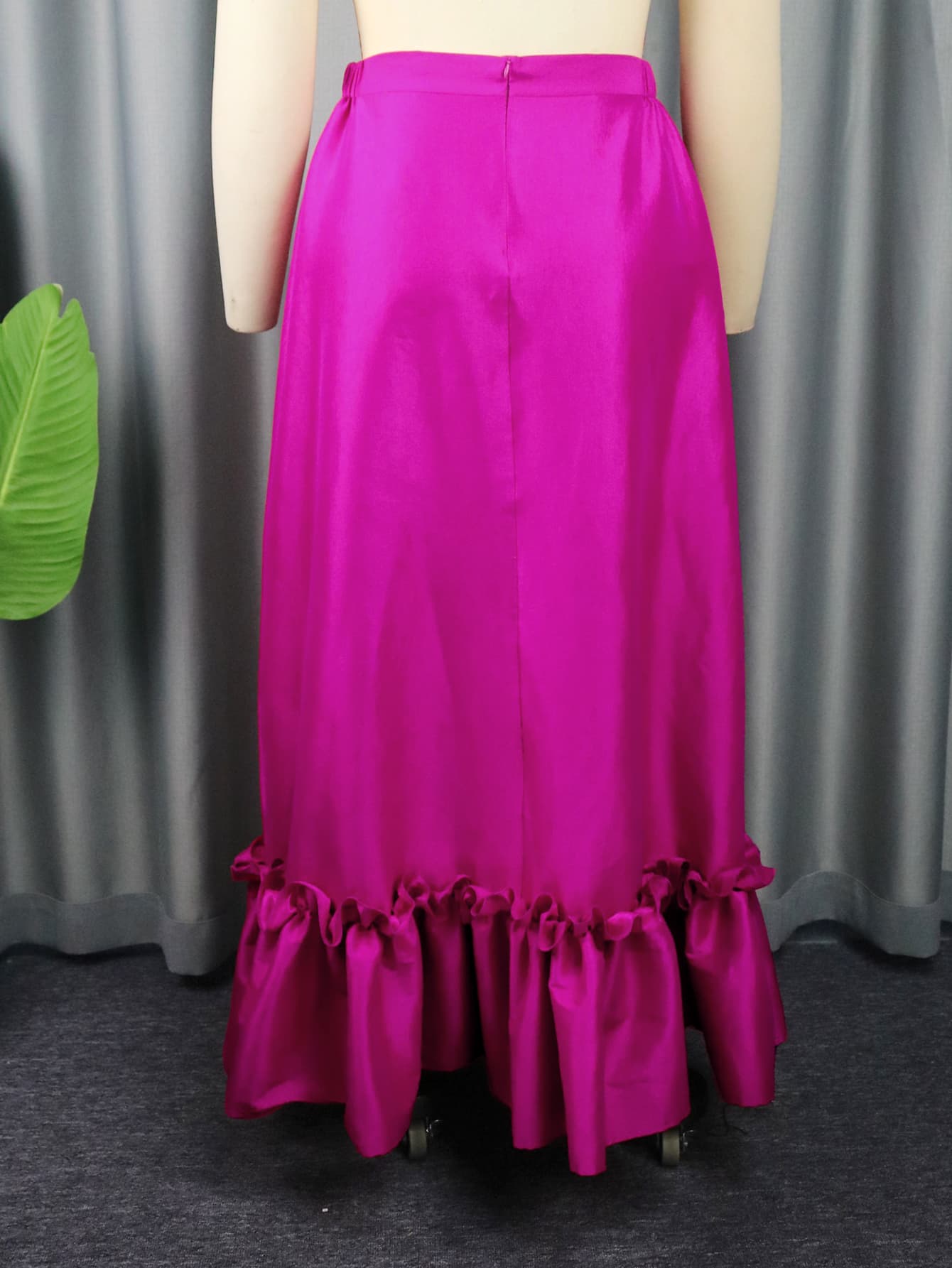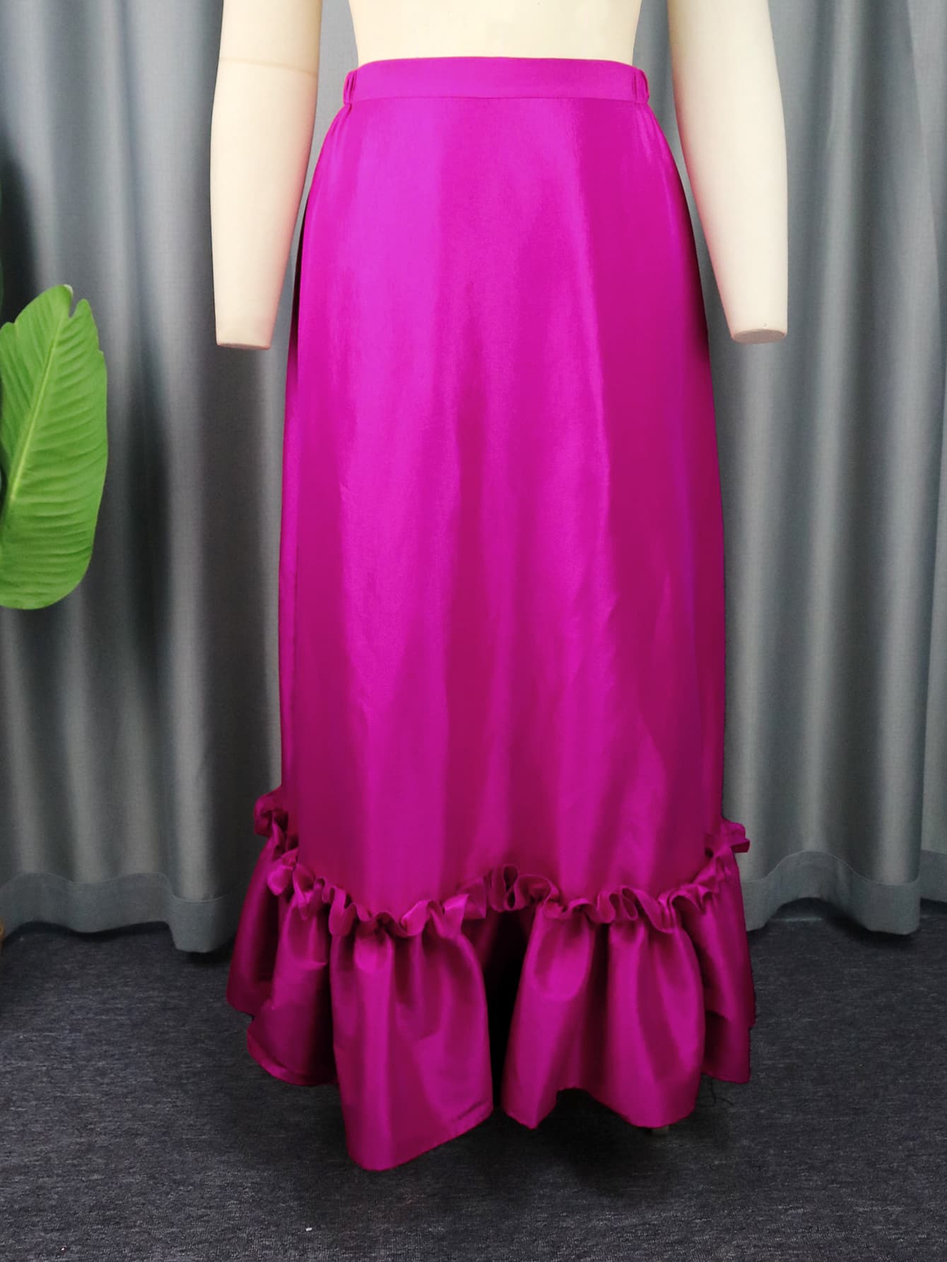 This stunning skirt features a vibrant fuchsia hue with a shiny finish, giving you a luxurious and eye-catching look for any special occasion.It can be custom made in other colors.
