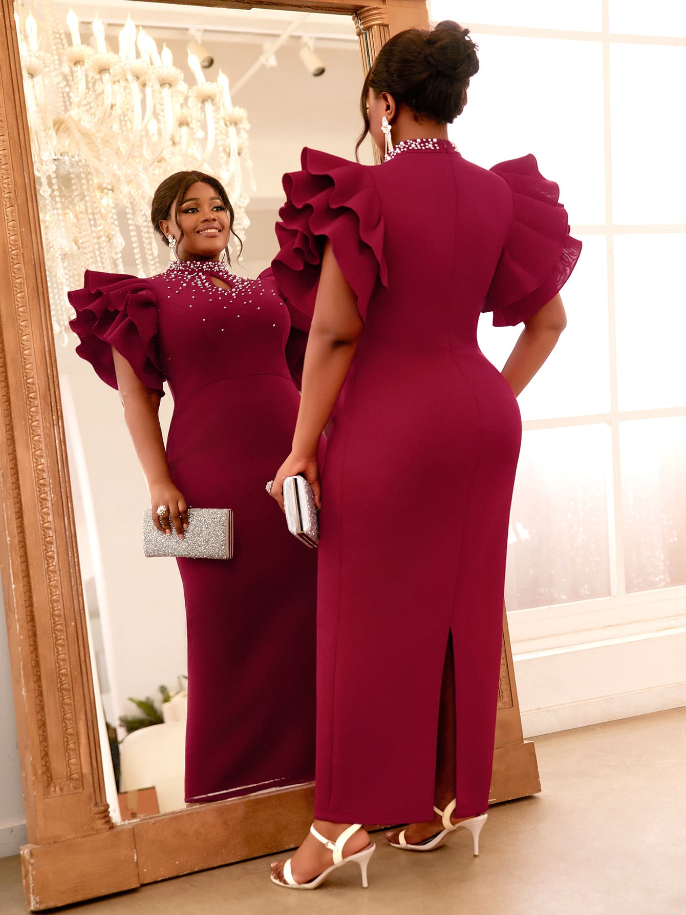 Elegant Mock Neck Beaded Ruffles Sleeveless Ankle Length Dresses for Ladies