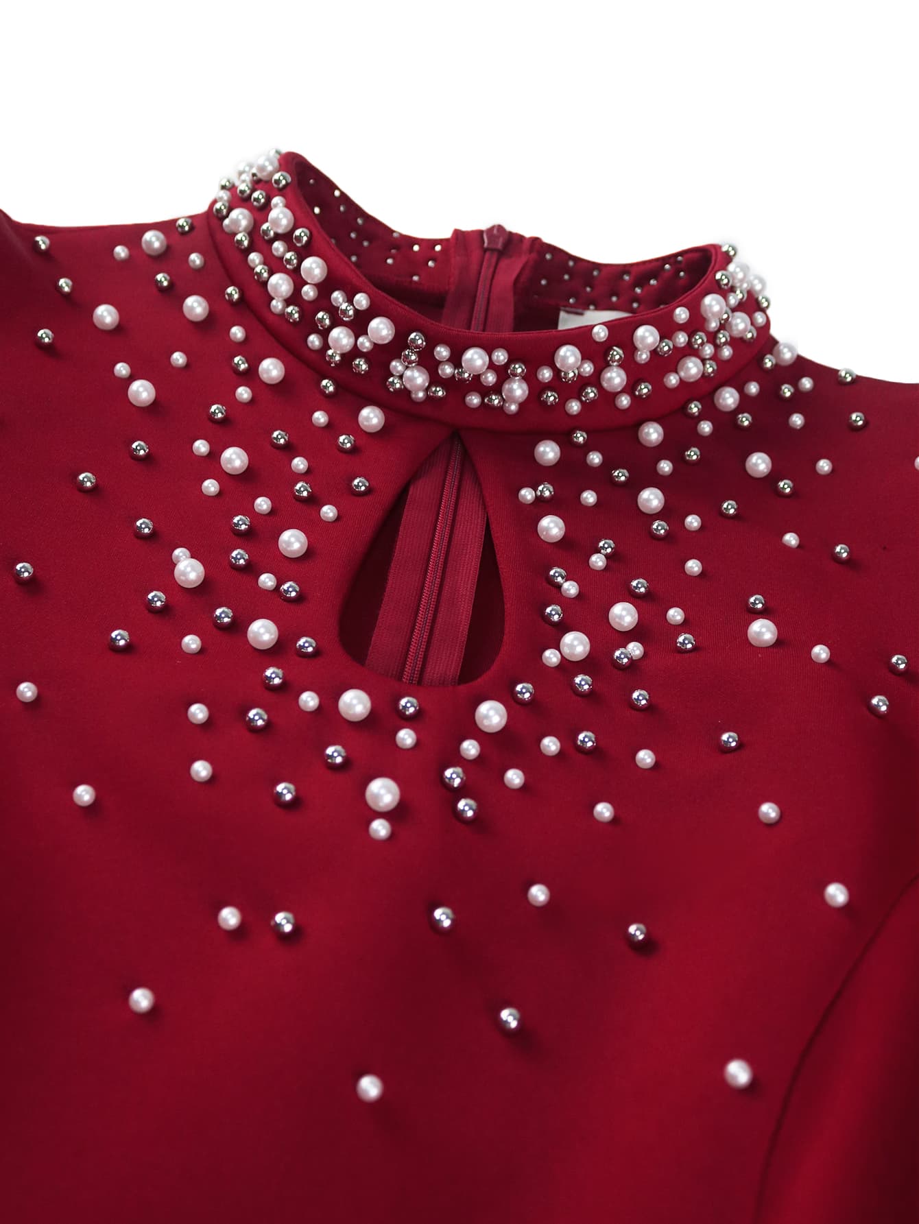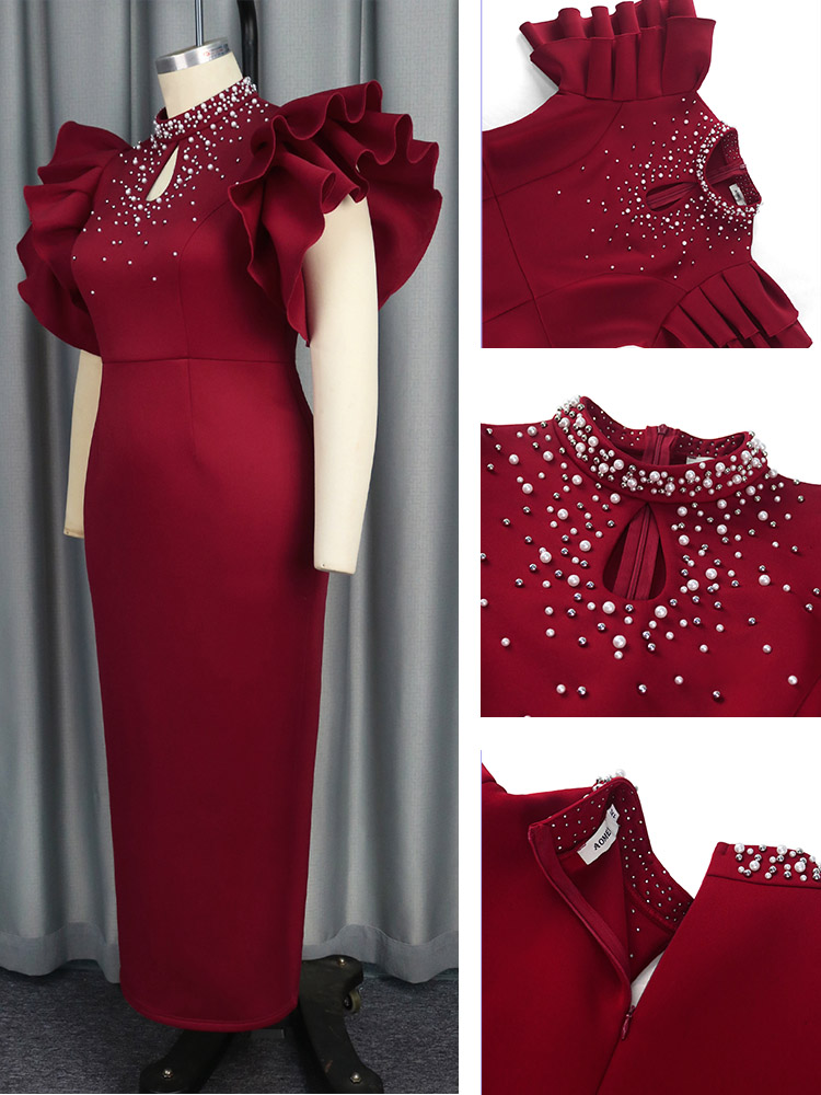 Dress Style:half high neck,cut out,beaded workmanship,sleeveless,ruffles,bodycon ankle length,slit,invisible zipper,sheath dress.
