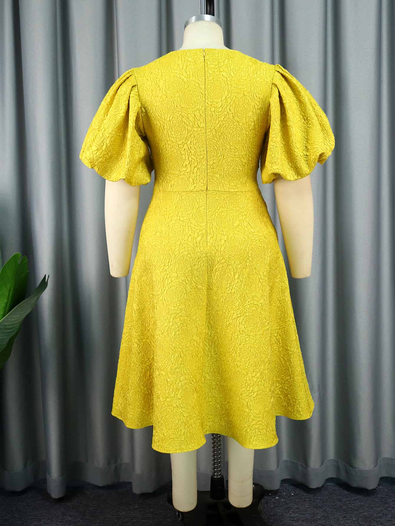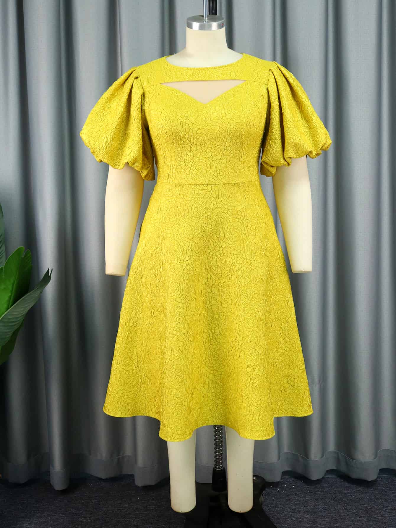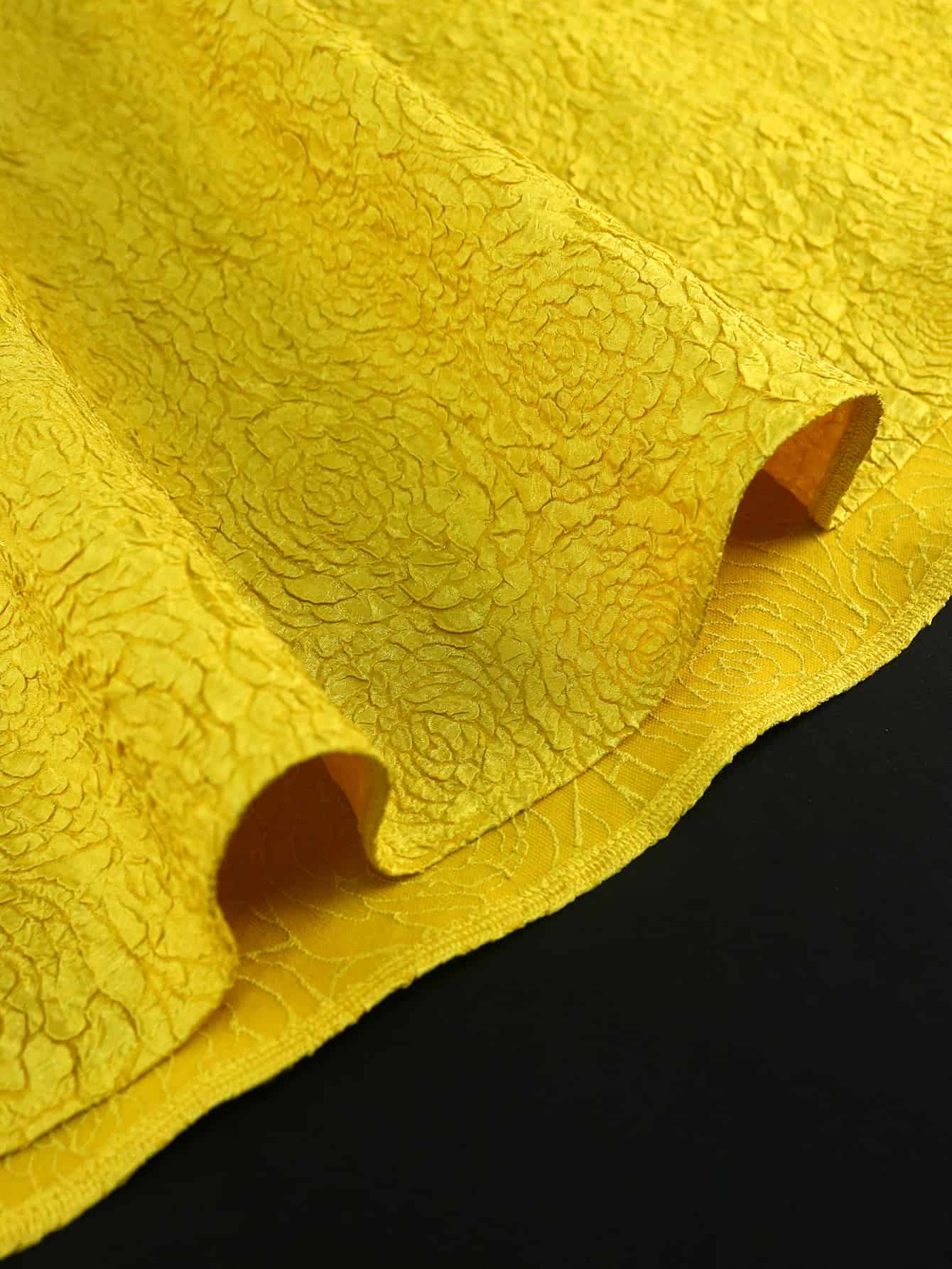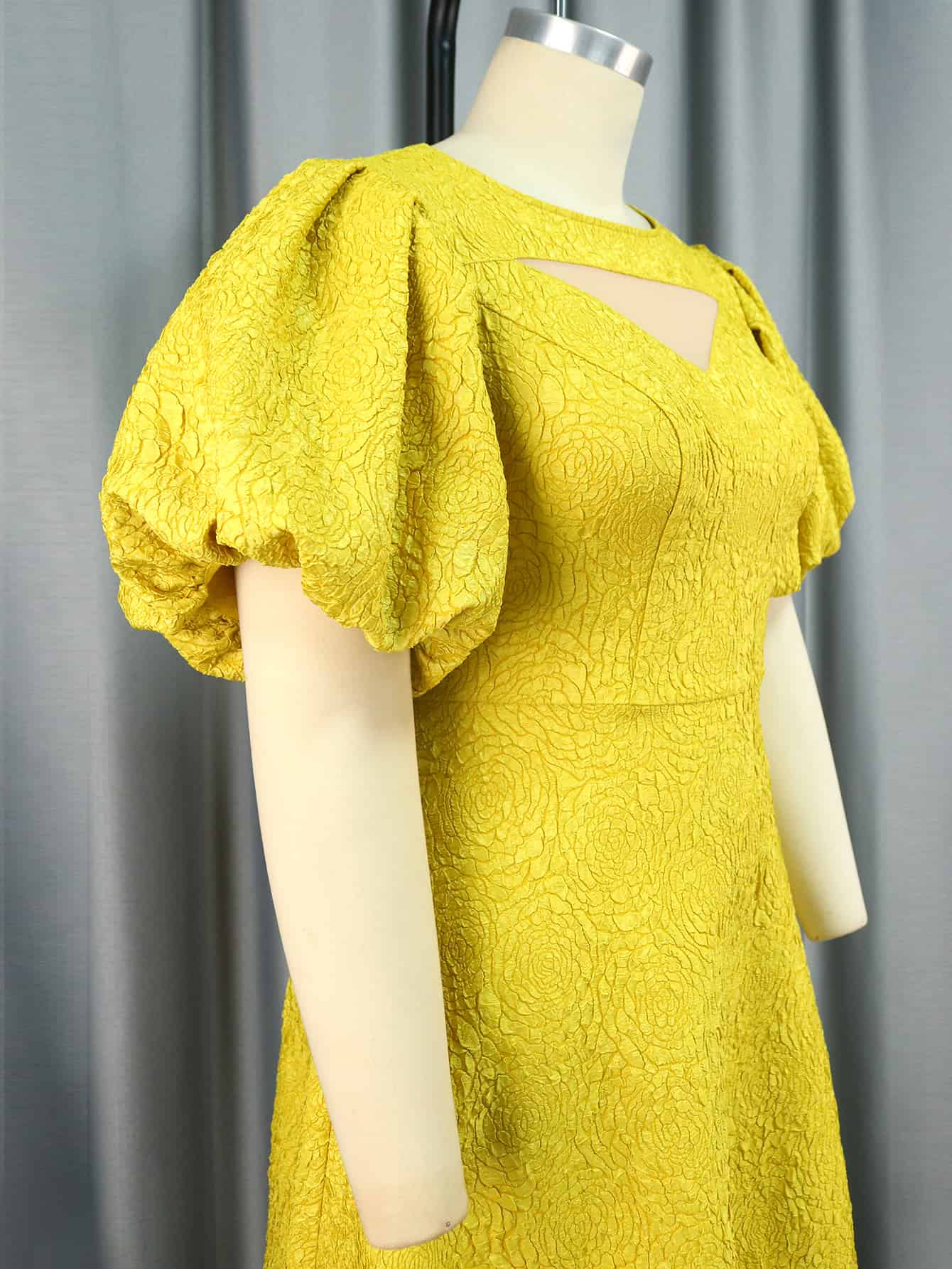 Yellow Big Rose Jacquard Dress with Some Stretchy,A Cut Out Tulle Design Make the Dress Elegant and Chic.