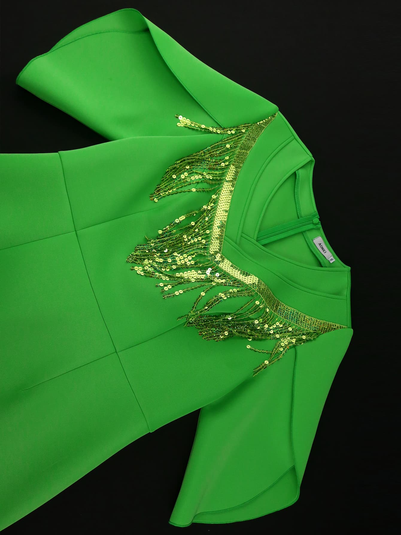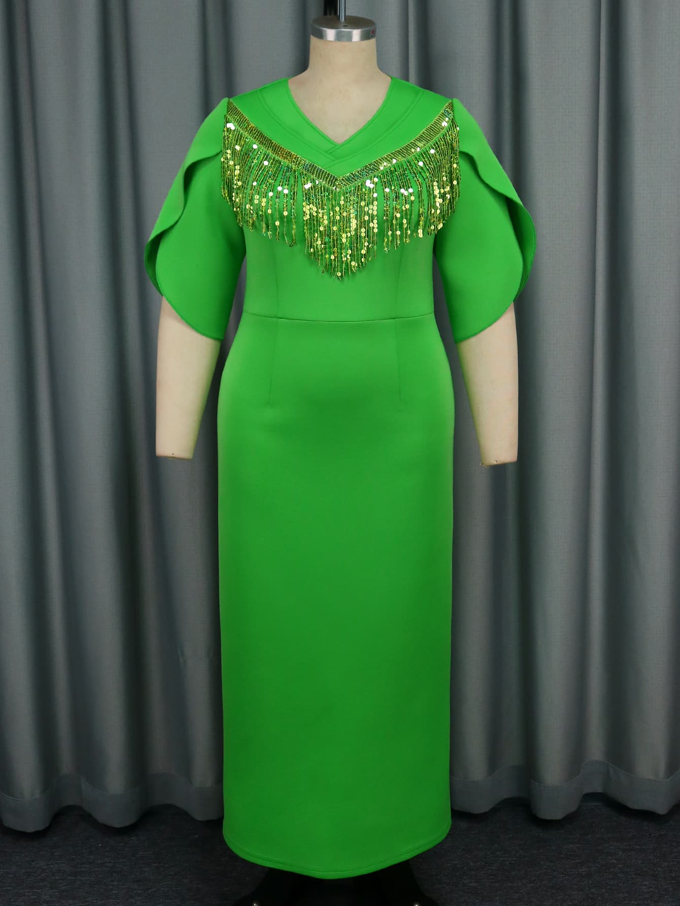 Dress Style: V-neck, green, short sleeved, tassel decoration, medium elasticity, ankle length dress