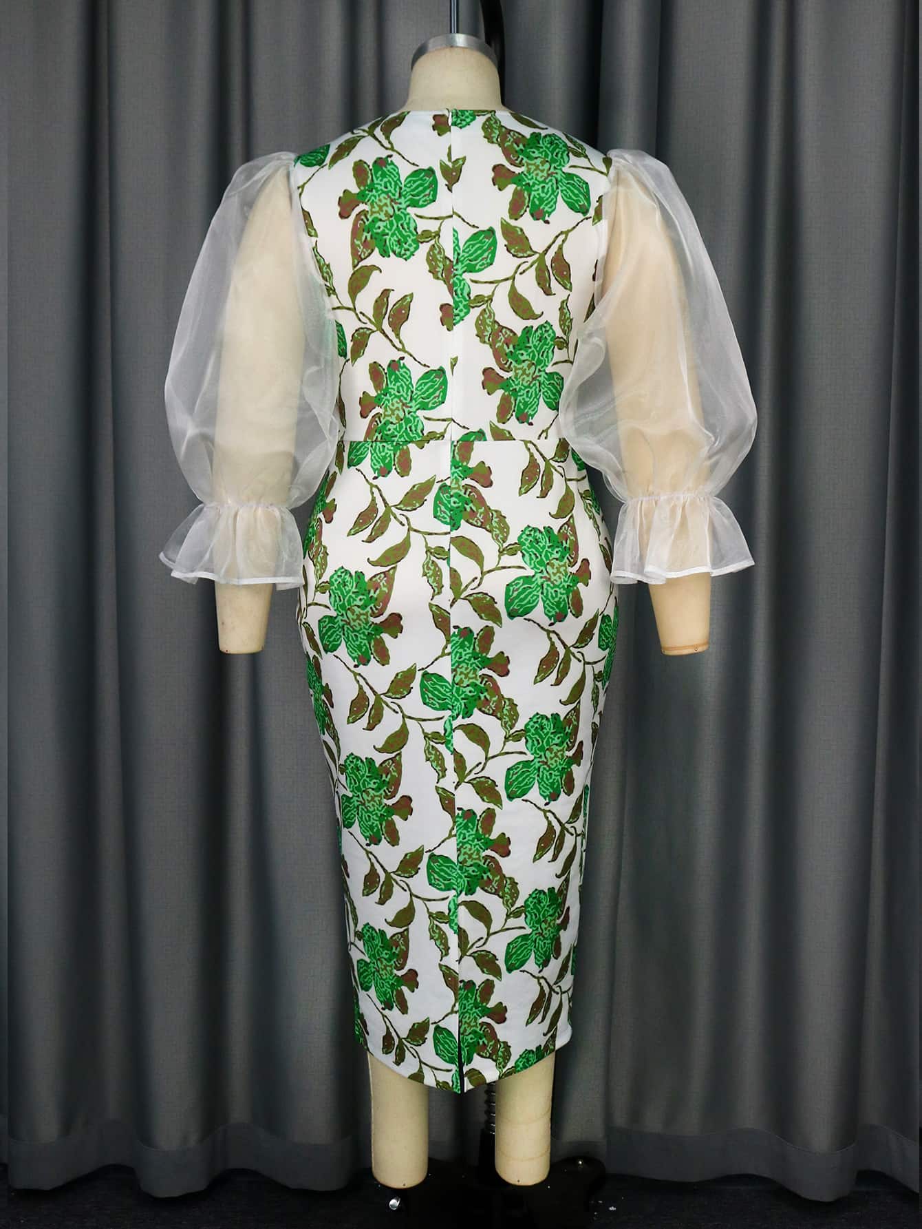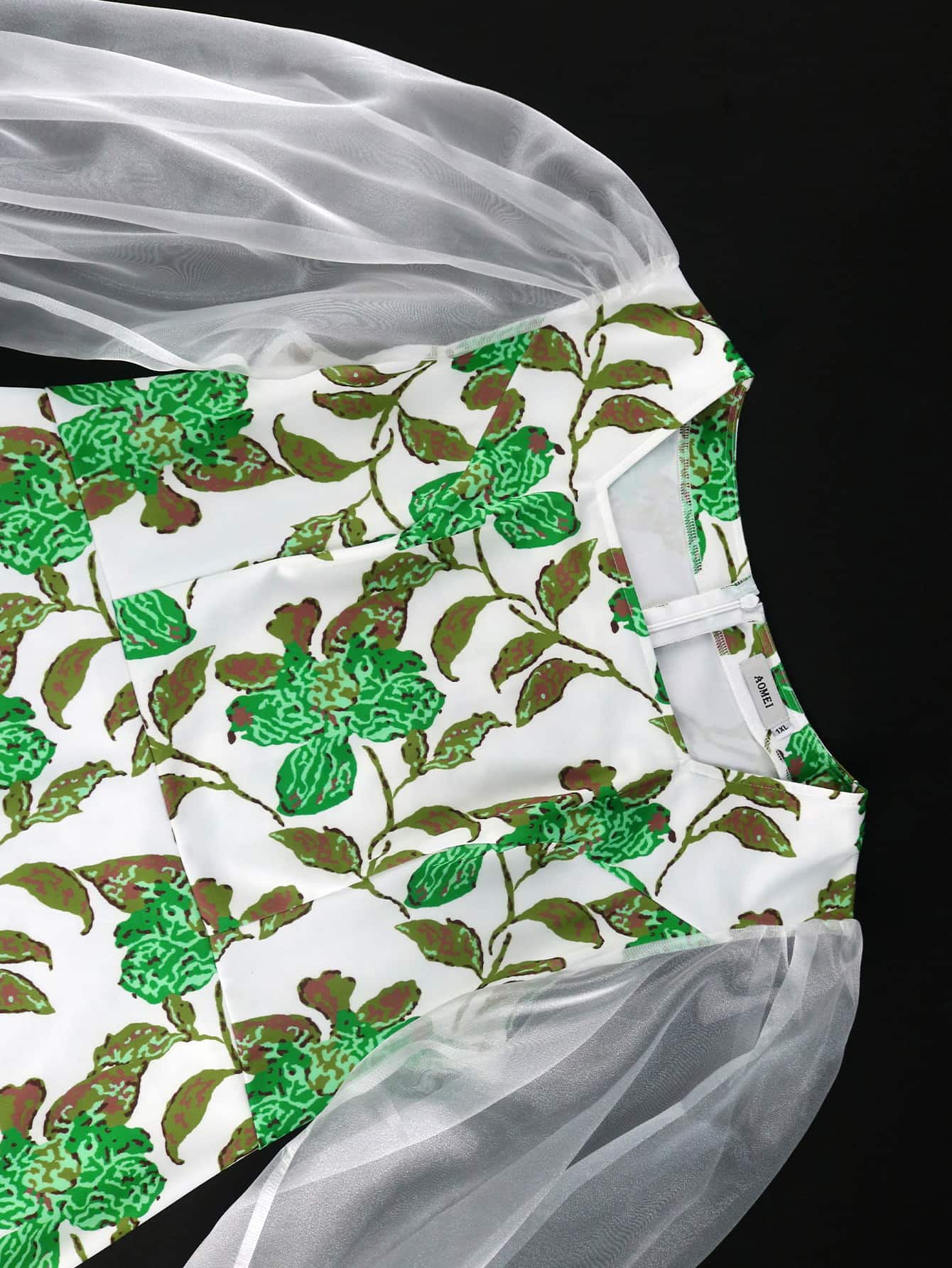 Dress Style: Green print, fresh, bubble sleeves, semi transparent, invisible zipper, Maxi dress