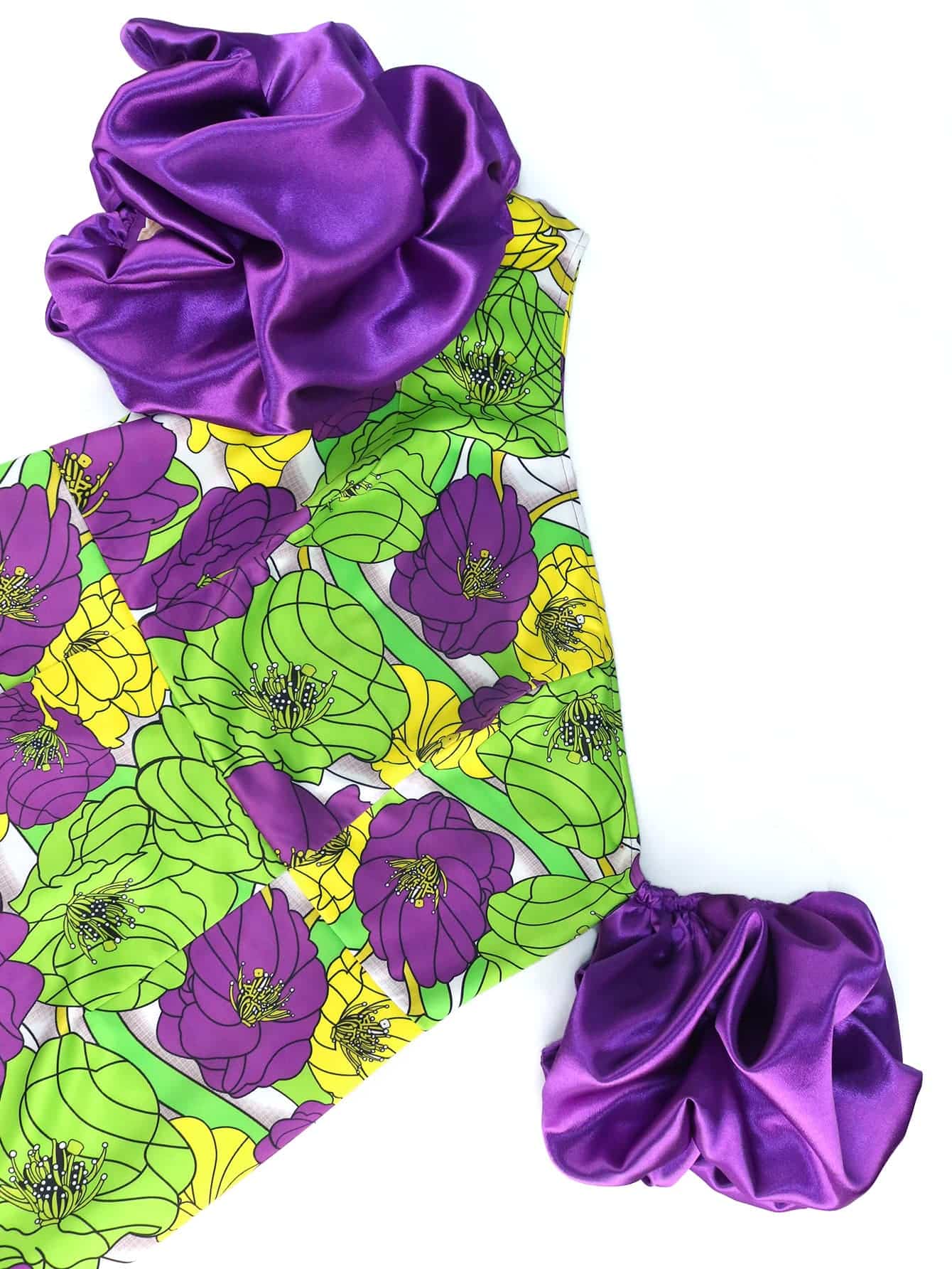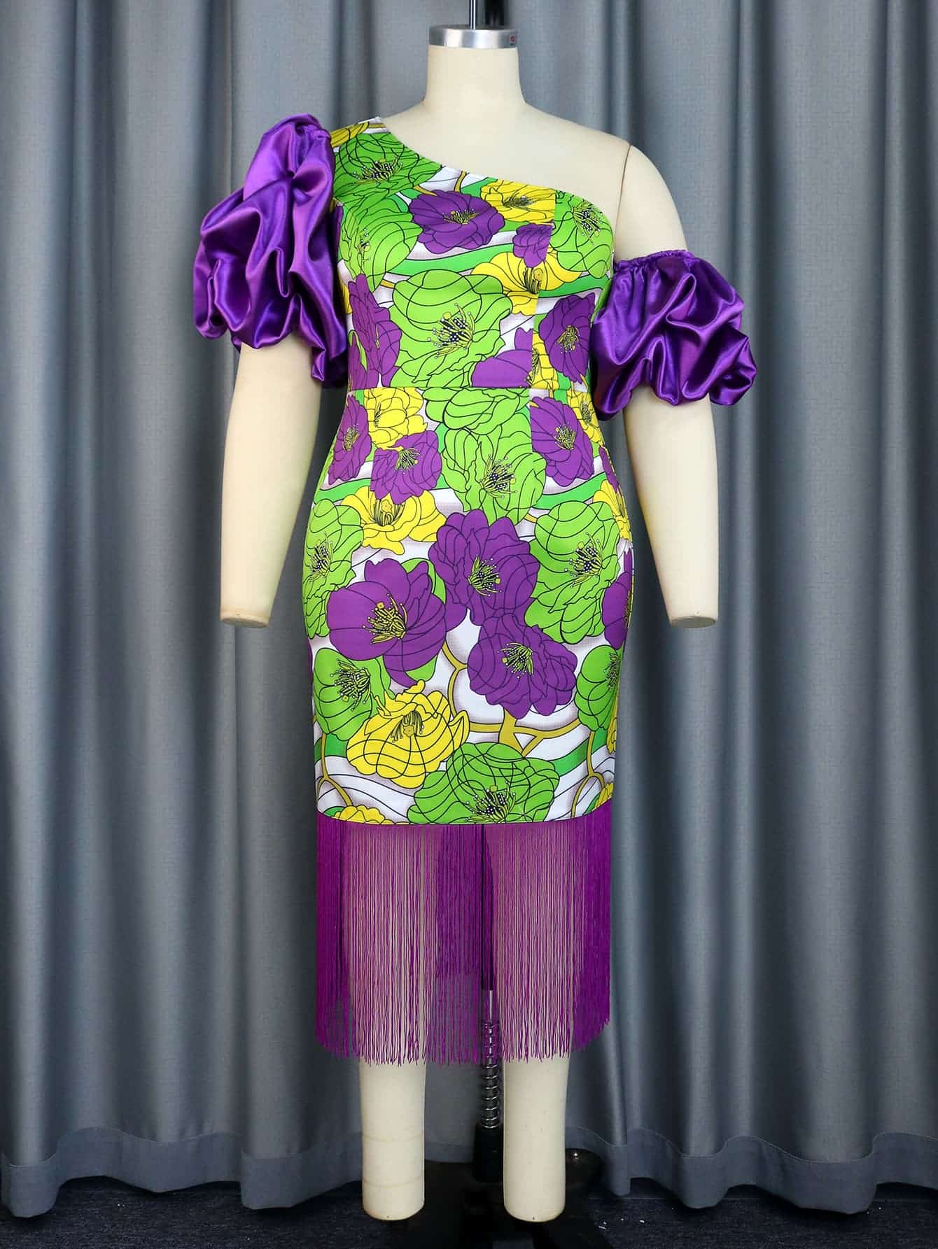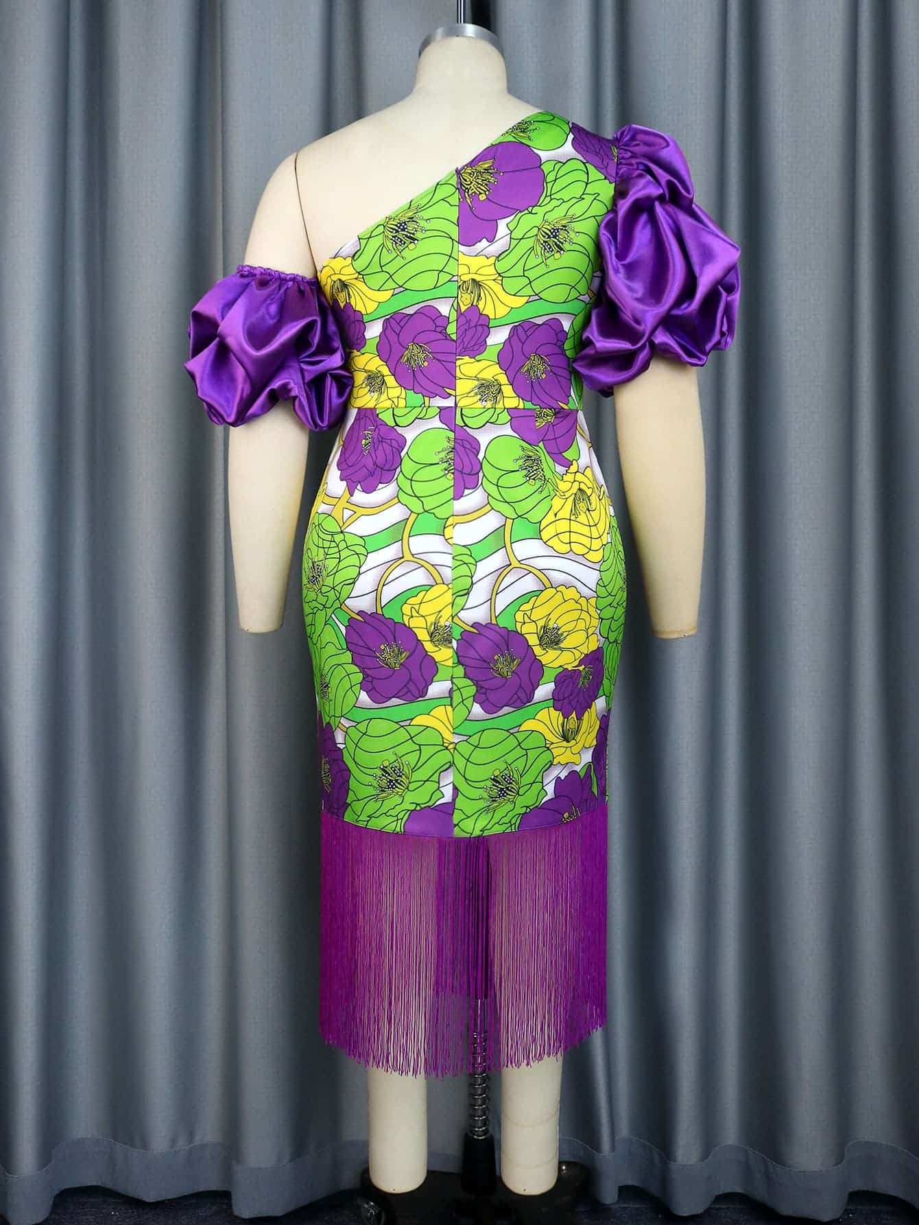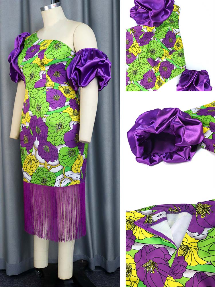 Styles:Patchwork cold shoulder short puff sleeve high waist floral bodycon fringe dresses
