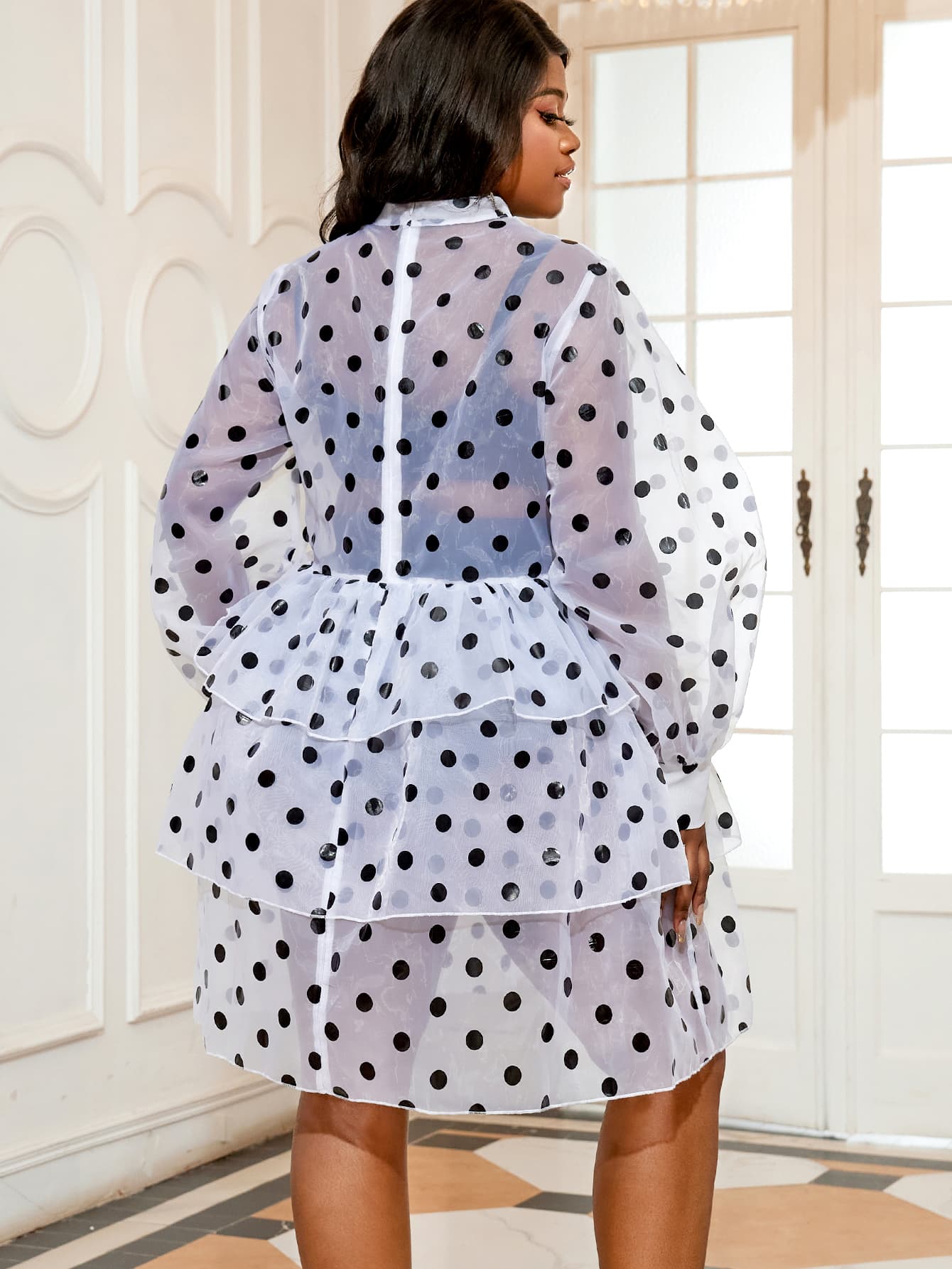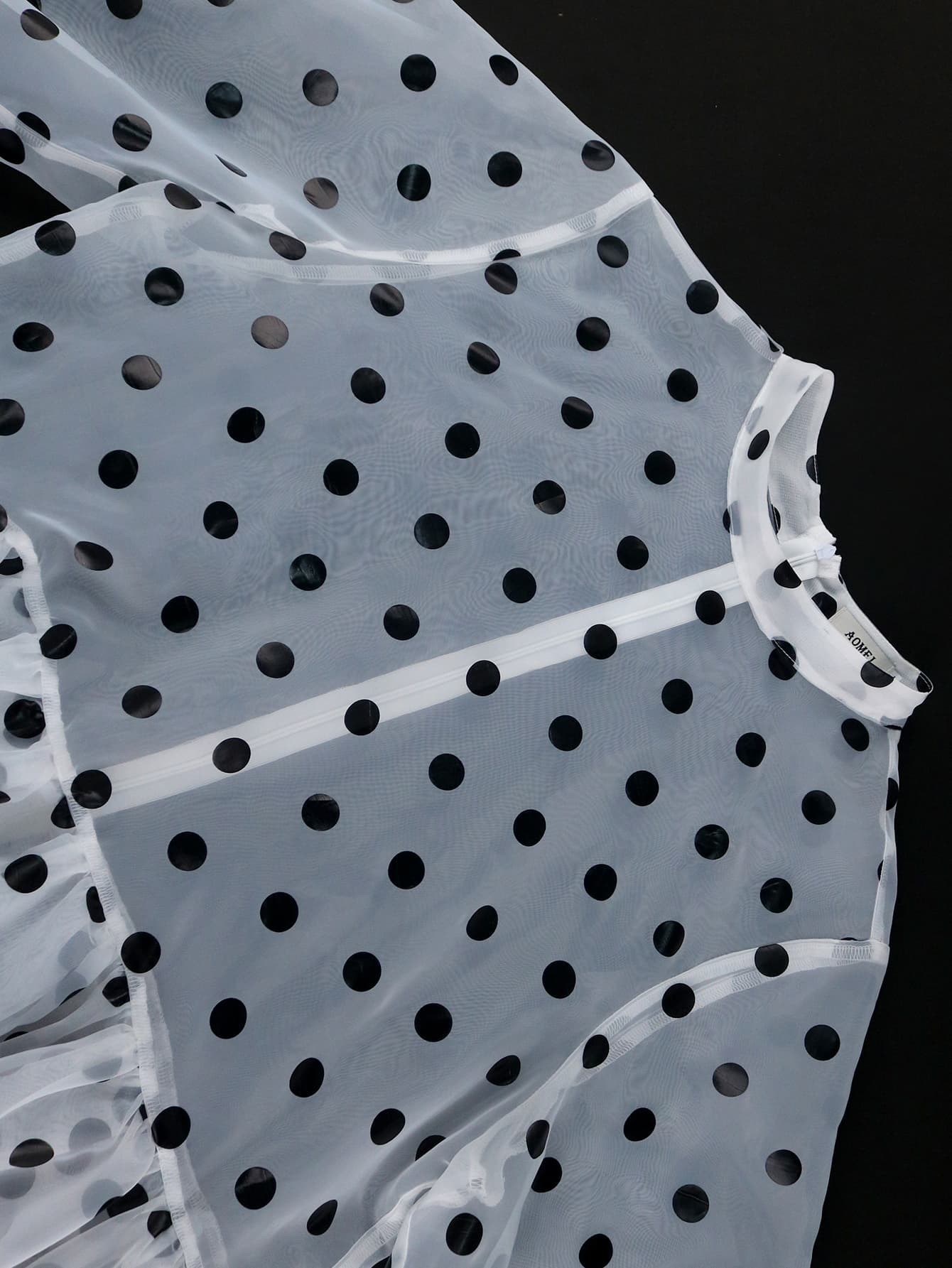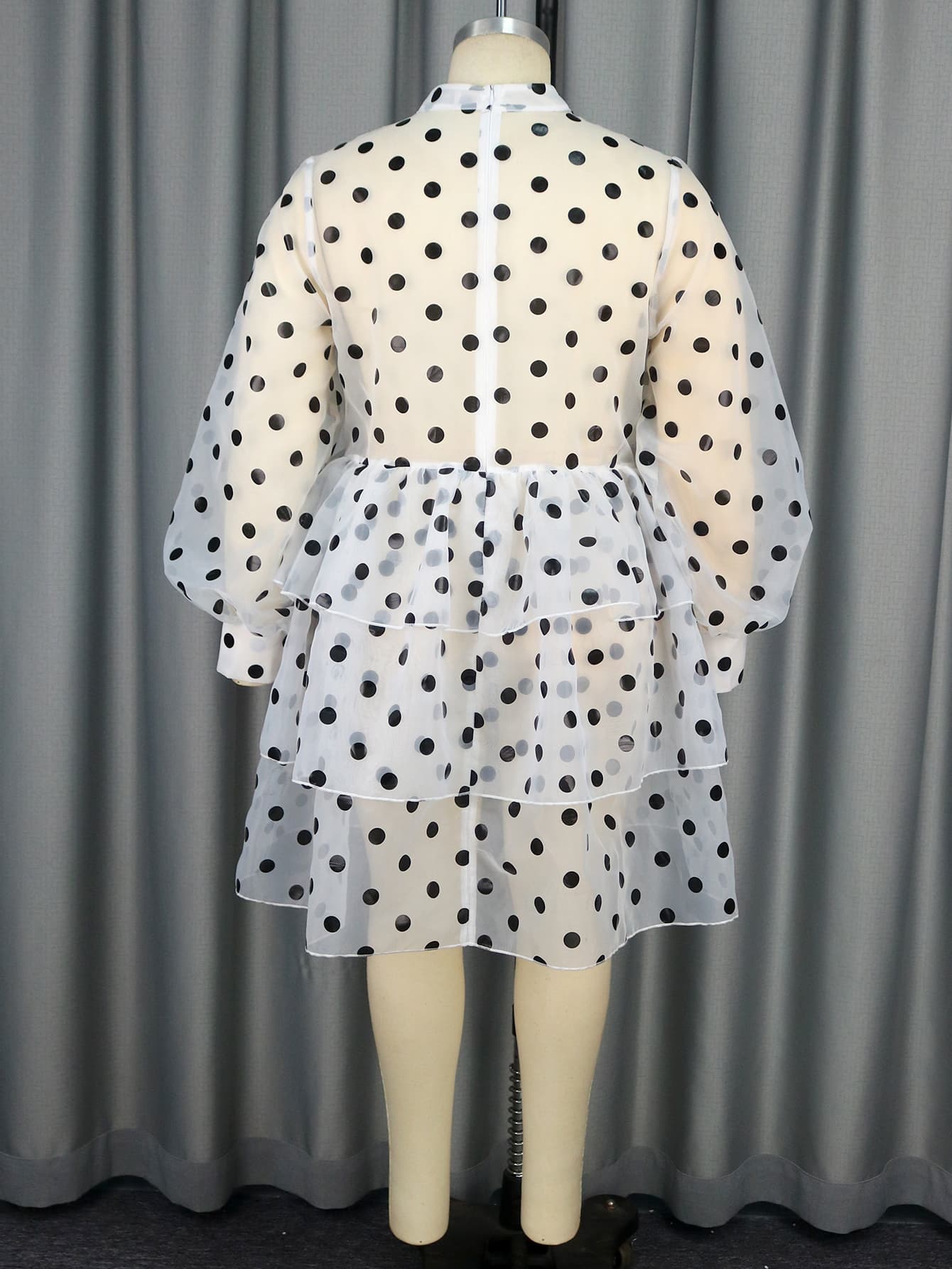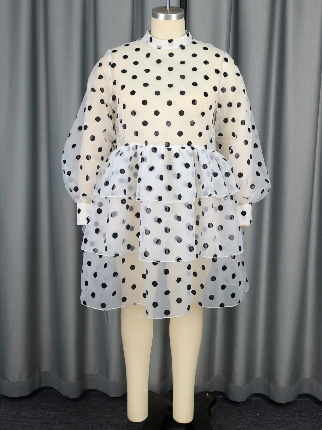 Step into elegance with our High-Neck Organza Polka Dot A-Line Layered Ruffle Dress, a perfect blend of vintage charm and modern style. This dress features a sophisticated semi-high neckline and sheer organza fabric adorned with playful polka dots, creating a beautifully delicate look.