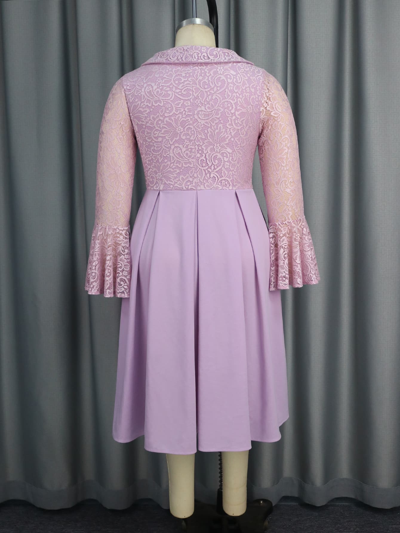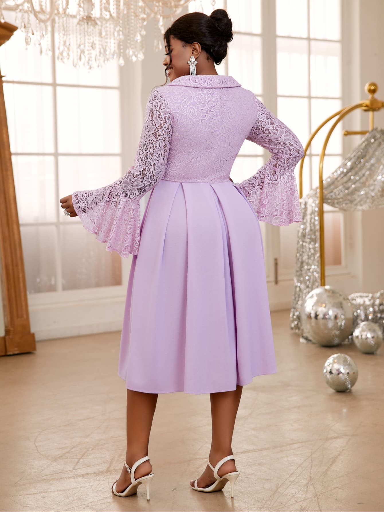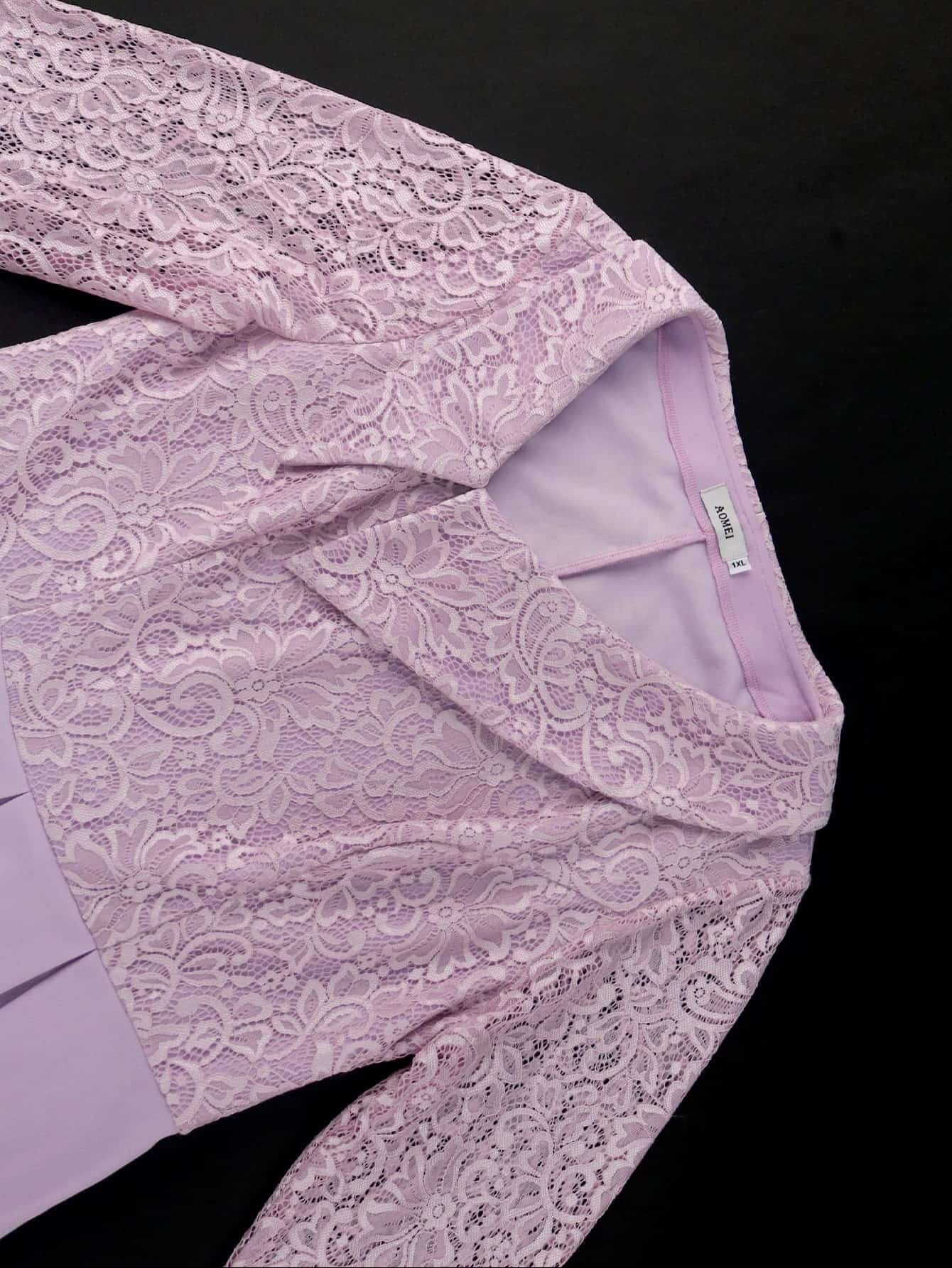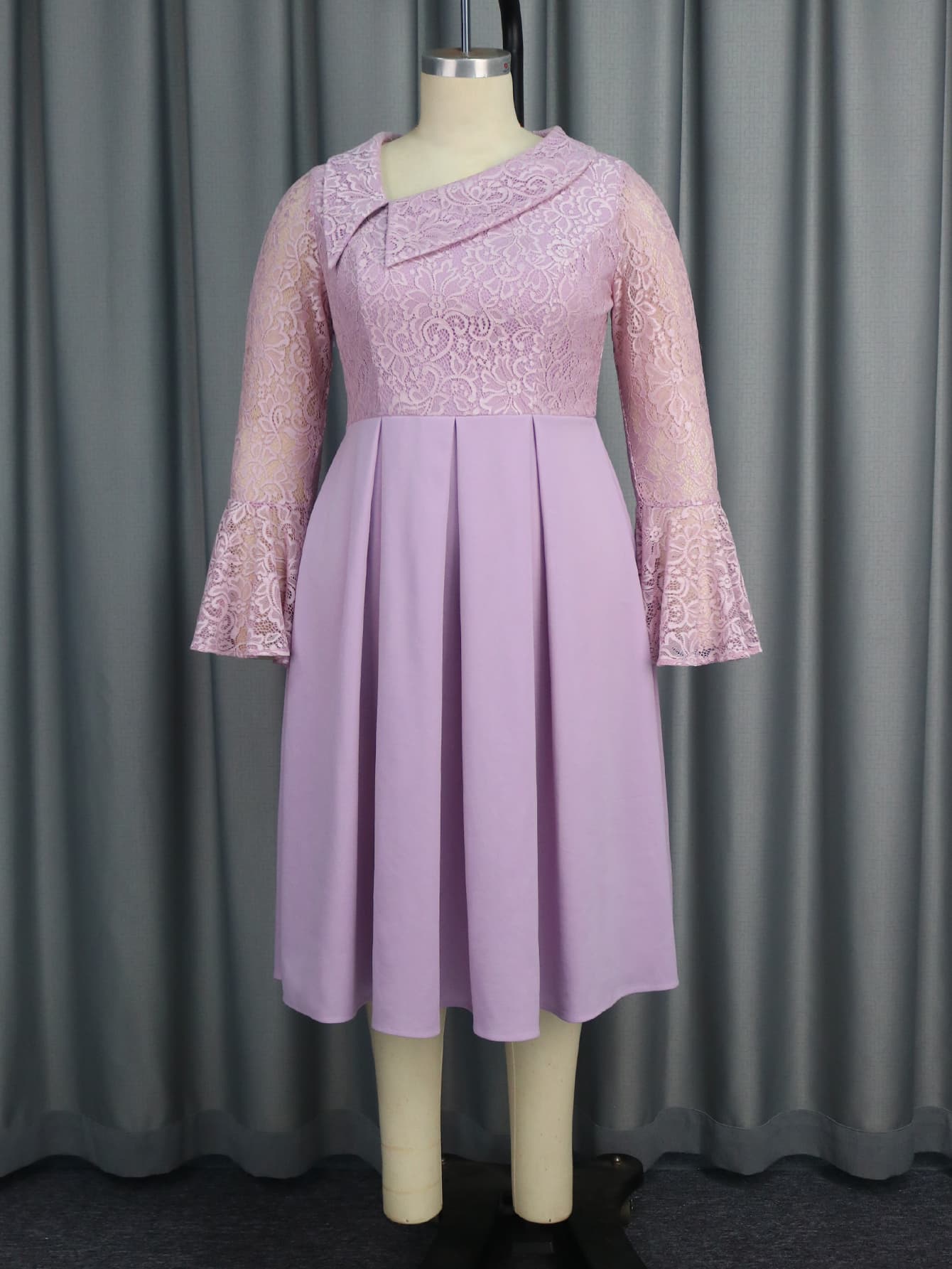 The lace fabric adds a delicate and feminine touch, enhancing the dress's overall elegance. The sheer lace offers a subtle yet alluring glimpse of skin, creating a romantic and refined appearance.Slant neck lavender lace dresses.