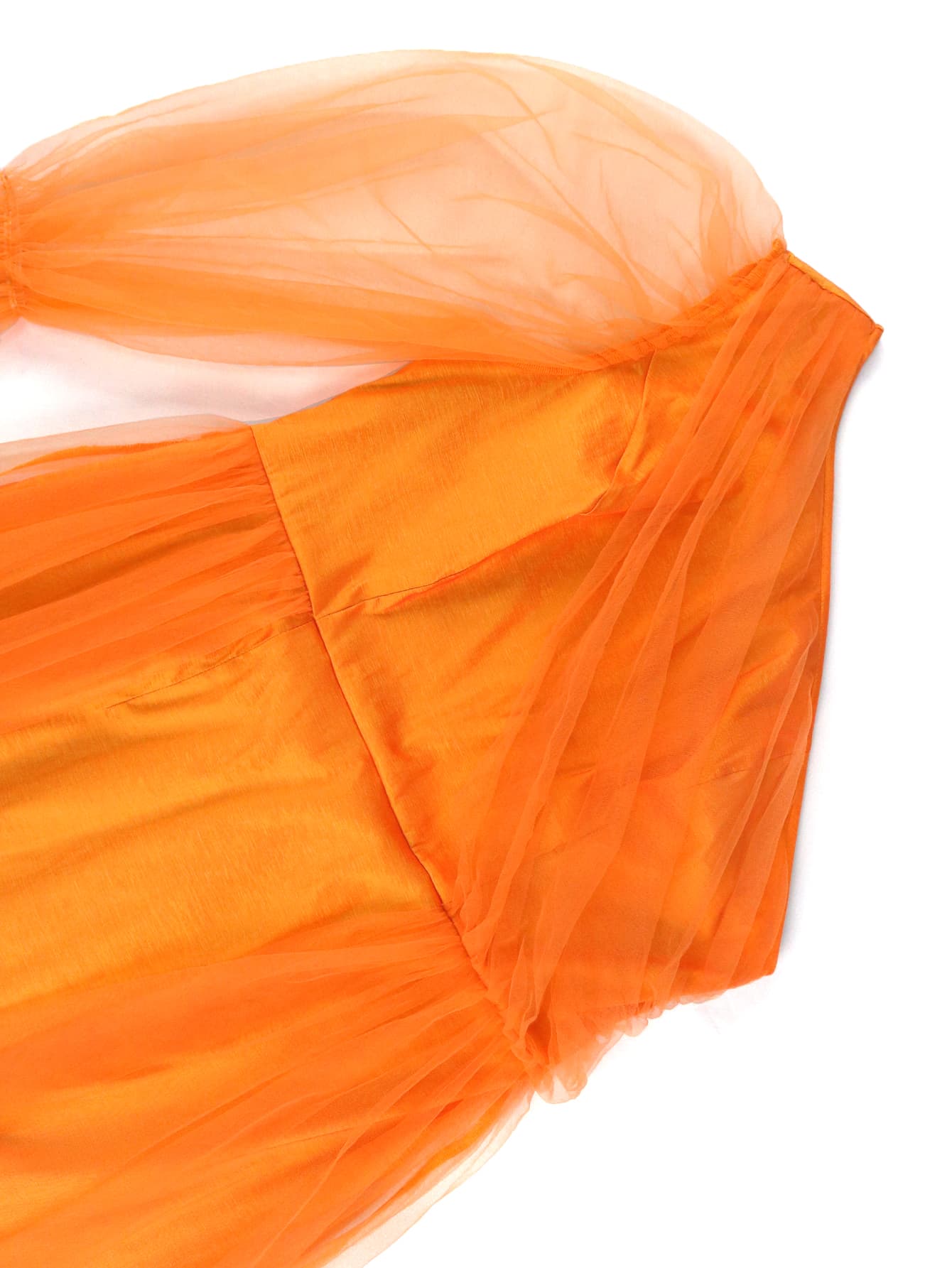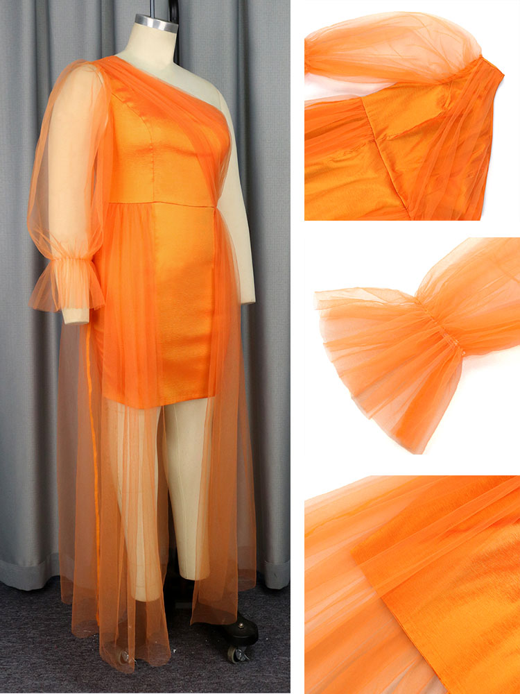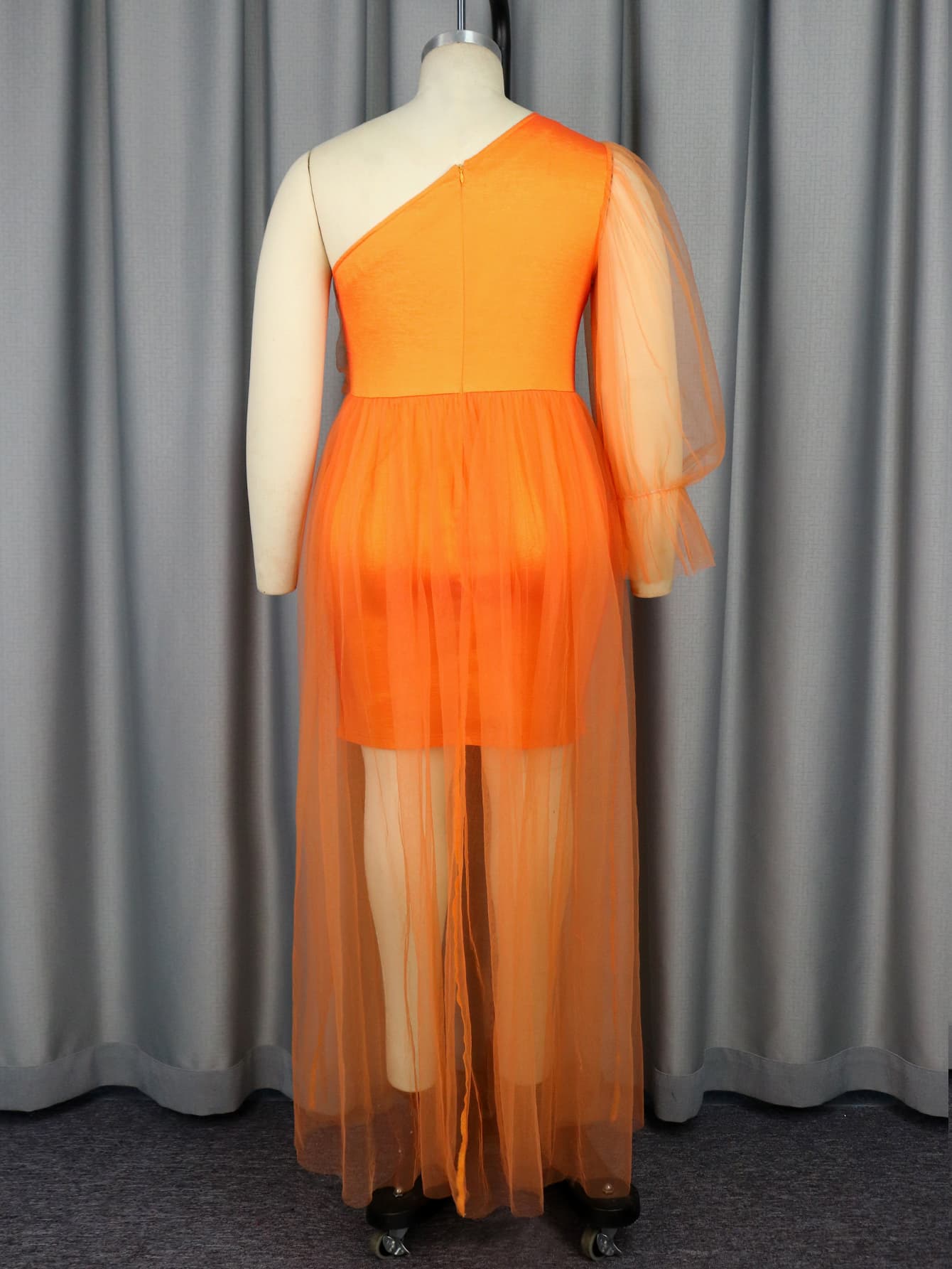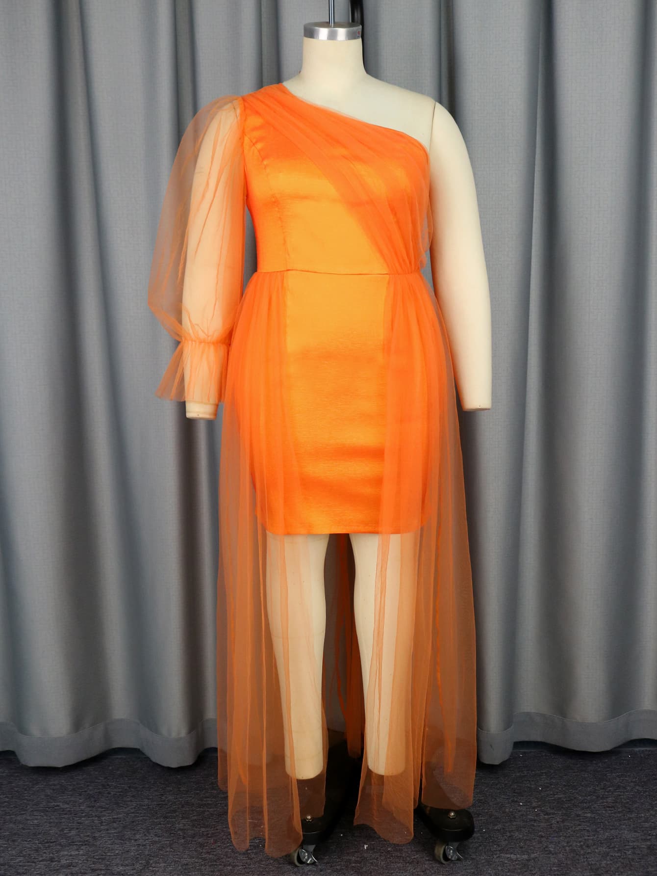 One Shoulder Long Tulle Sleeve High Waist Zipper Mesh Patchwork High Low Design Dress