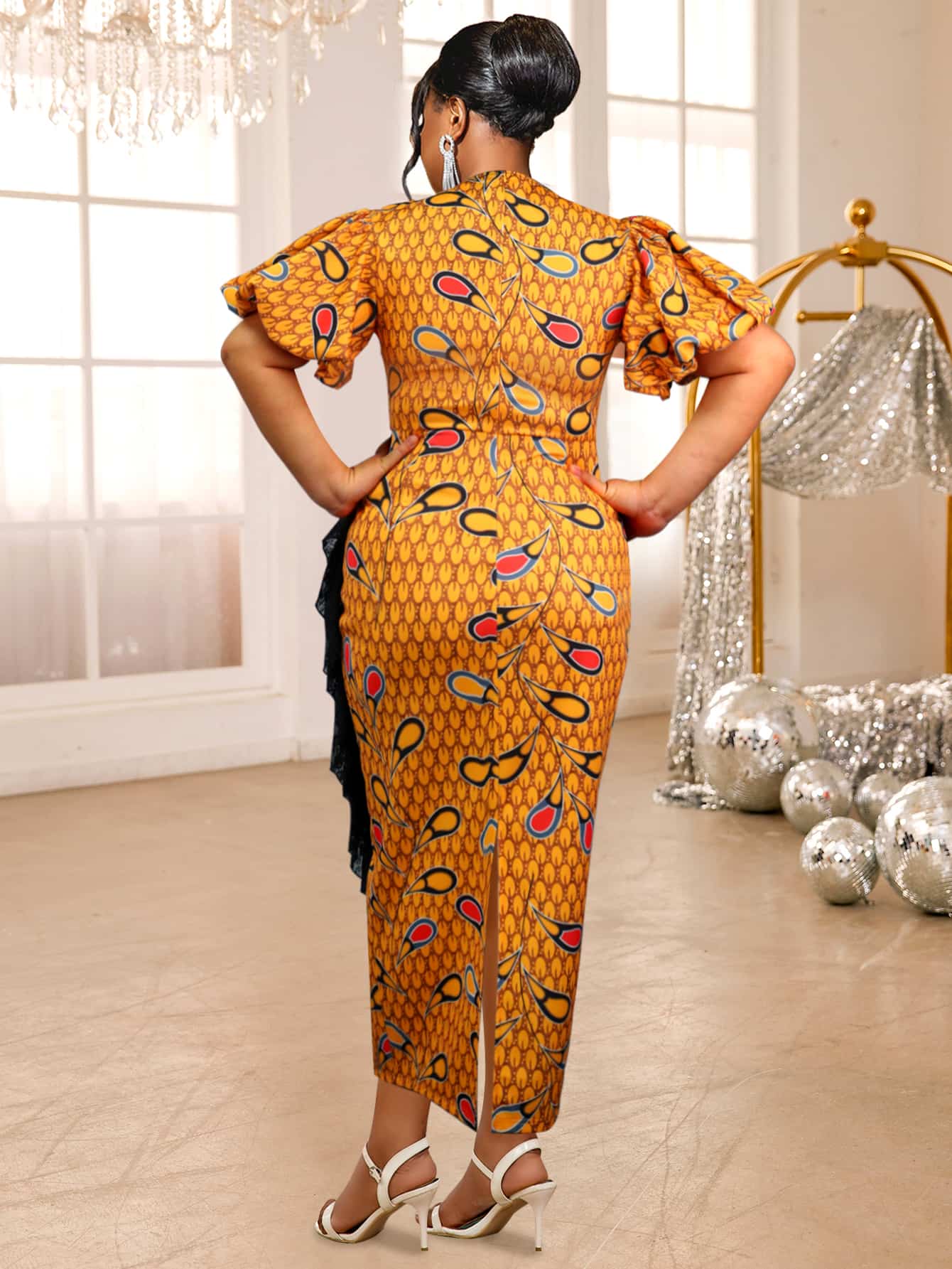 This stunning maxi dress combines elegance and style, perfect for church gatherings, parties, or any special occasion. Crafted in a refined black print, this dress features delicate mesh ruffle patchwork that adds a luxurious texture, enhancing its classic charm.