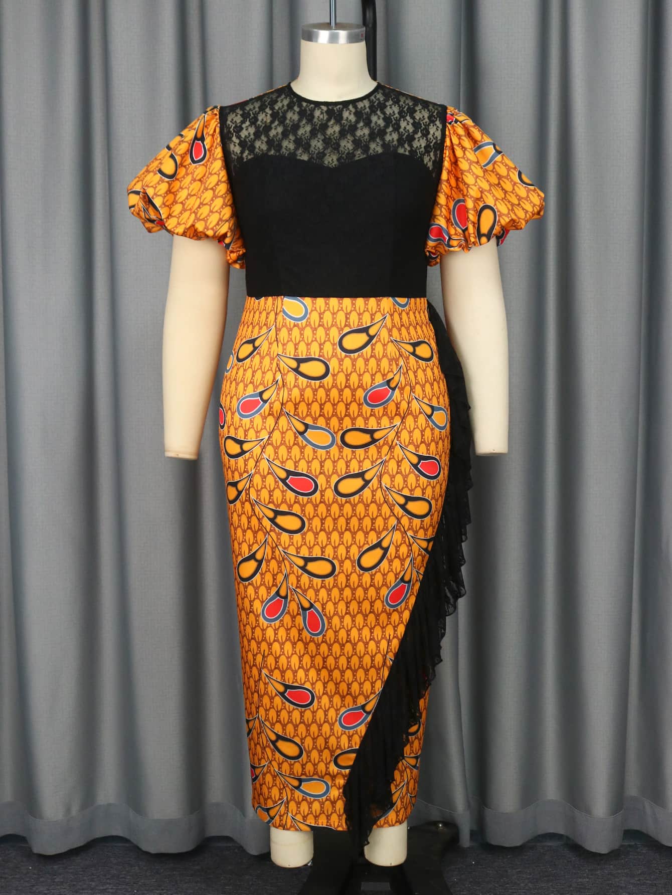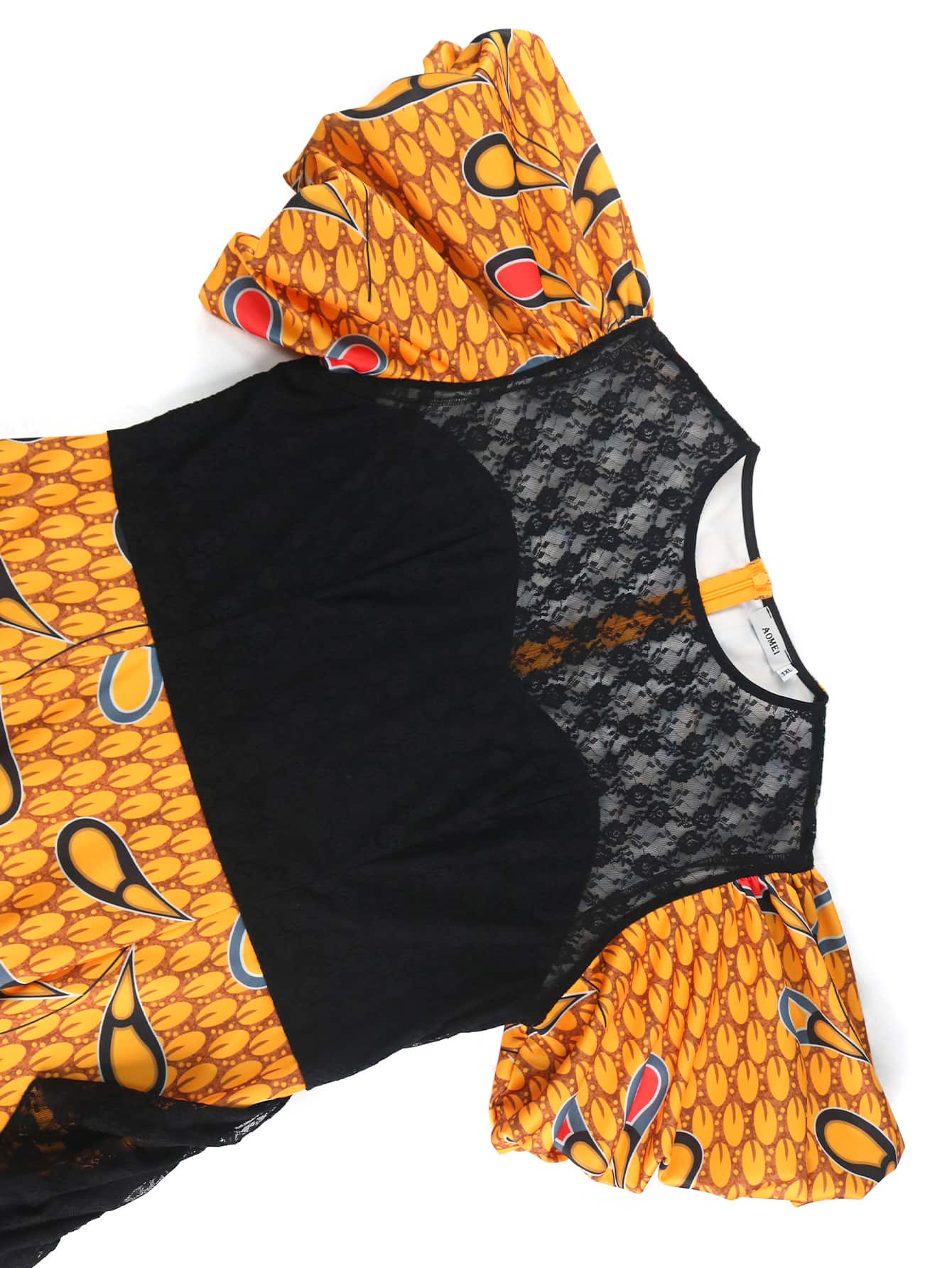 Lace Patchwork Puff Sleeve High Waist Printed Dresses Custom Made Factory