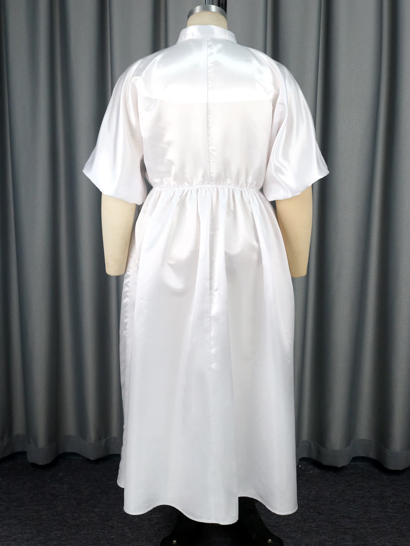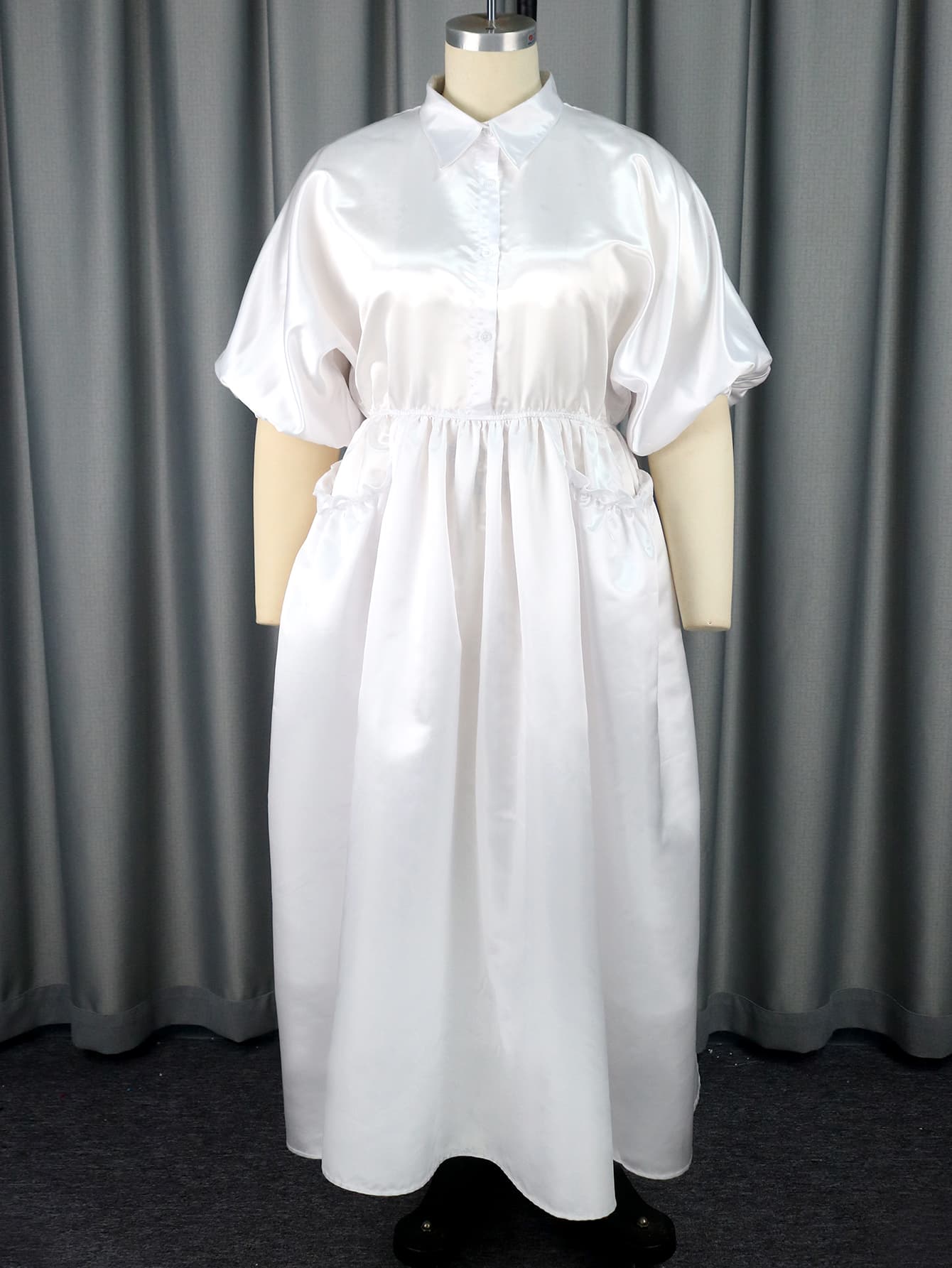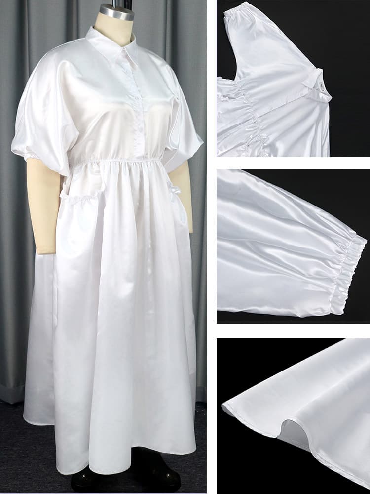 Styles: shiny satin,turn down collar,button up,pullover,half sleeve,loose,high elastic waist,a shape,ankle length office work causal long dress