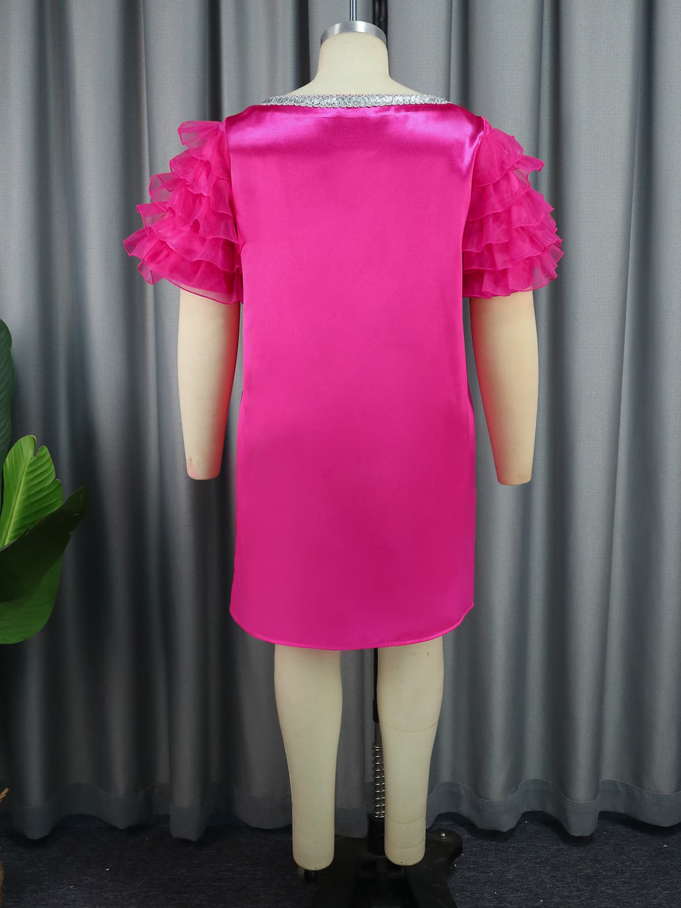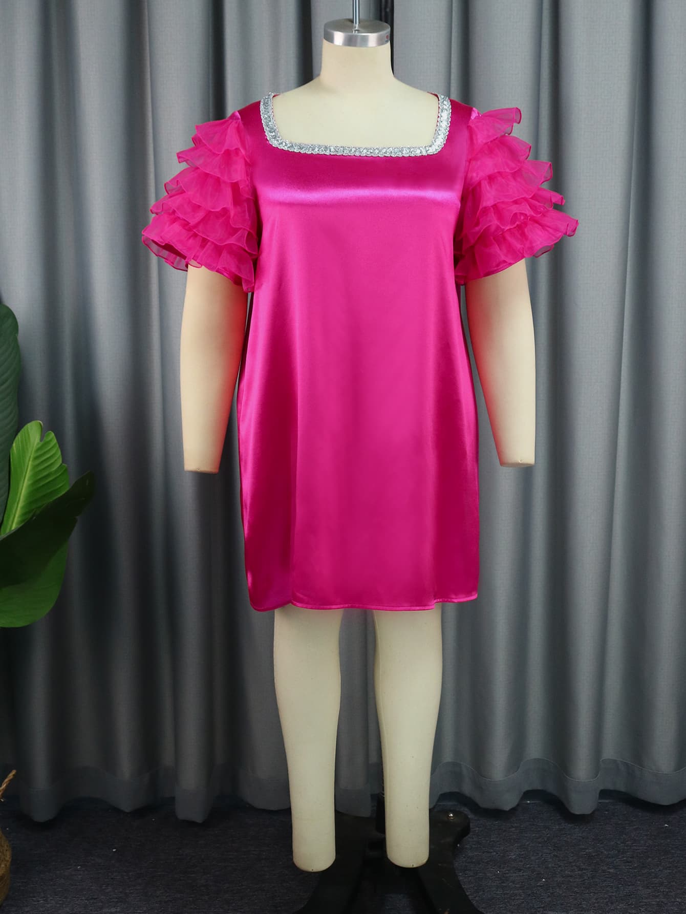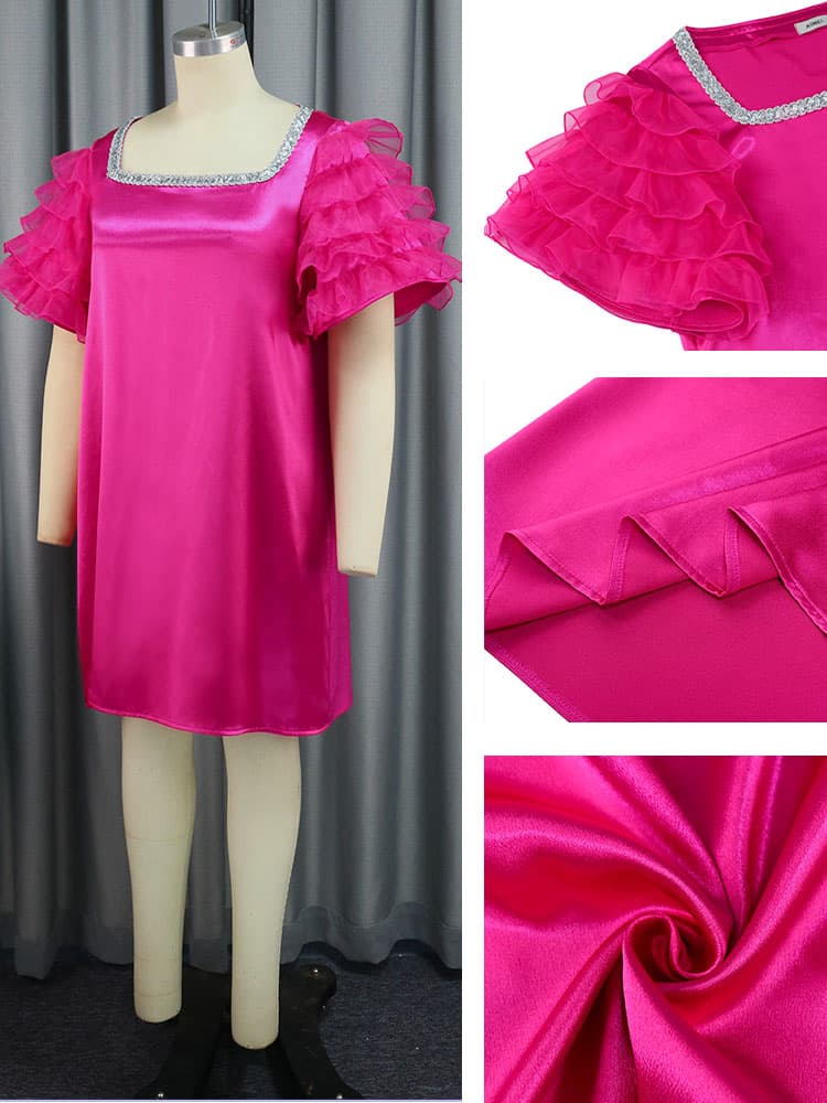 Styles: square neck,short sleeve,ruffles sleeve,loose,shiny,pullover satin knee length dress