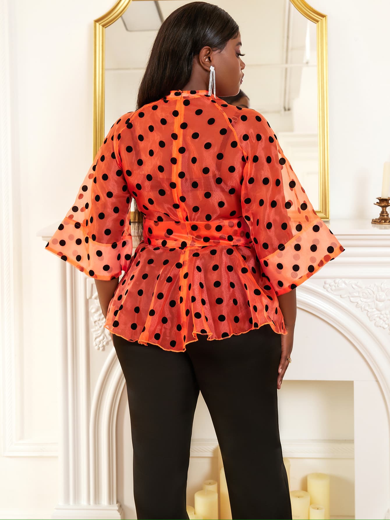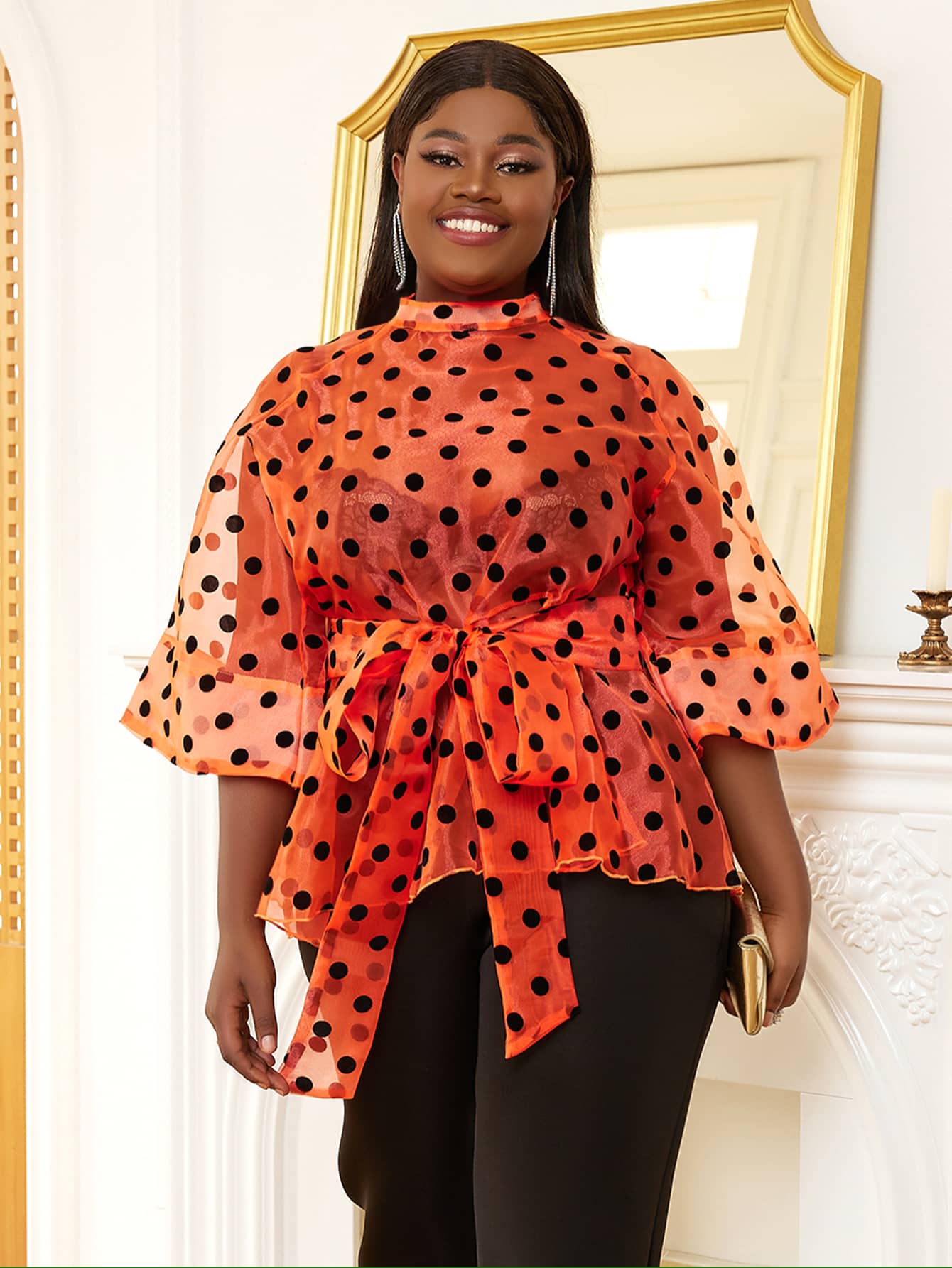 This stylish top features a semi-high neckline and playful polka dot detailing on soft, sheer organza fabric, perfect for both daily wear and special occasions. The mid-length flared sleeves add a graceful touch, bringing a flowy, feminine feel to the design.