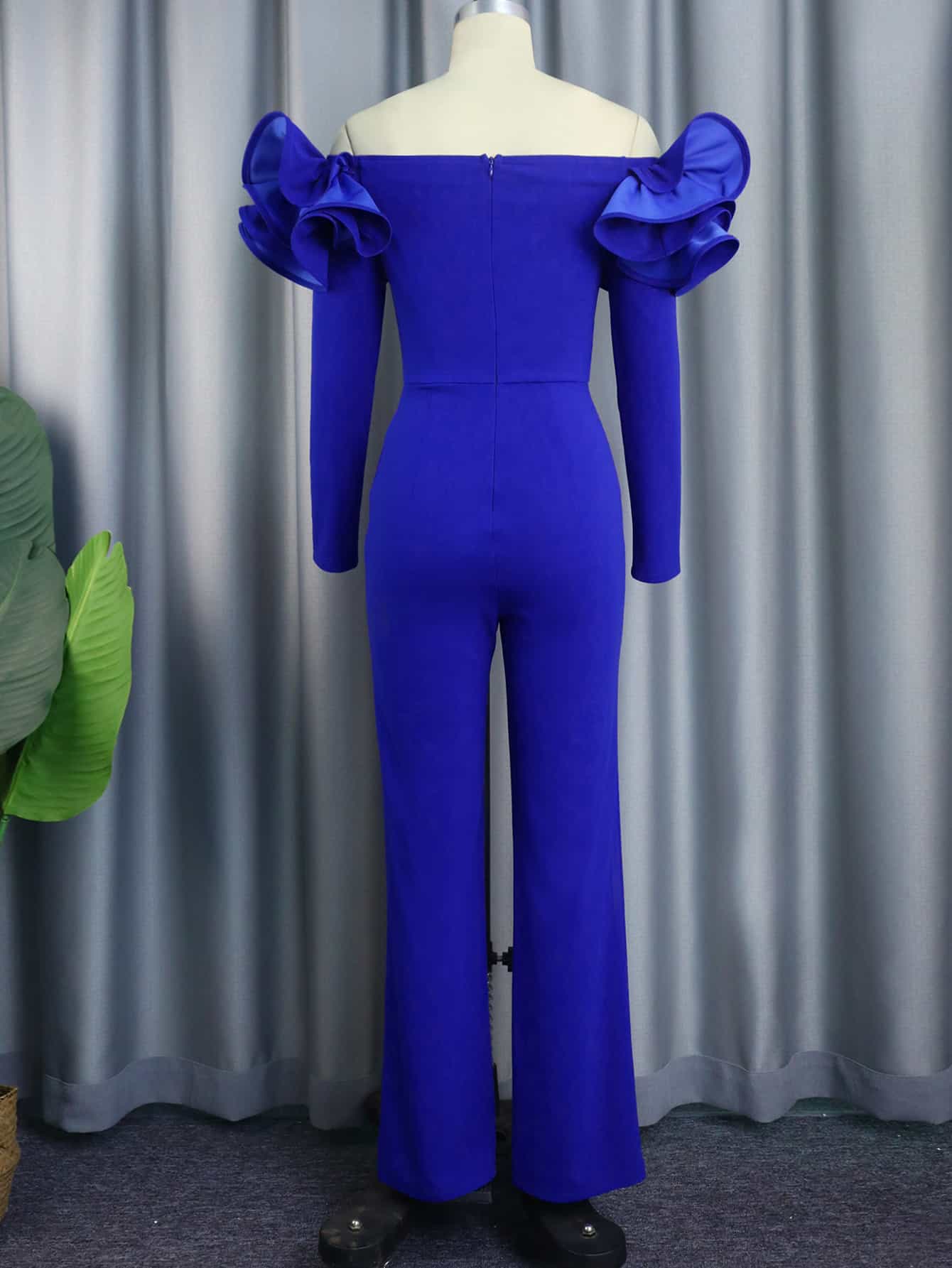 Make a statement with our Off-the-Shoulder Blue Ruffle High-Waist Party Jumpsuit, designed to turn heads at any event. This stunning jumpsuit features an elegant off-the-shoulder neckline adorned with playful ruffle details, adding a touch of femininity and flair.