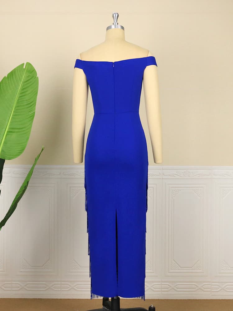 Off Shoulder Sleeveless High Waist Bodycon Layerd Fringe Hem Midi Dresses