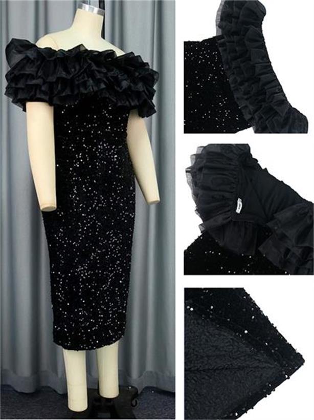 Shoulder-baring mesh tulle design glitter velvet sequins sheath midi evening event banquets for ladies.