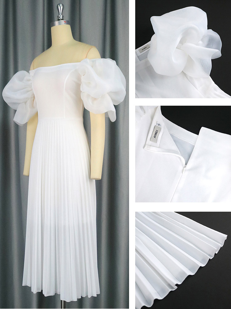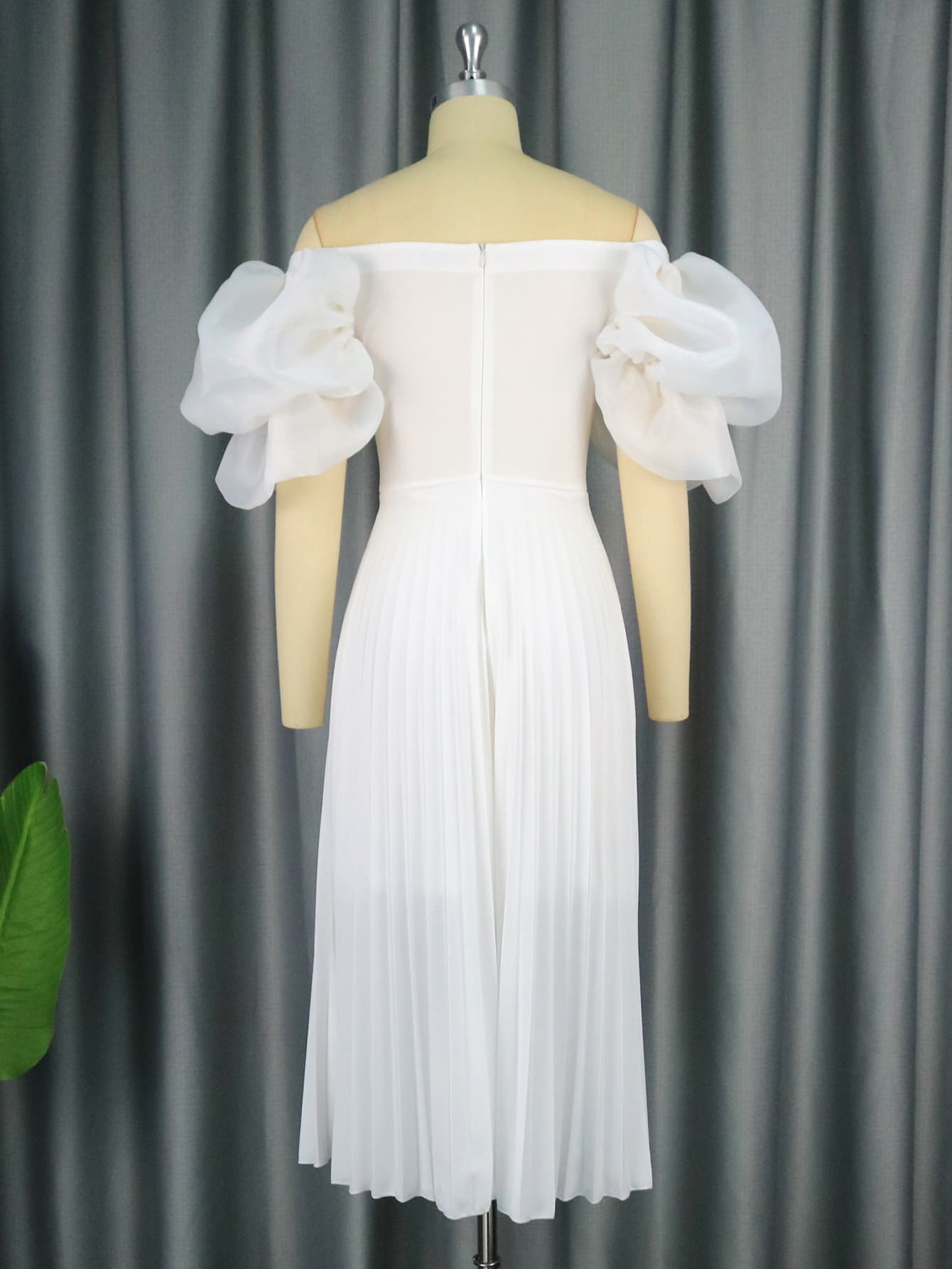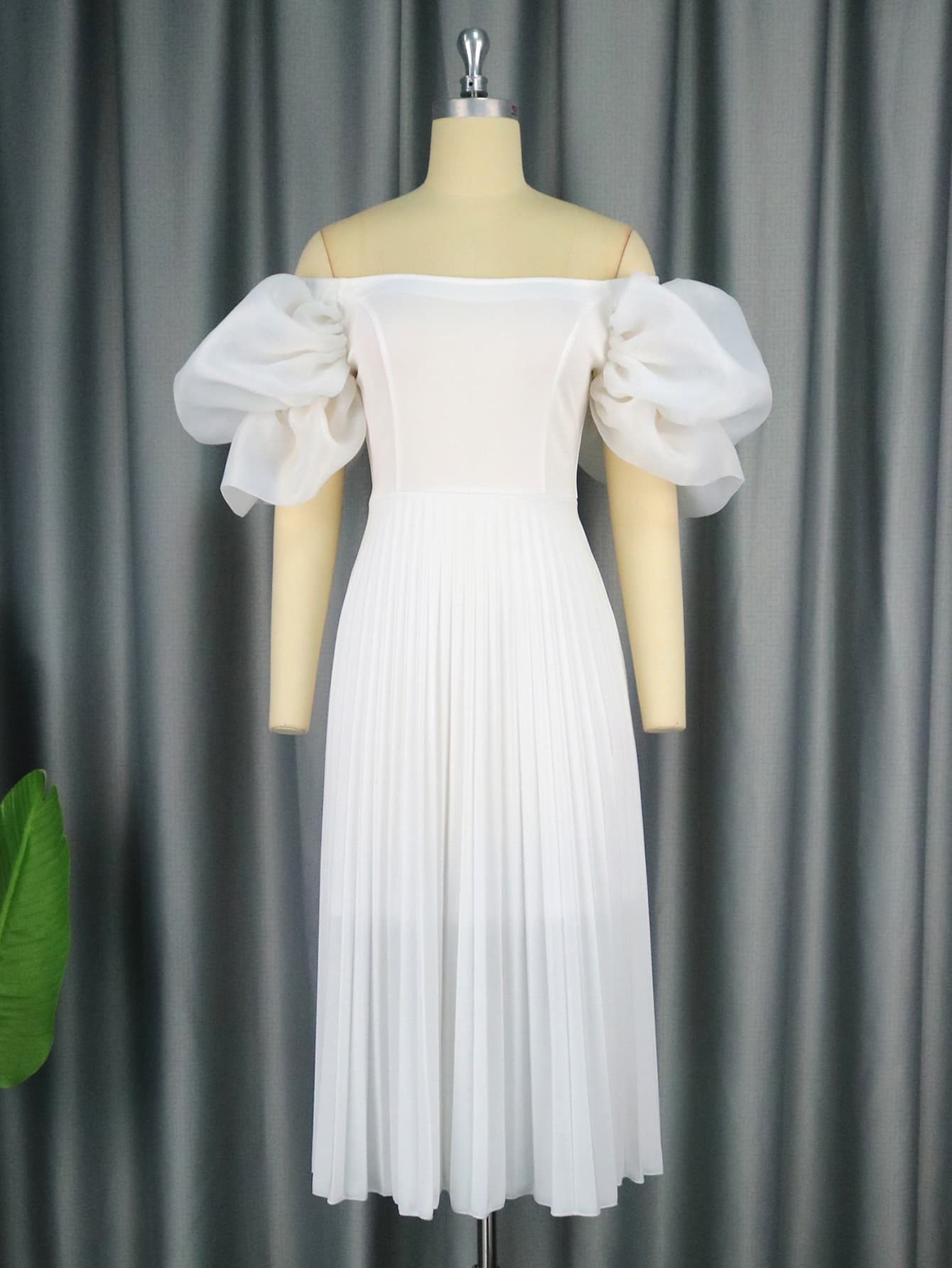 Styles: Short Puff Sleeve,Solid Color,High Waist,A Shaped Elegant Women Daily Party Midi Dress
