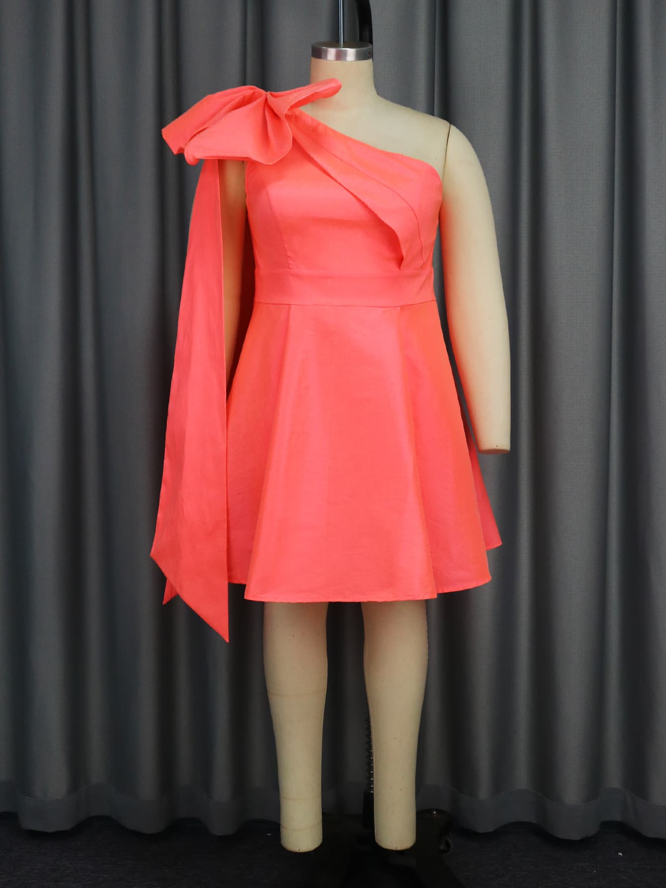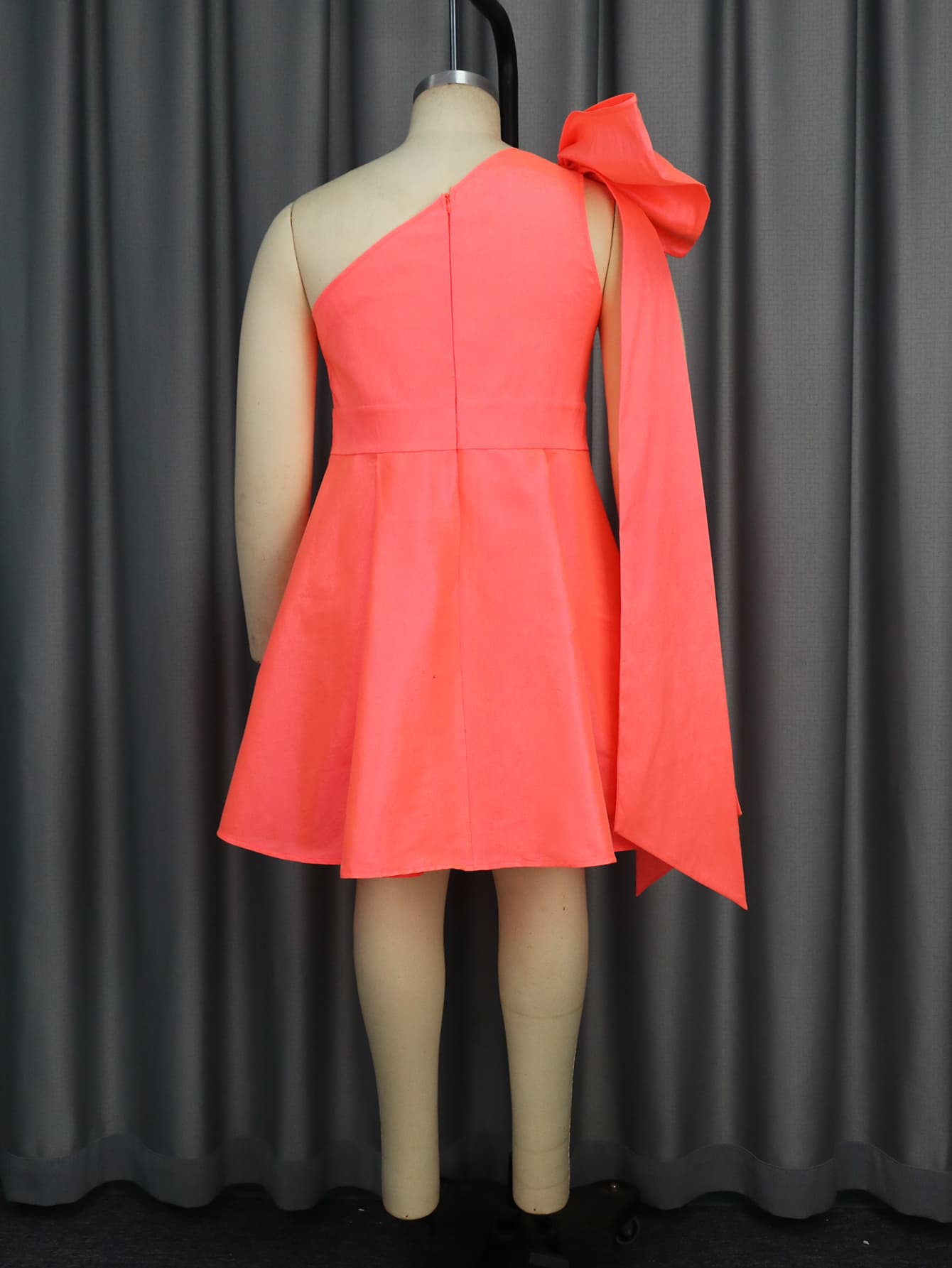 Our orange one shoulder sleeveless a-line dress striking dress features a bold one-shoulder design, complemented by a dramatic oversized bow that adds a touch of sophistication and playful charm.