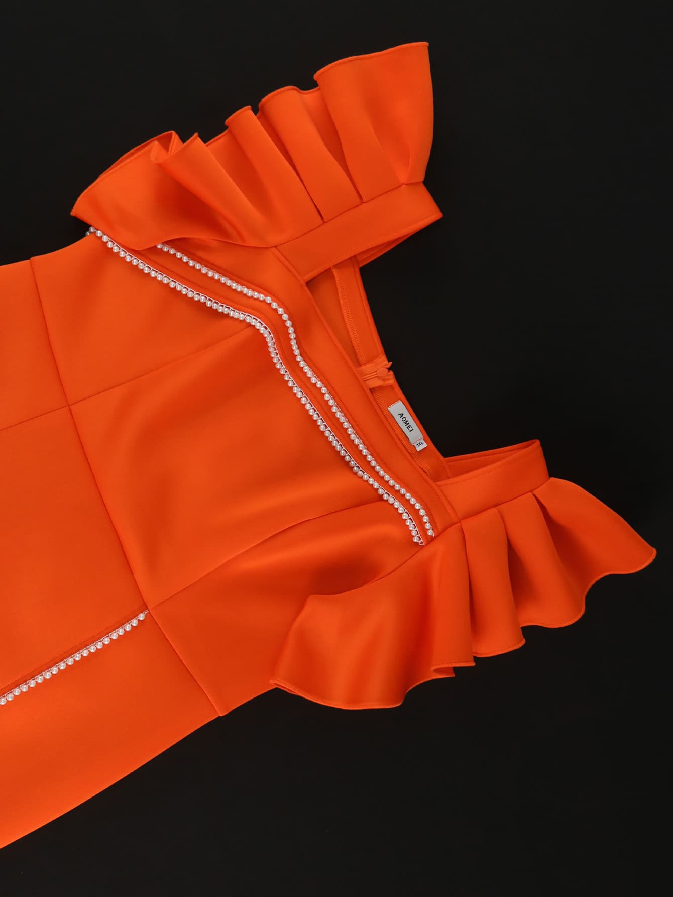 Dress Style: Lotus leaf sleeves, studded with pearls and diamonds, invisible zipper, orange dress