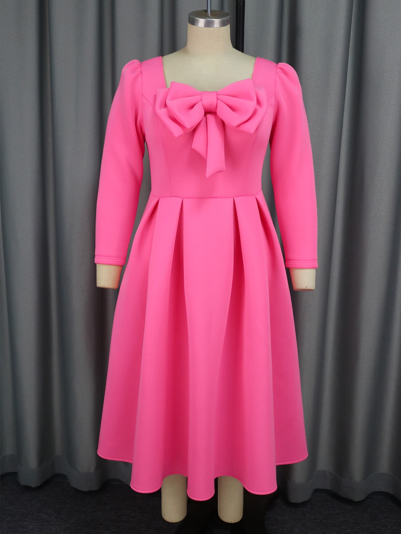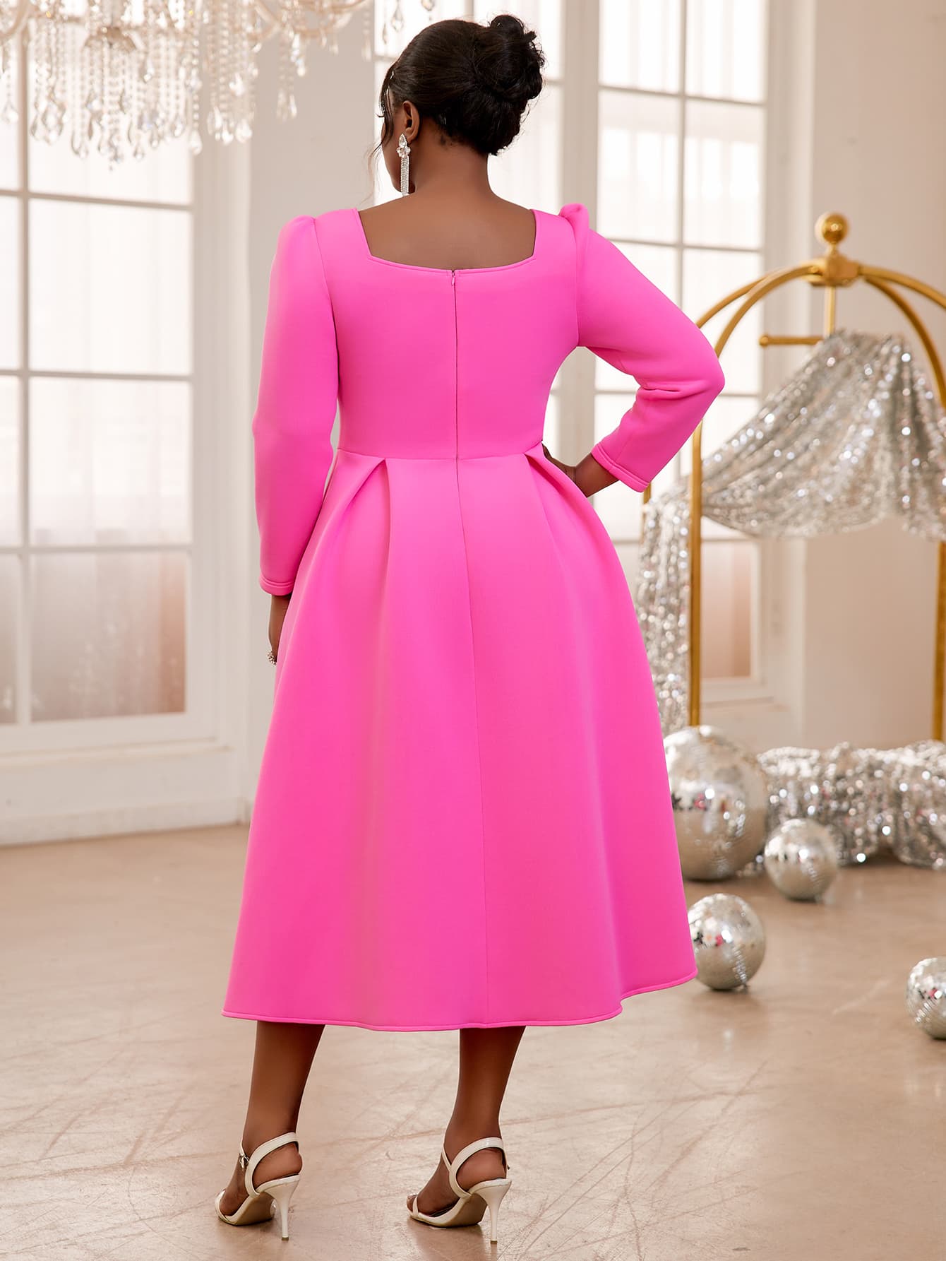 Turn heads with our Sexy Magenta Square-Neck Midi Dress, a perfect choice for elegant occasions and church weddings. This dress features a bold square neckline framed by a striking oversized bow, adding a touch of allure and sophistication. Long sleeves and a high-waisted design provide a flattering fit, while the ruffled trim and delicate pleating at the waist create a graceful, flowing A-line silhouette that falls to mid-calf.