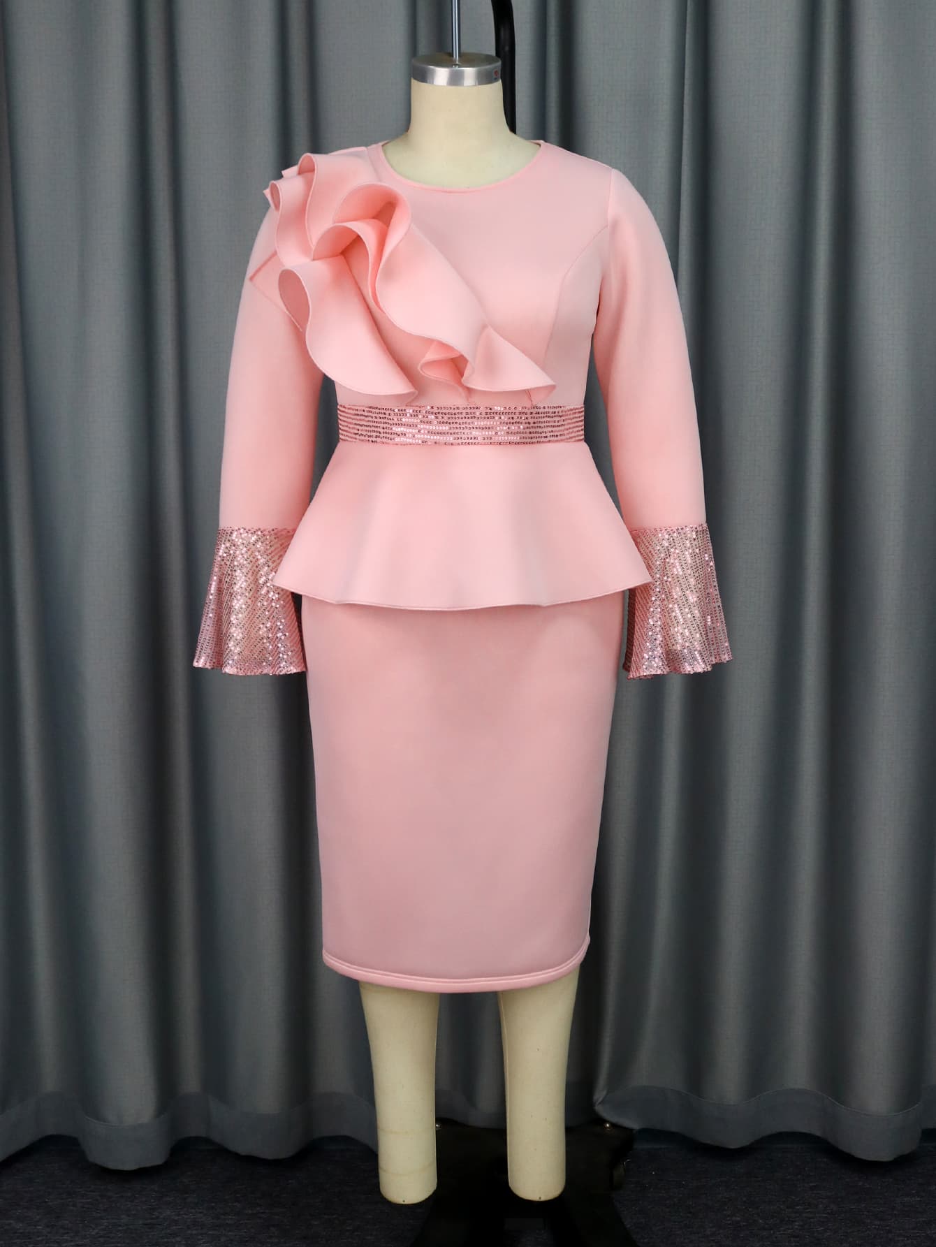Step into the spotlight with our stunning pink ruffle detail flared sleeve sequin bodycon midi dress. This captivating piece features a chic round neckline and playful ruffle accents that enhance the feminine silhouette. The long flared sleeves add an element of elegance, while the shimmering sequins catch the light beautifully, making it perfect for any party.