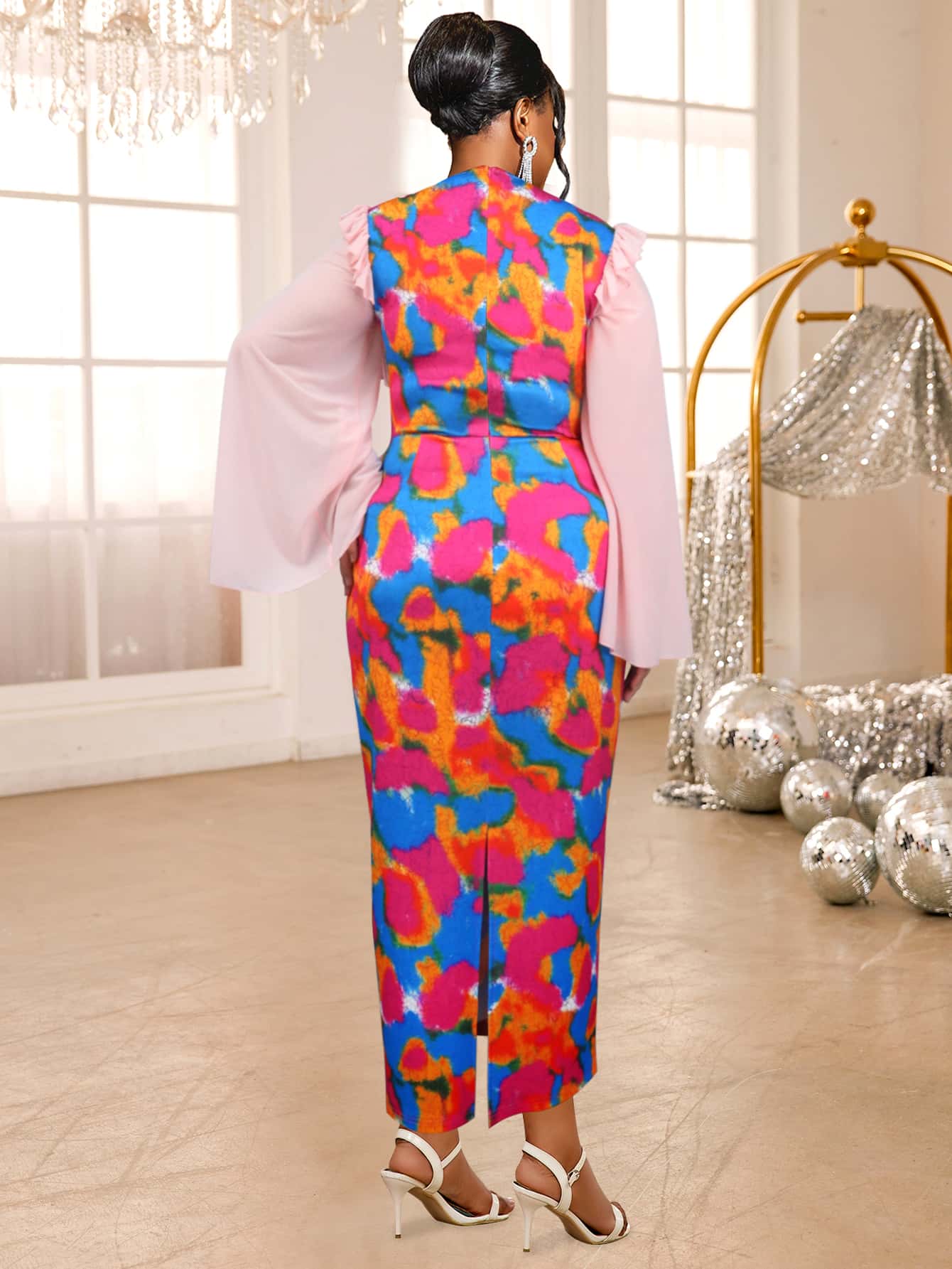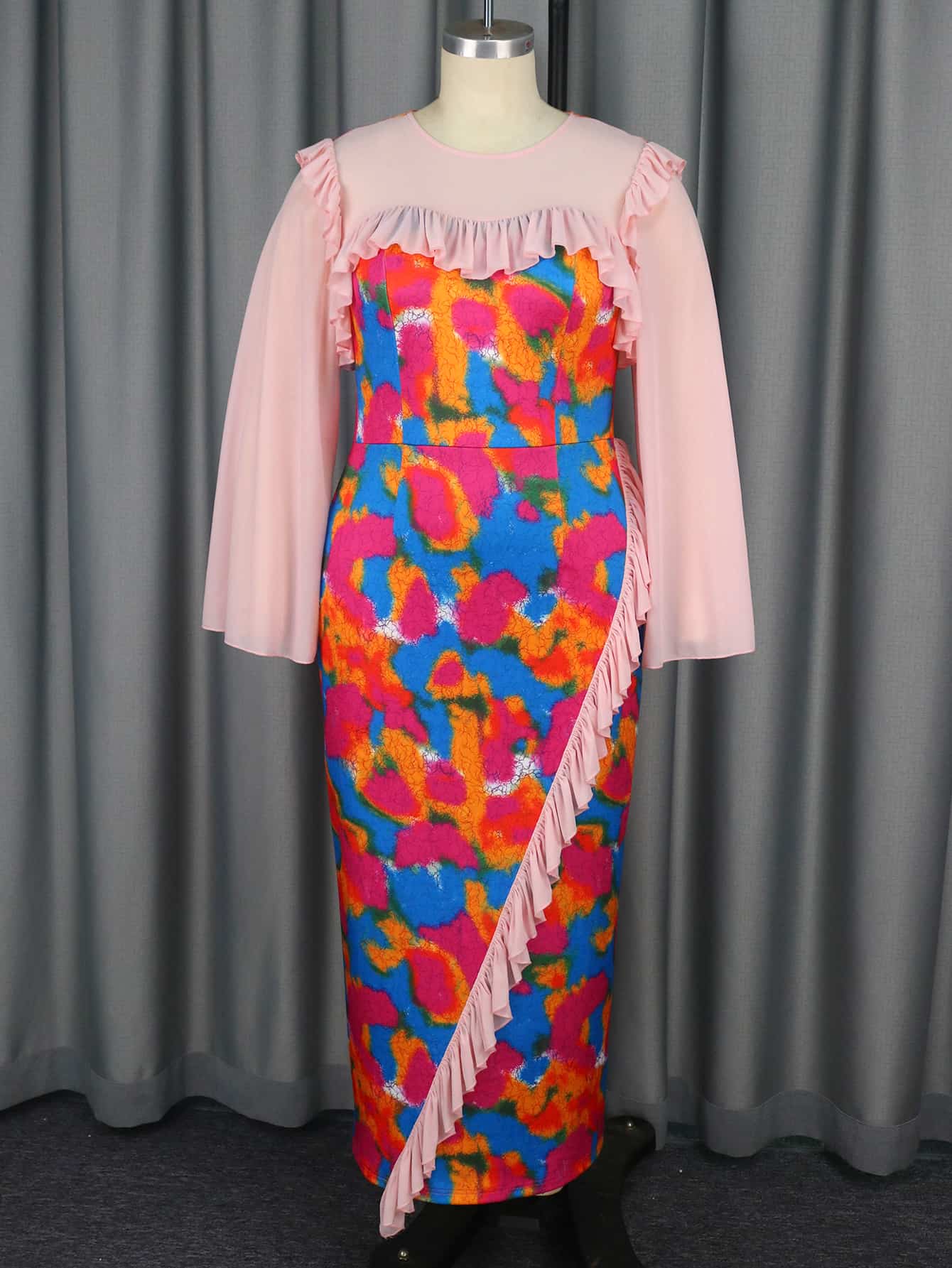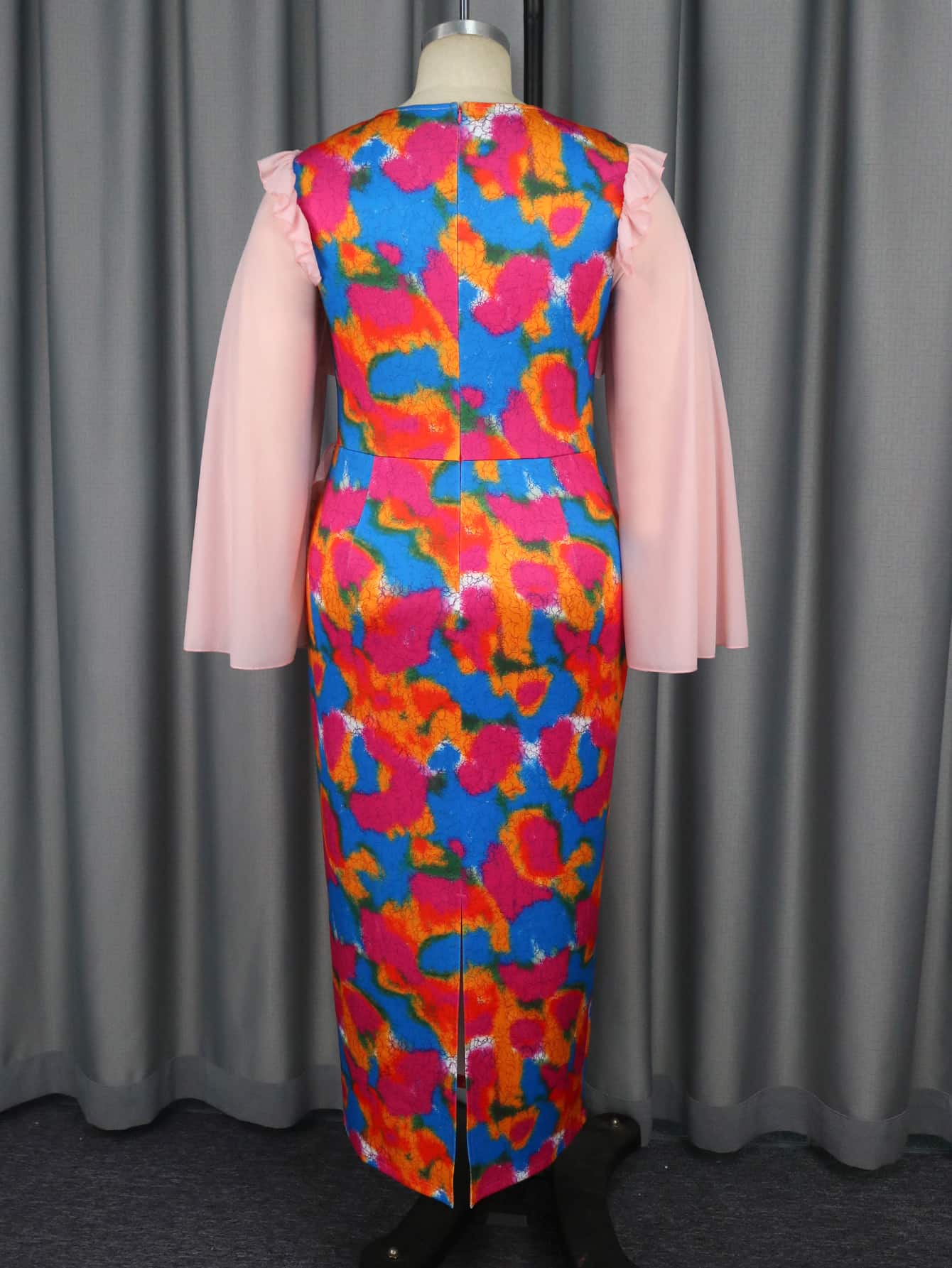 Step into elegance with this stunning Plus Size Printed Party Dress, designed for celebrating special occasions in style. Featuring an O-neckline and long, dramatic flare sleeves, this maxi gown brings a touch of sophistication to any event. The beautiful patchwork print adds a unique flair, while the bodycon fit accentuates your curves for a flattering, confident look.