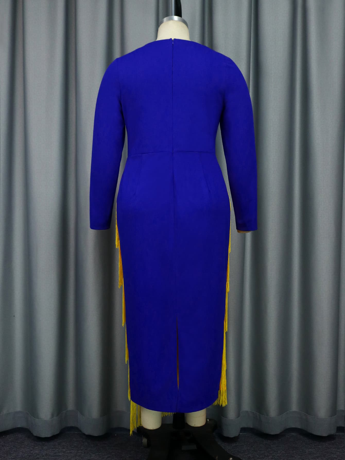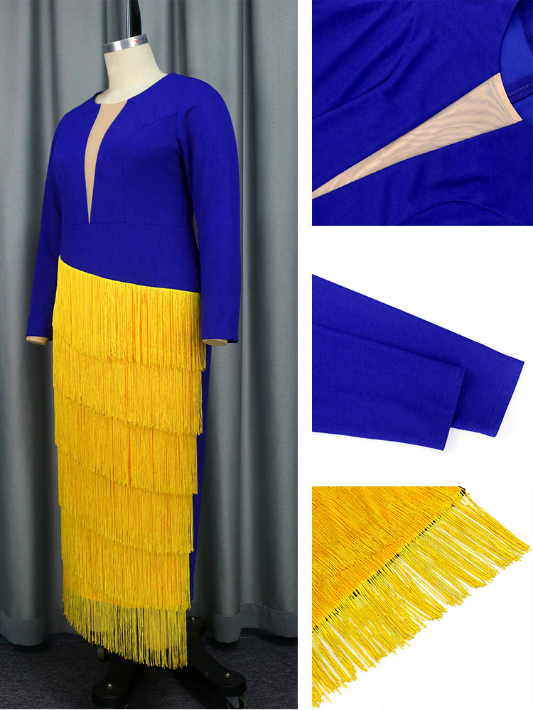 Long Sleeve High Waist Patchwork Fringe Layered Back Zipper Slit Party Dress