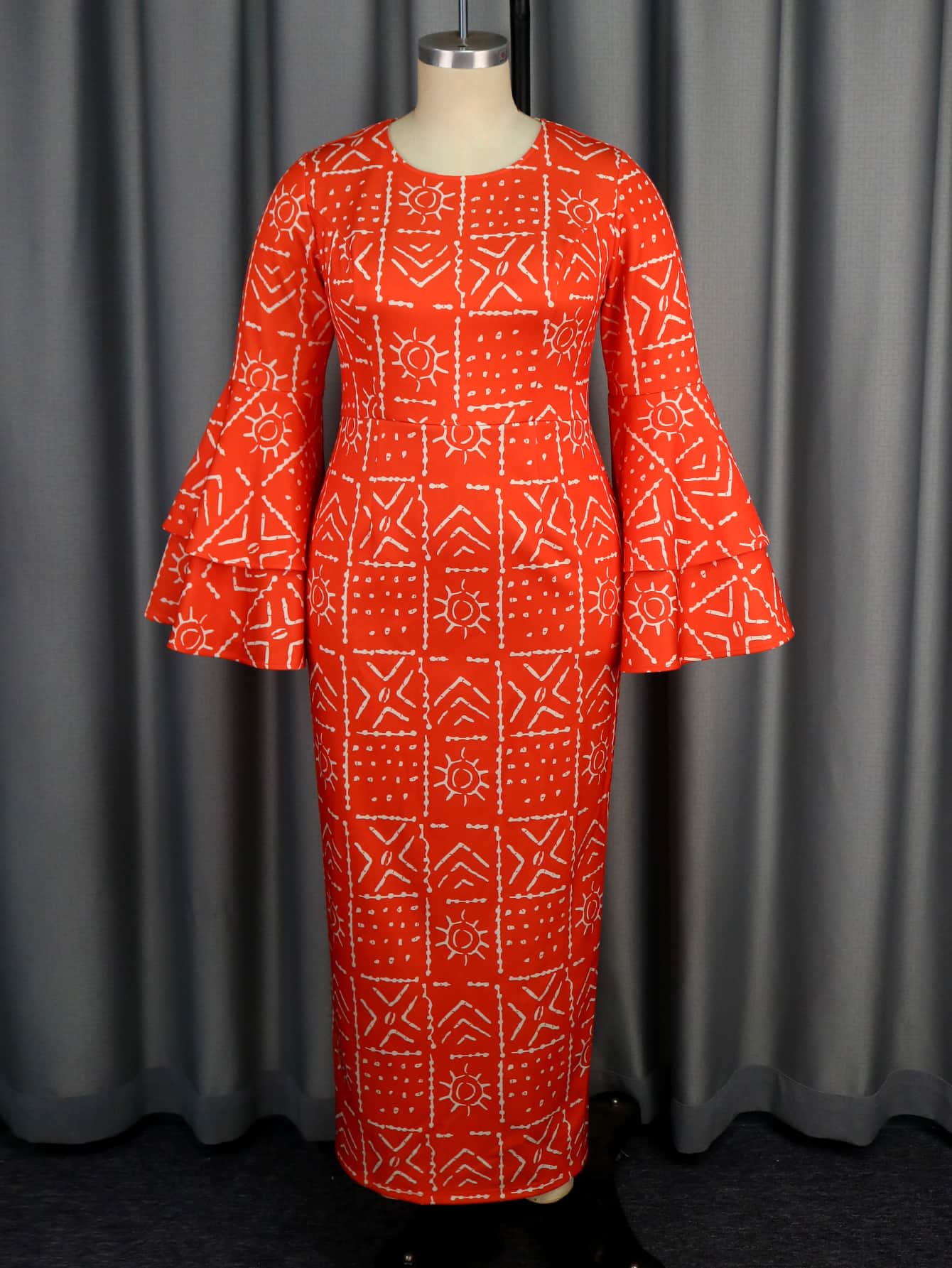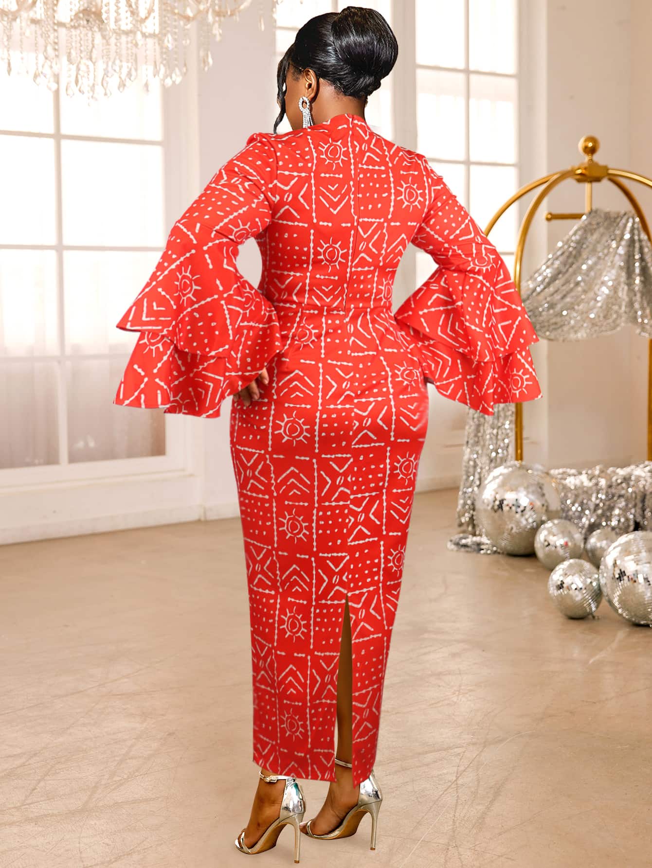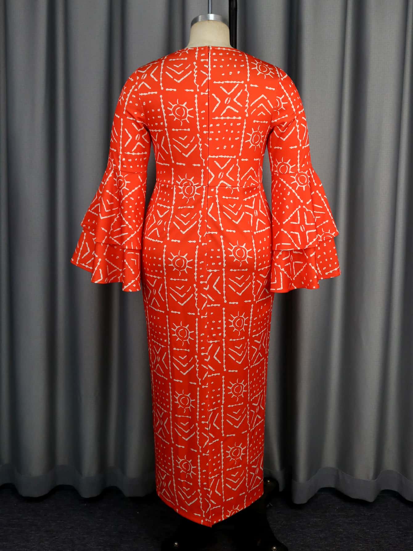 Dress Style: Red print, flared sleeves, long sleeves, invisible zipper, Maxi dress