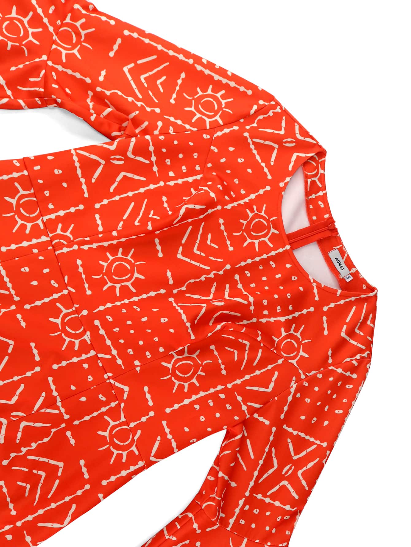 Step out in style with our Red Digital Print Slim Fit Dress, designed to make a statement at any event. This dress features a classic round neckline and elegant flared long sleeves, bringing a touch of sophistication to its vibrant red color and unique digital print.