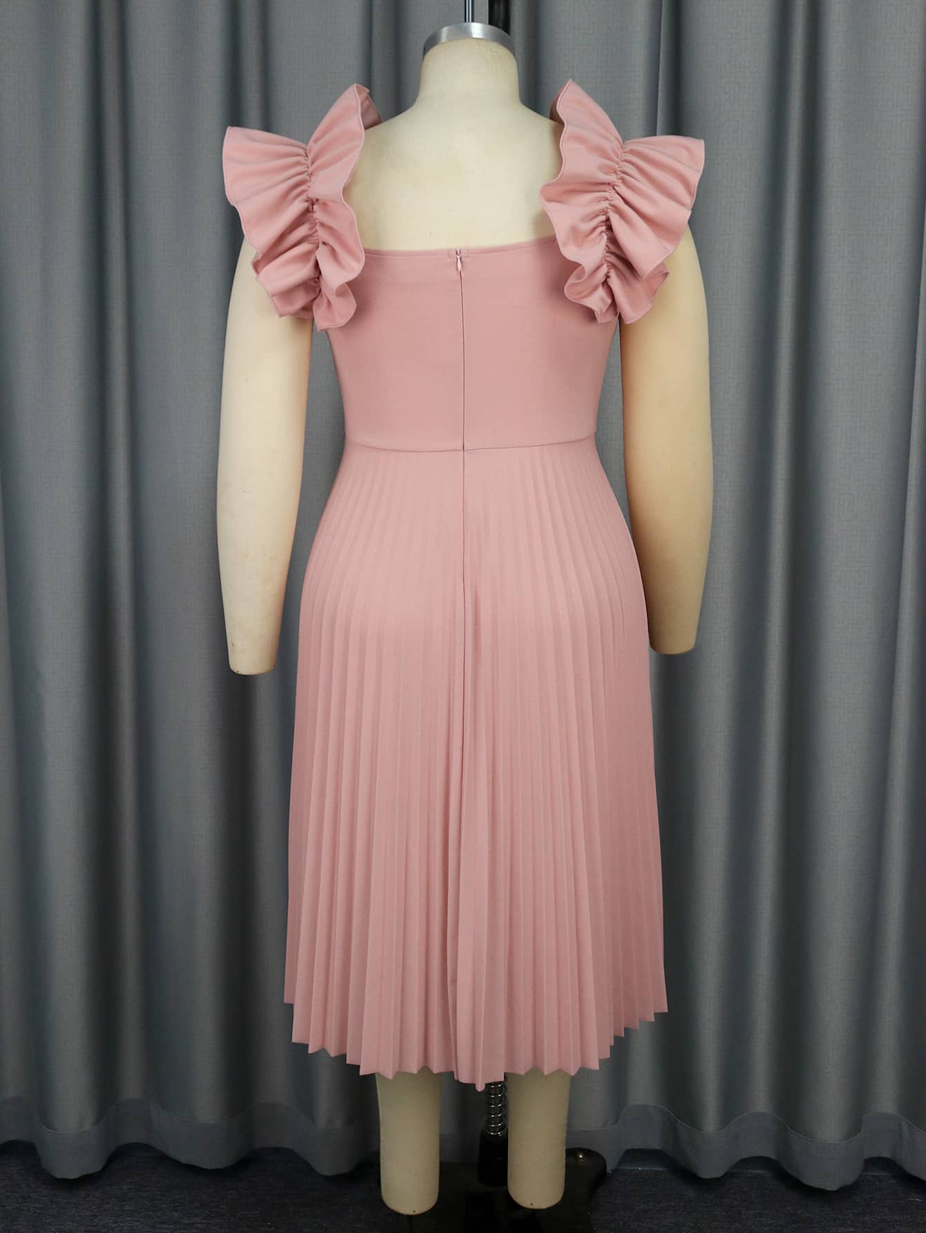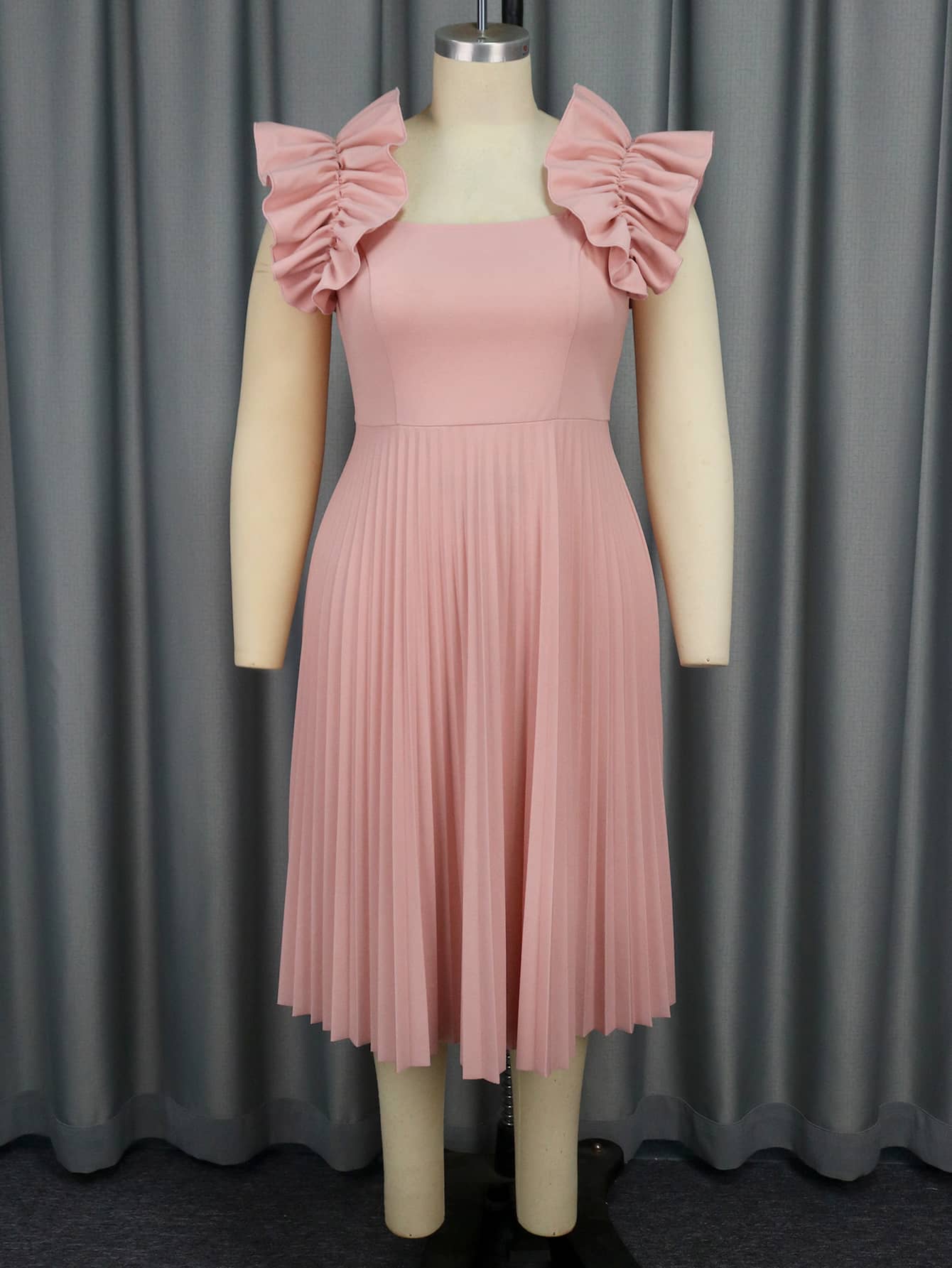 Make a chic statement with our pink square neck ruffle sleeveless high-waist midi dress, perfect for both work and parties. This elegant dress features a flattering square neckline framed by feminine ruffle detailing, adding a touch of sophistication. The high-waist design and pleated midi-length skirt create a beautifully tailored silhouette that complements all body types.