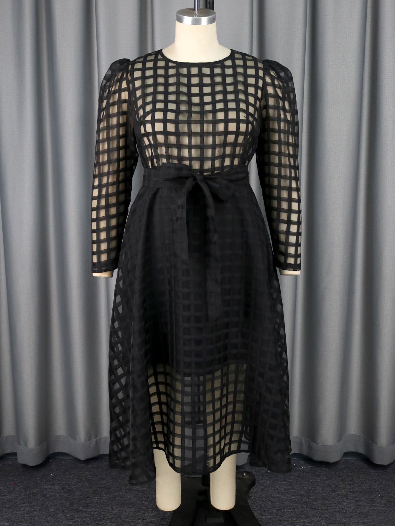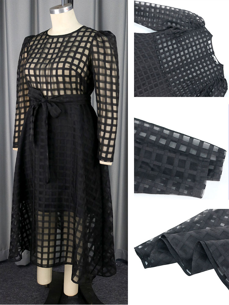 Design: Long sleeve,high waist,waist belt,plaid organza see through evening casual party gowns