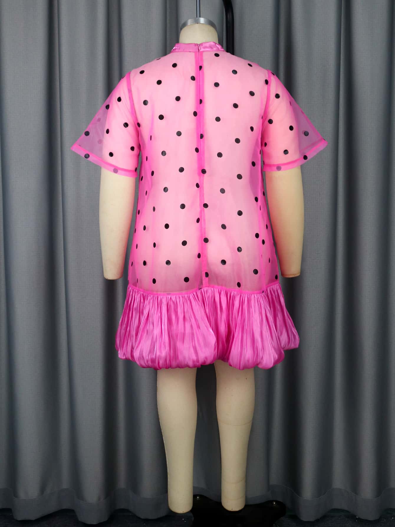 This stunning dress features a semi-sheer organza fabric with playful polka dots, offering a chic and modern take on classic elegance. The mock neckline and short sleeves create a refined silhouette, while the loose fit ensures comfort and effortless style.