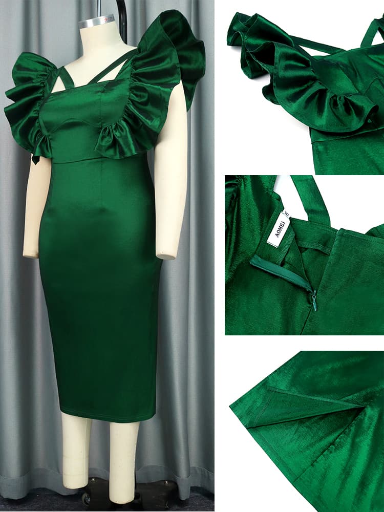 Styles: V-neck,sleeveless,ruffles,package hip,solid color,slim fit,midi women dress.