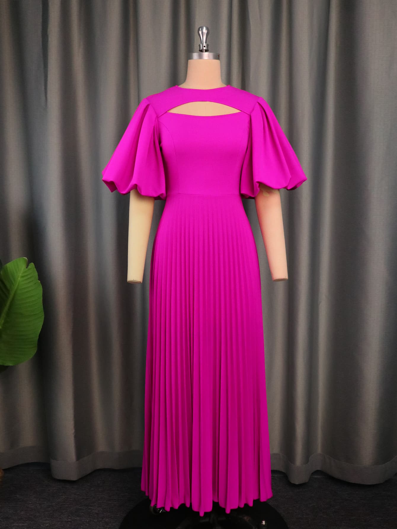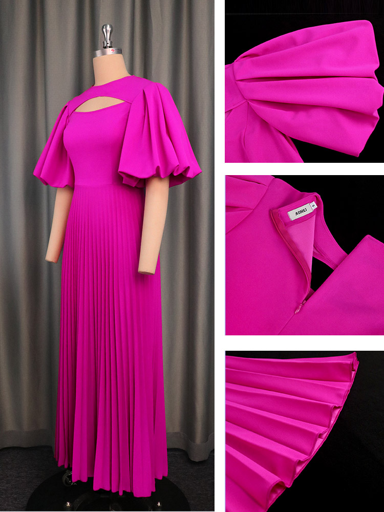 Styles: O Neck,Cut Out Design,Short Puffy Sleeve,High Waist,A Line Pleated Ankle Length Dresses