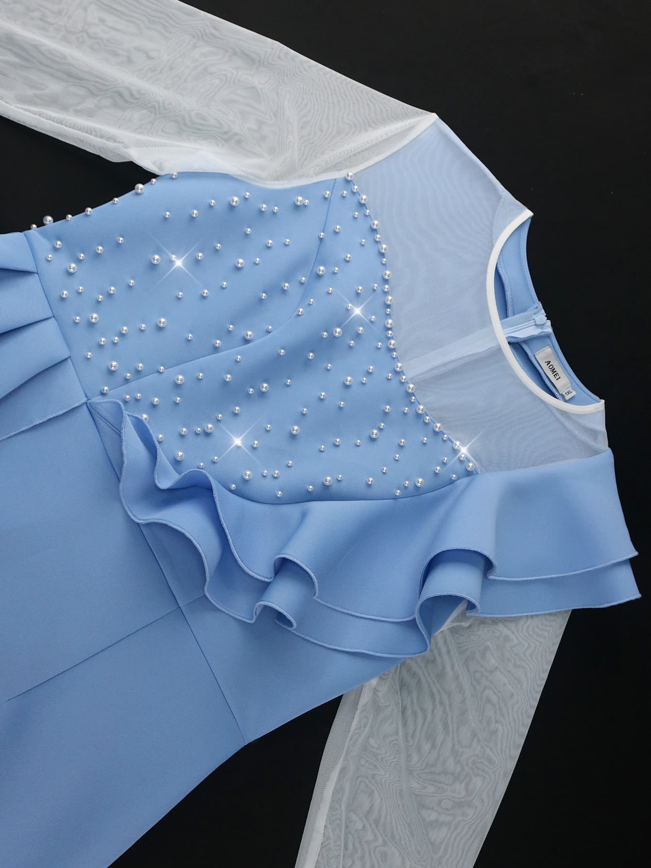 Dress Style: Asymmetric, patchwork, bead design, invisible zipper, blue dress