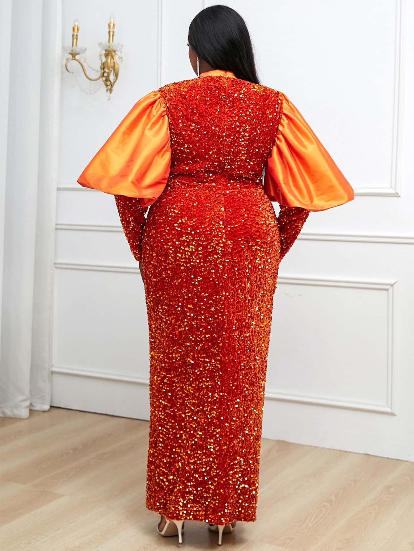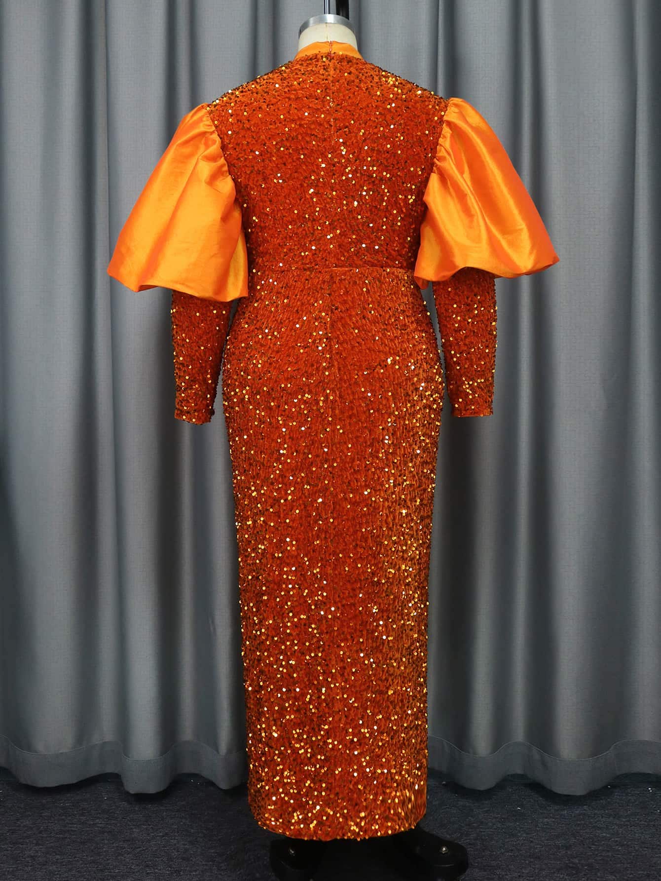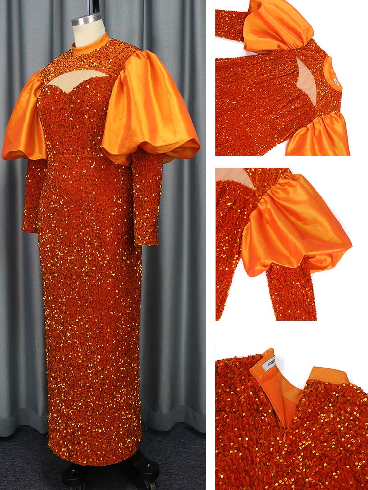 Styles: Mock Neck,Cut Out,Lantern Long Sleeve,Velvet Sequins Decoration,Empire,Ankle Length Sequins Women Long Dress