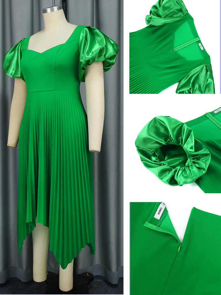 Short Puff Sleeve High Waist A Line Pleated Irregular Women Midi Gowns Dress