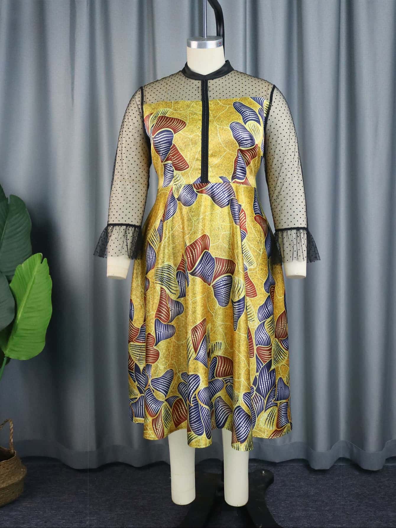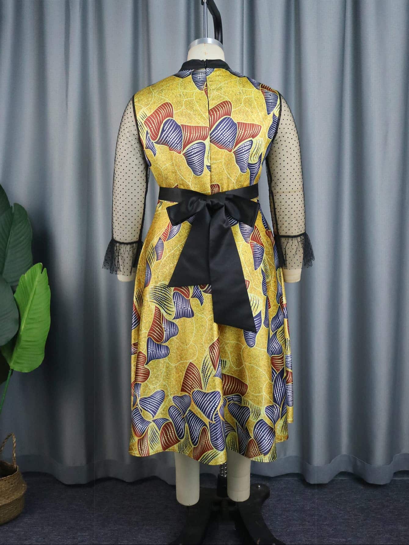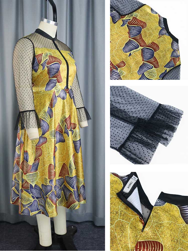 Styles: O neck,see through long flare dot sleeve,a line,waist belt,printed pulllover floral midi outfits for women