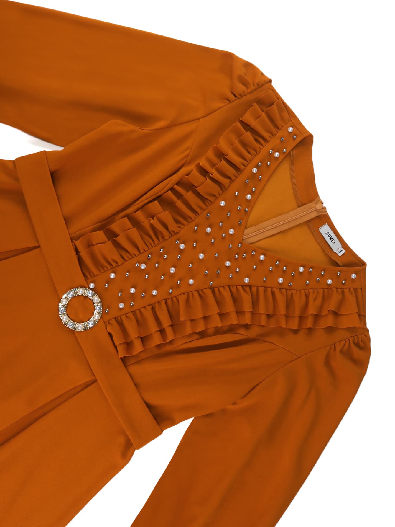 Wearing our brown v-neck office dress, designed to blend elegance with a professional style. Featuring a soft textured fabric that adds visual depth, this dress is accented with subtle beaded detailing around the neckline, lending a hint of sparkle. The flattering V-neck and puff sleeves create a modern silhouette, perfect for office and casual wearing.