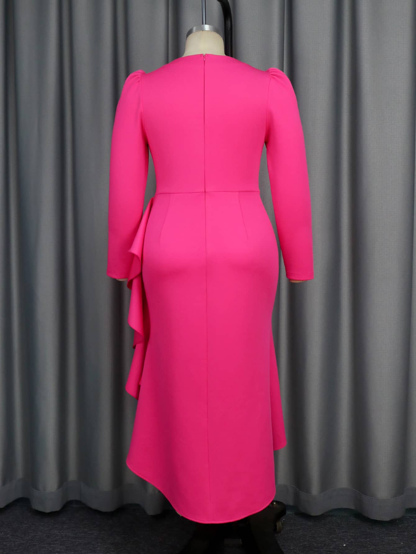 Dress Style:v neck,long sleeve,waist belt decoration,high waist,irregular length,ruffles,pullover,invisible zipper,midi length party dress.