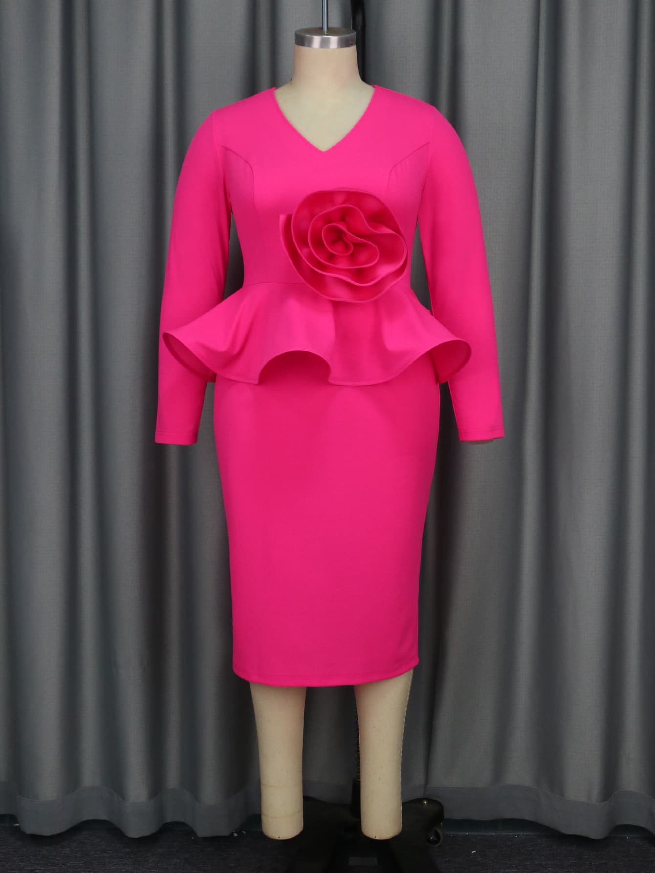 V Neck Long Sleeve Peplum Flower Midi Cocktail Dress Factory Wholesale Bulk Buy