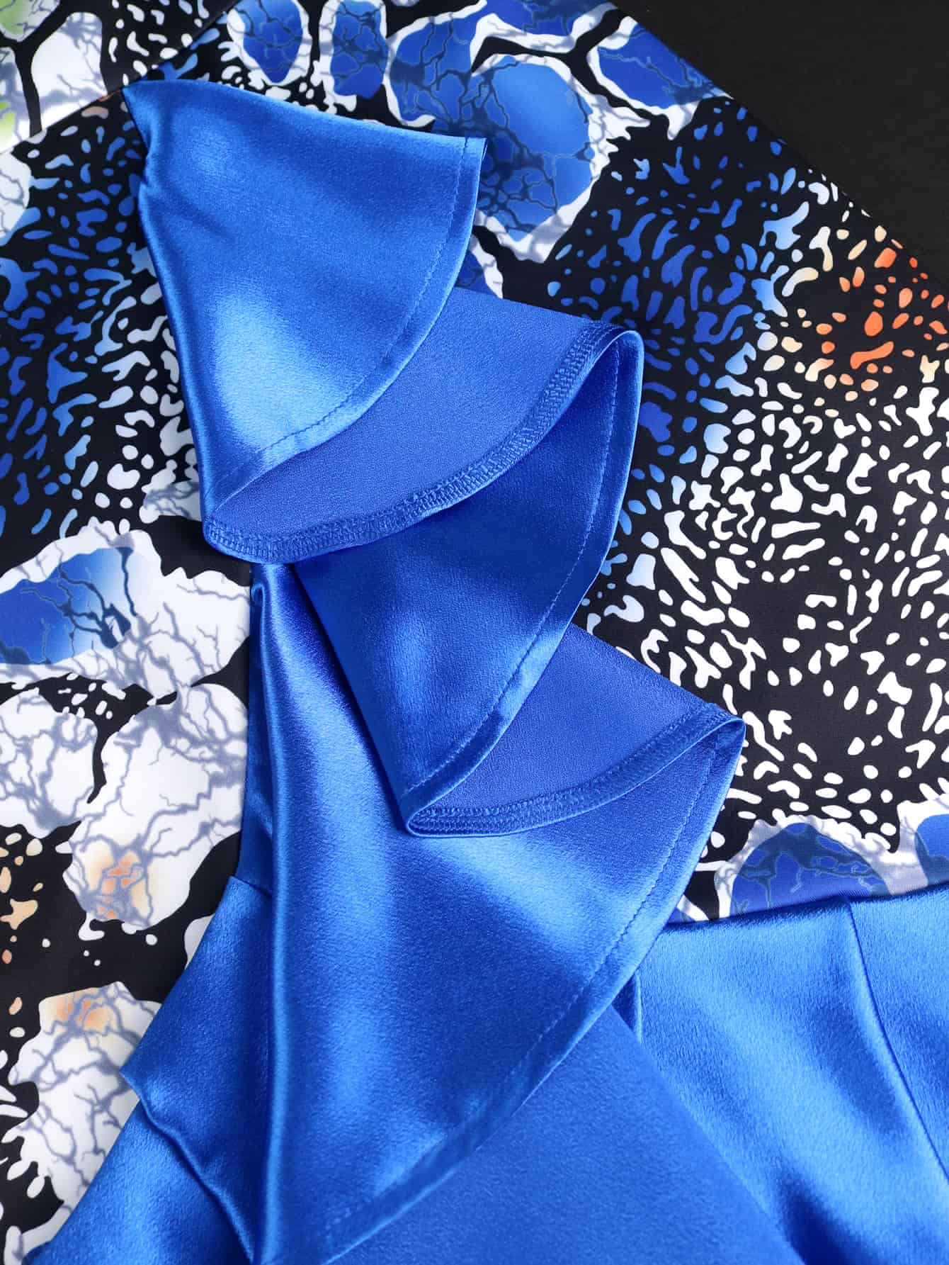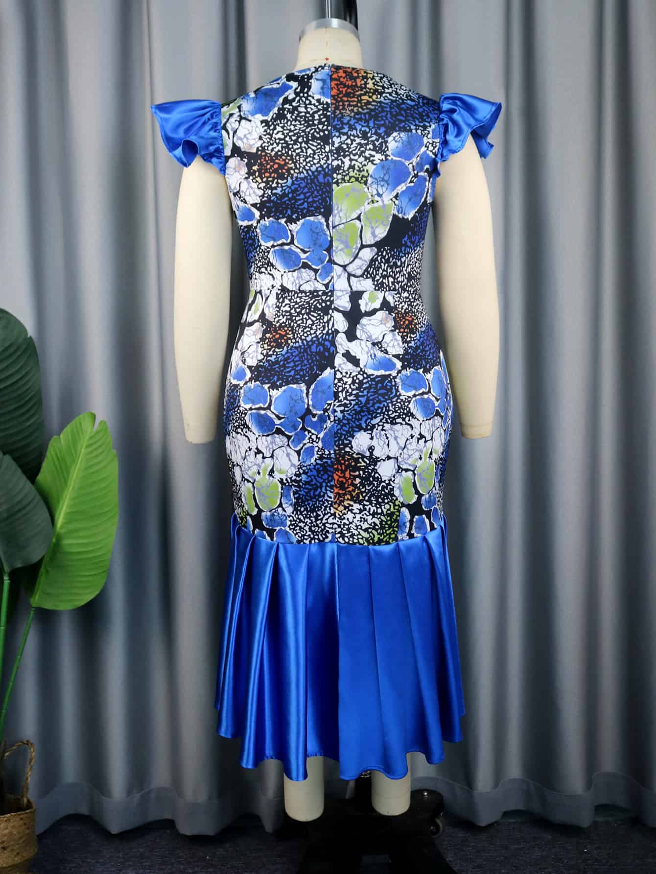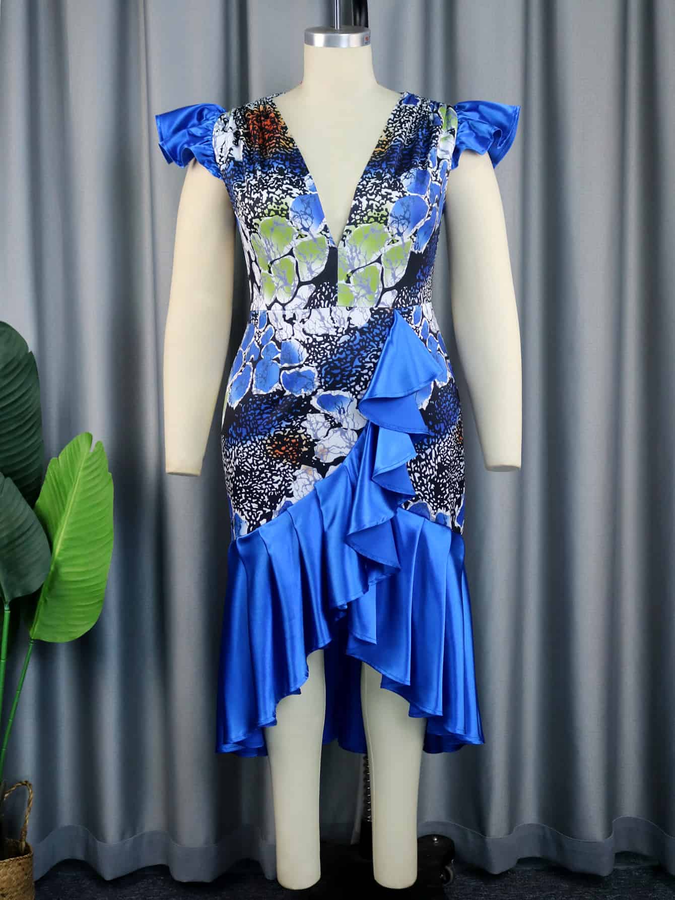 Sexy V Neck Blue Satin Patchwork Irregular Ruffles Midi Gowns Outfits.