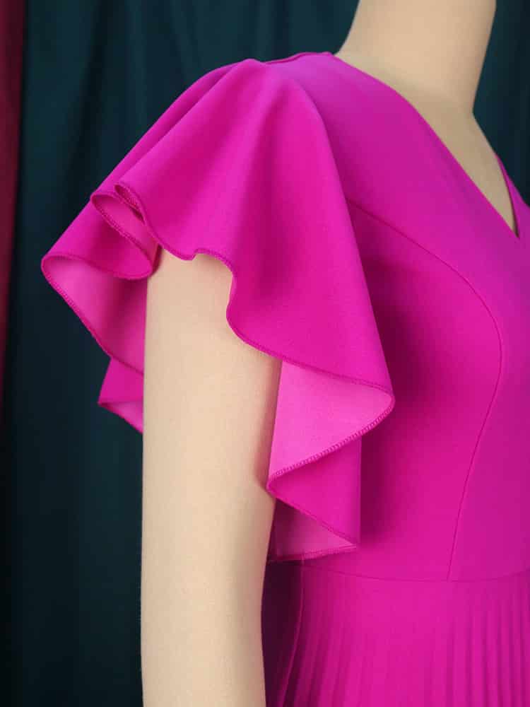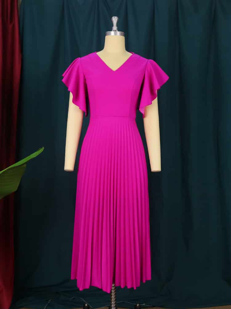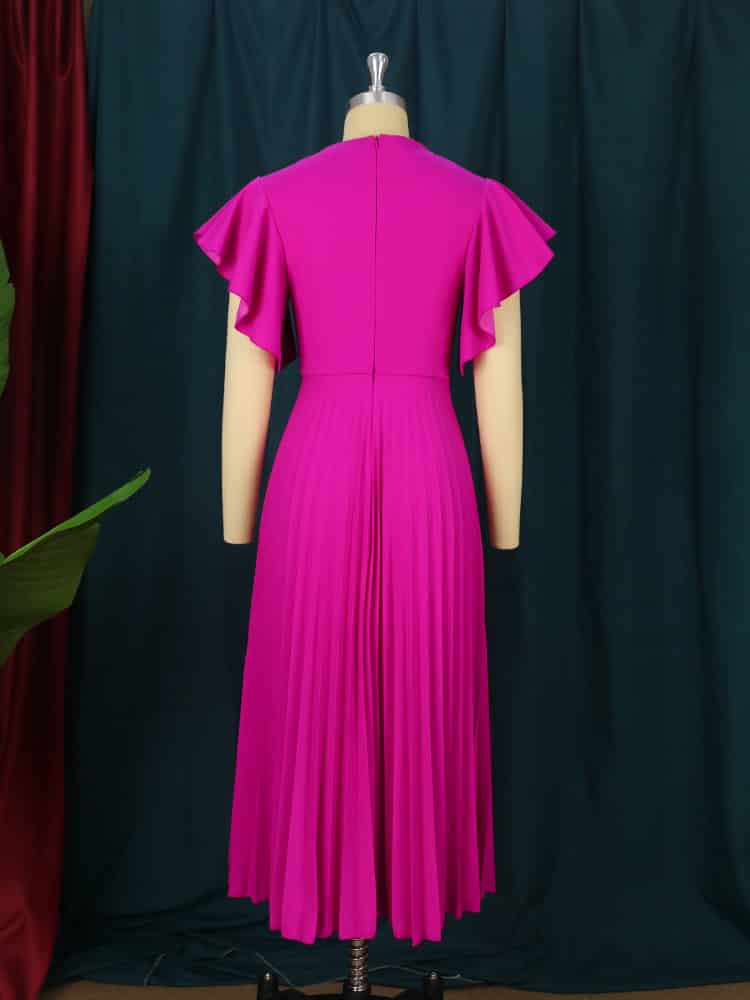 V Neck,Ruffles Short Sleeves,High Waist,Pleated,Elegant Midi Dresses.