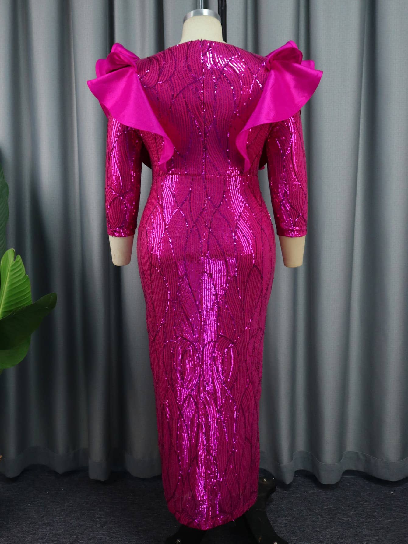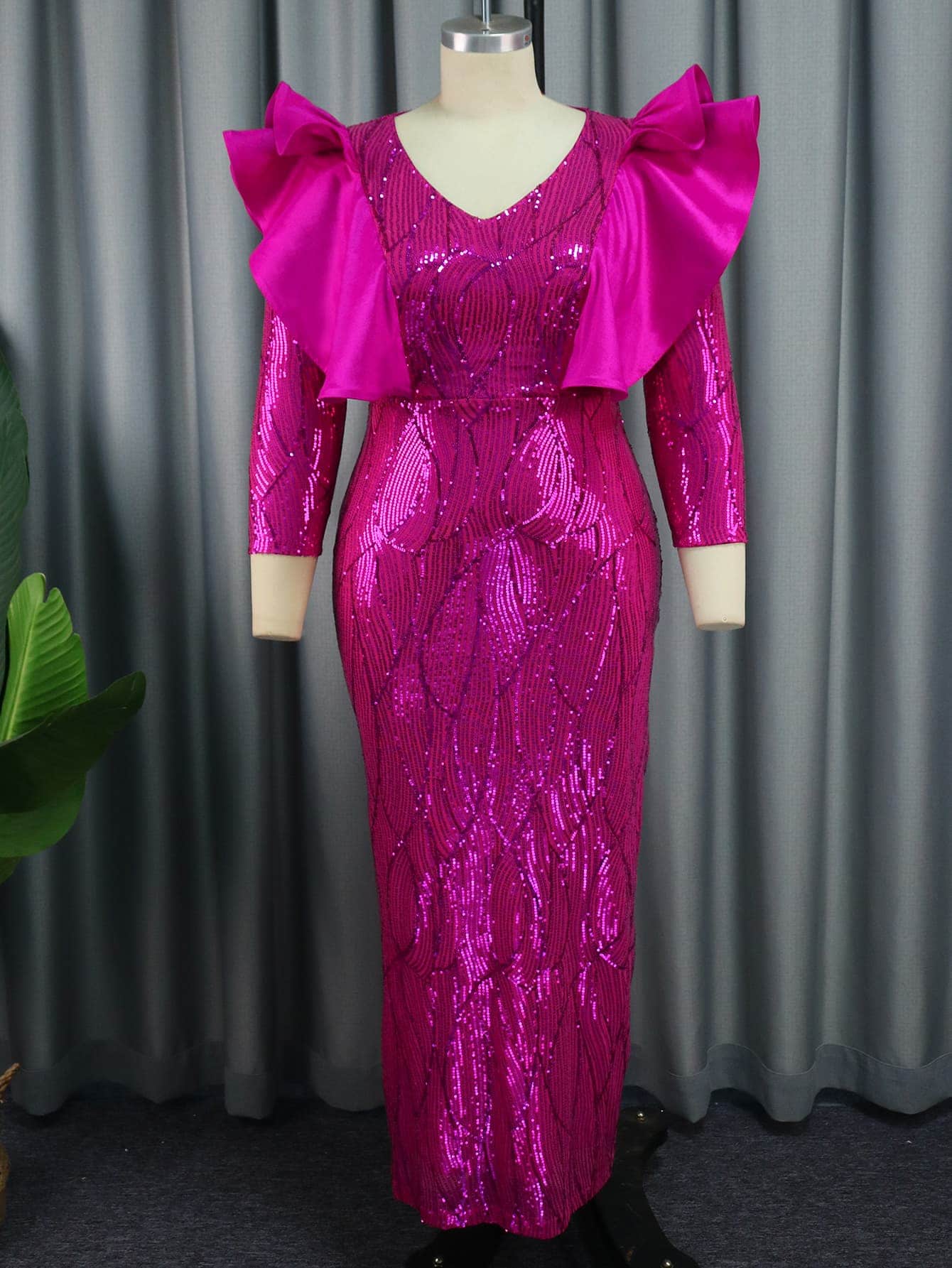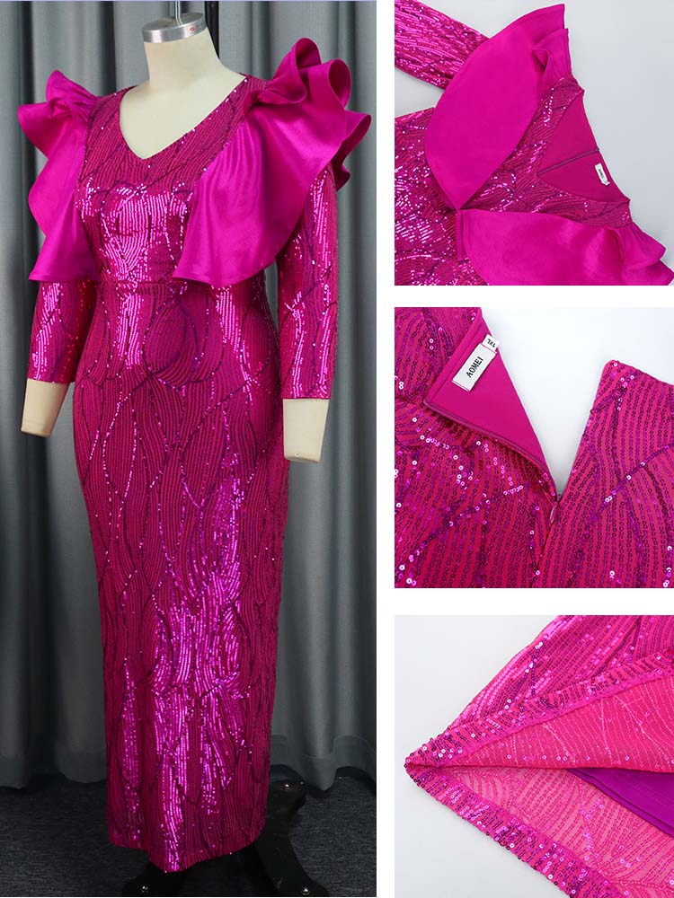 Styles: Long regular sleeve,ruffles,v neck,glitter sequins,slim fit bodycon long party dress