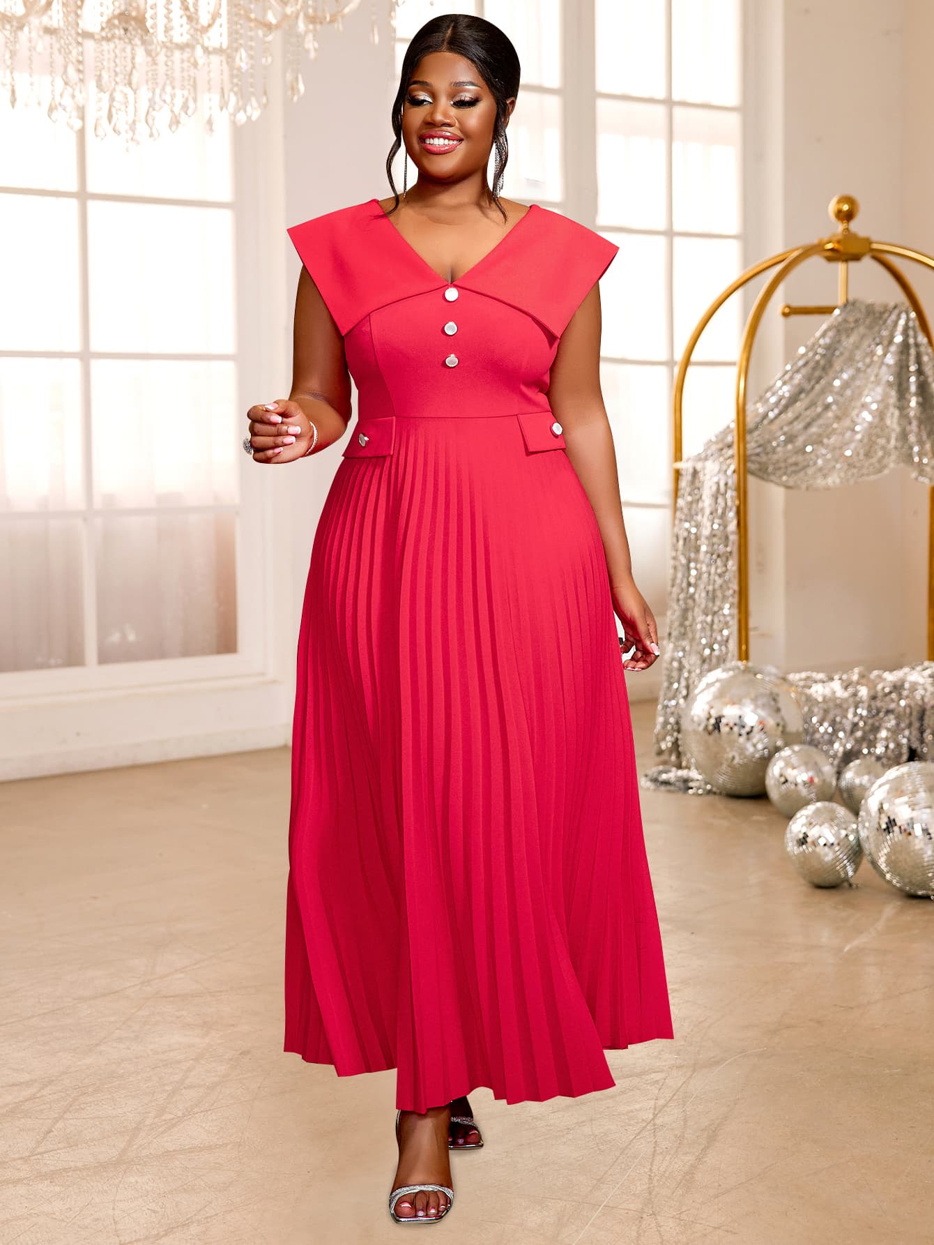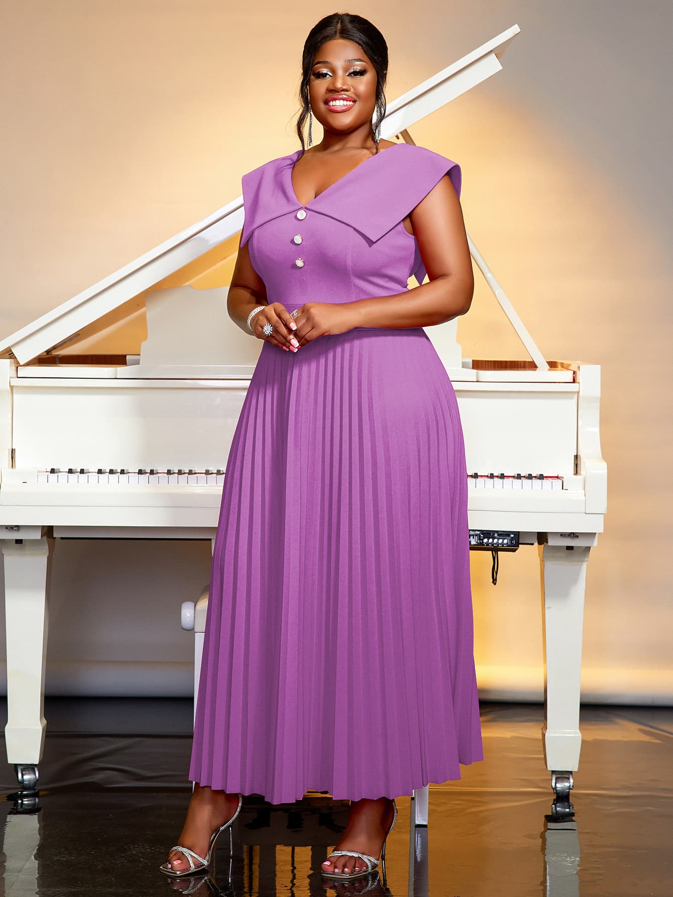 The dress is adorned with elegant button details along the front, adding a classic charm and enhancing its structured look. The high-waist design accentuates your figure, while the pleated skirt flows gracefully to the ankle, providing both comfort and a flattering silhouette.