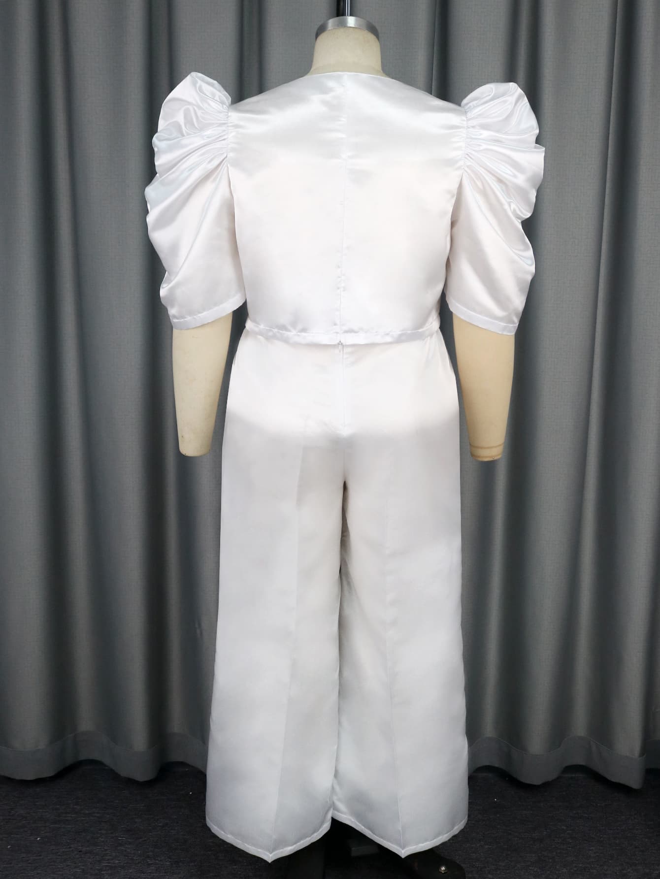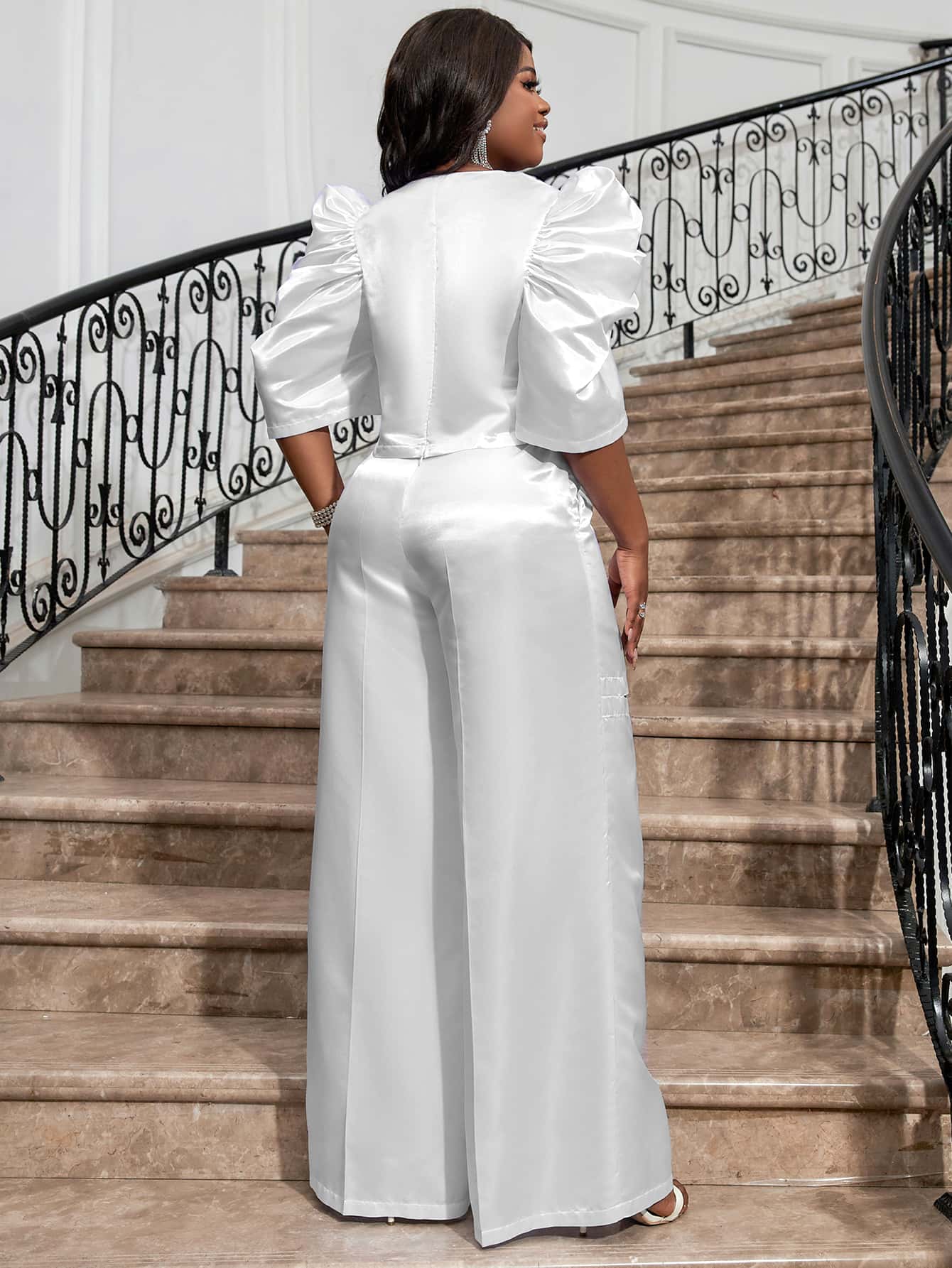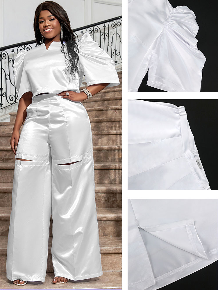Satin shiny crop tops and high waist hollow out wide leg long pants