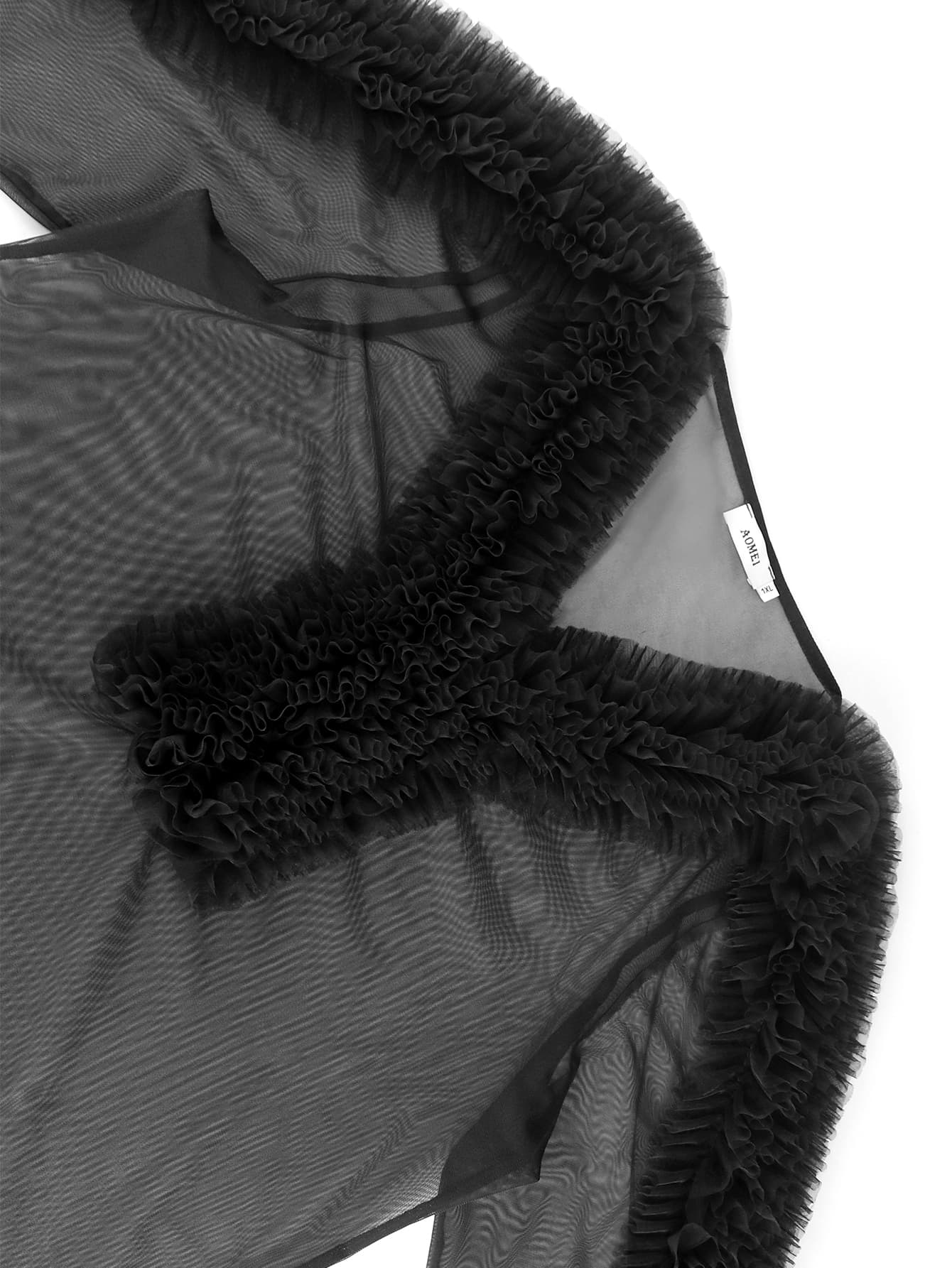 Make a bold fashion statement with our Black Mesh See-Through V-Neck Ruffle Long Sleeve Top. This alluring piece combines a sultry sheer mesh fabric with a deep V-neckline to create a look that's both sexy and sophisticated. The delicate ruffle details along the neckline and sleeves add a feminine touch, balancing the daring design.