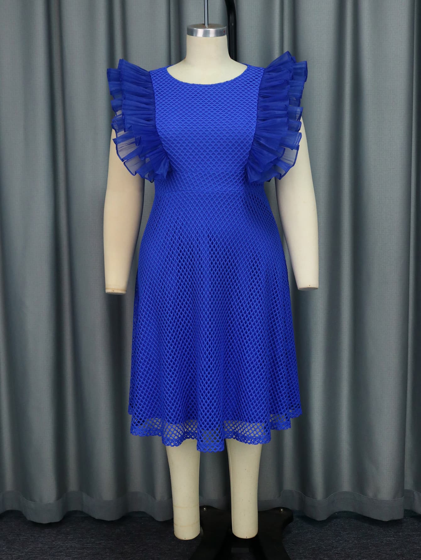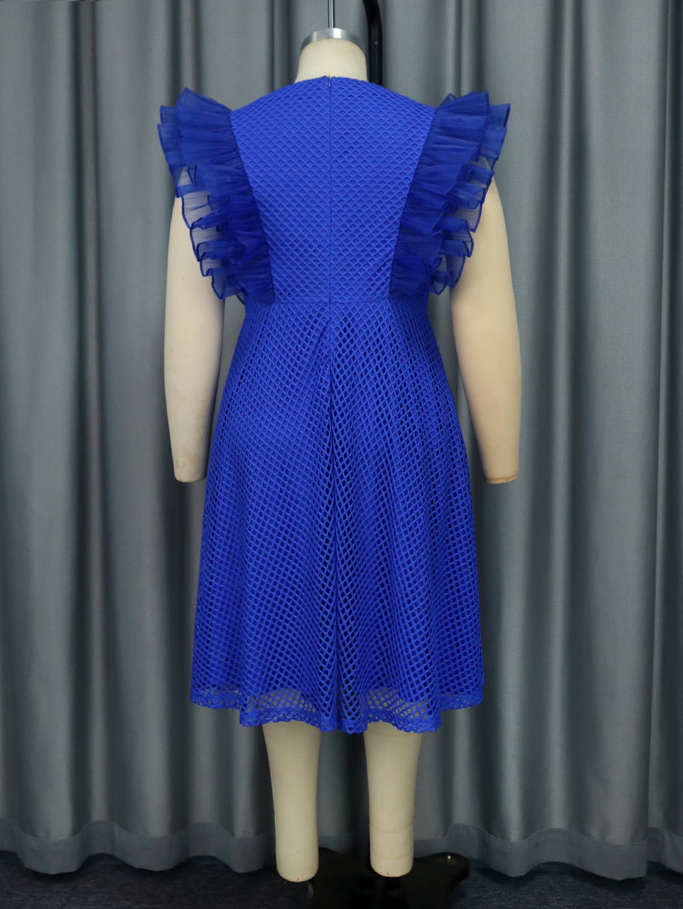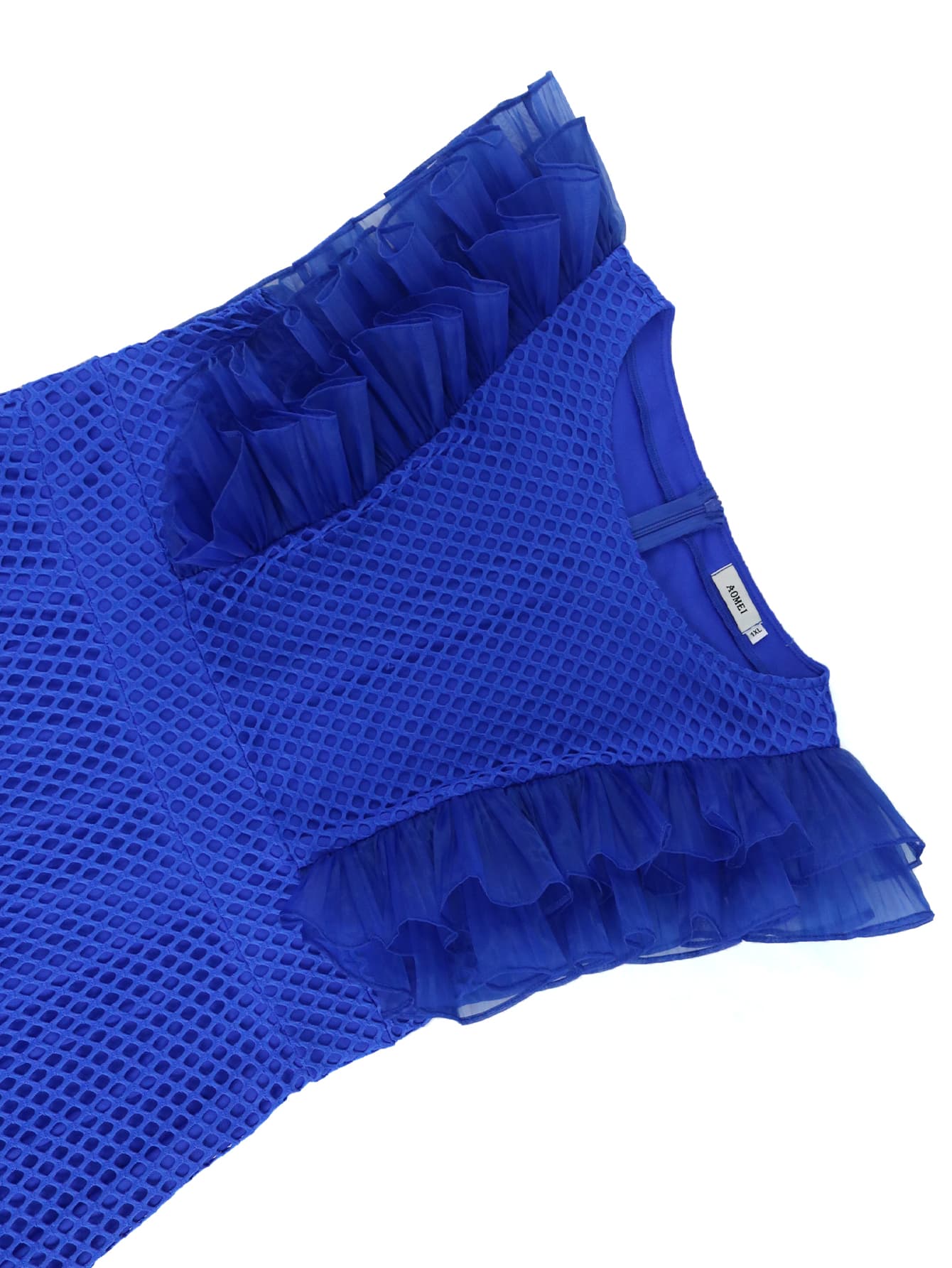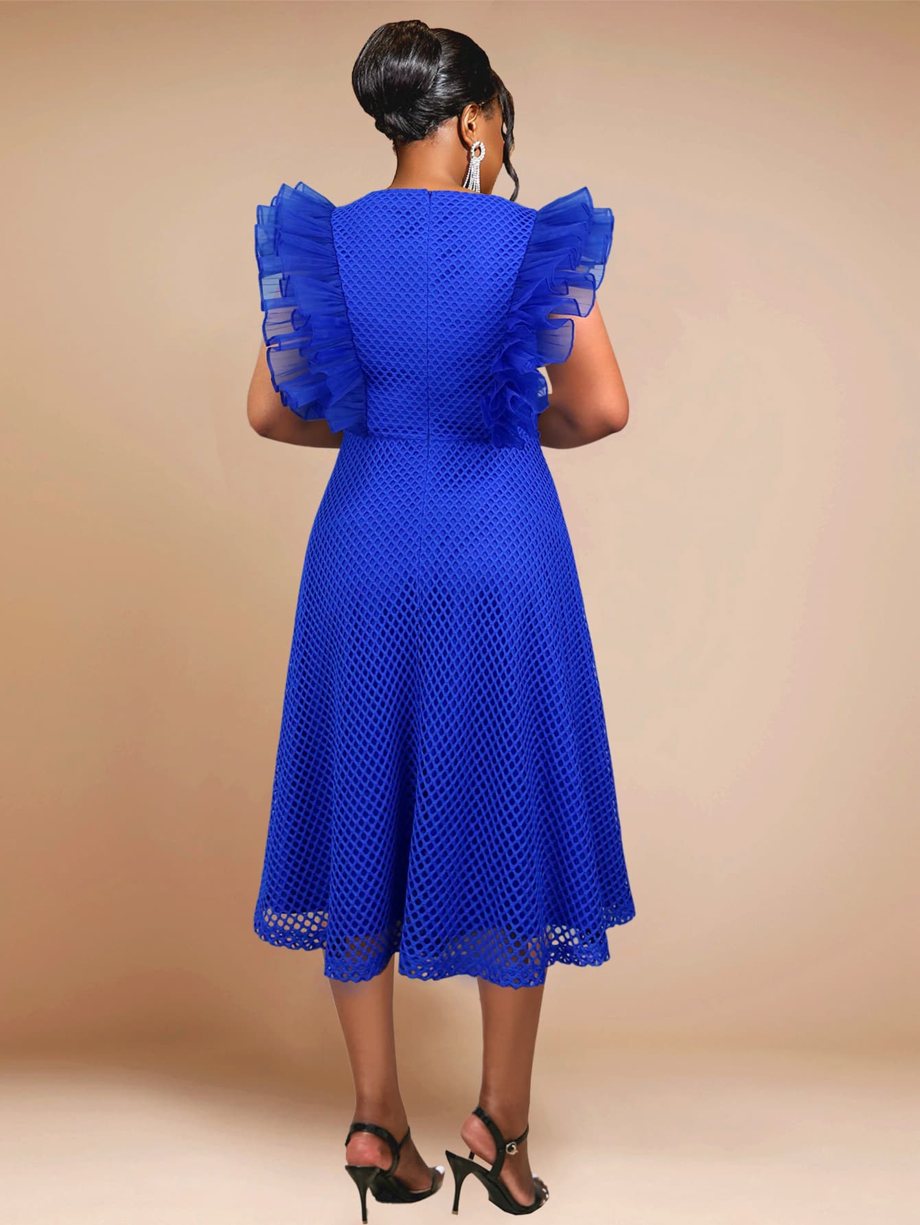 Make a graceful entrance with our Blue Mesh Ruffle Sleeve High-Waisted A-Line Midi Dress. This charming party dress features a sophisticated round neckline and delicate mesh ruffles along the flutter sleeves, adding a touch of romance to its timeless silhouette.