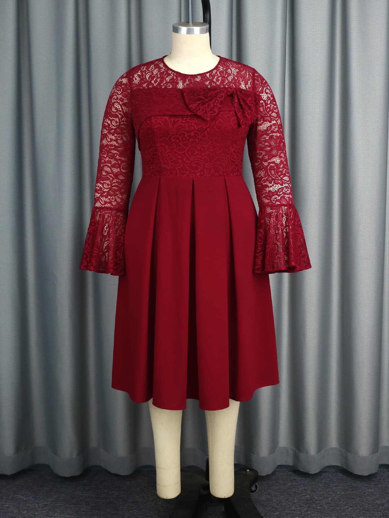 Dress Style:o neck,bow decoration,long flare sleeve,floral lace design,a line,pullover,invisible zipper,midi length outfits.