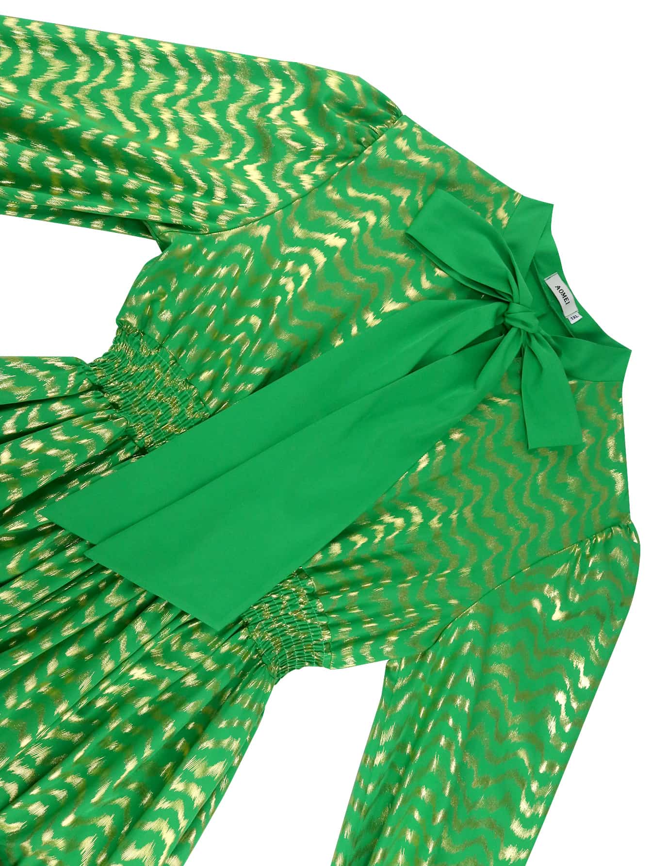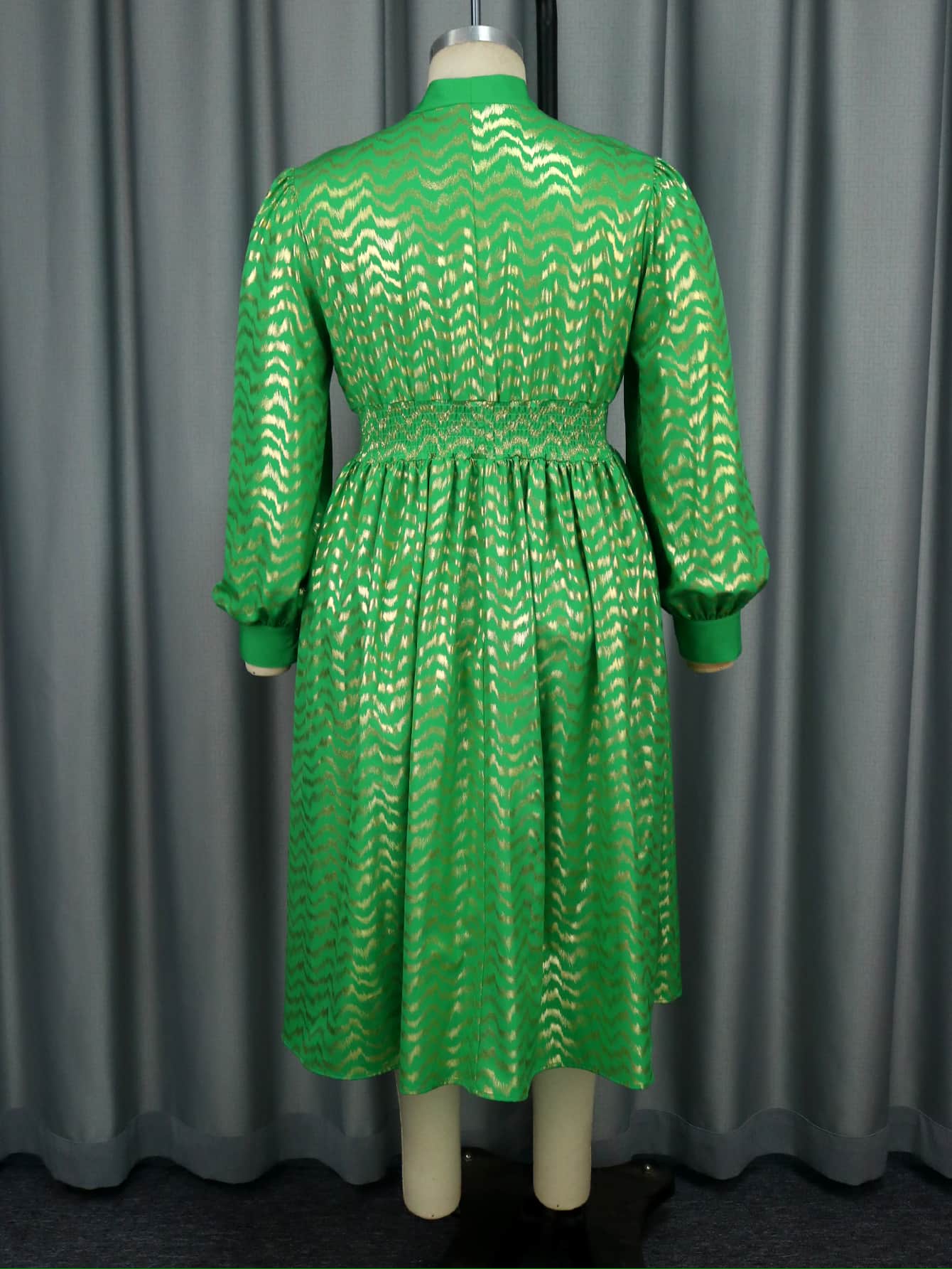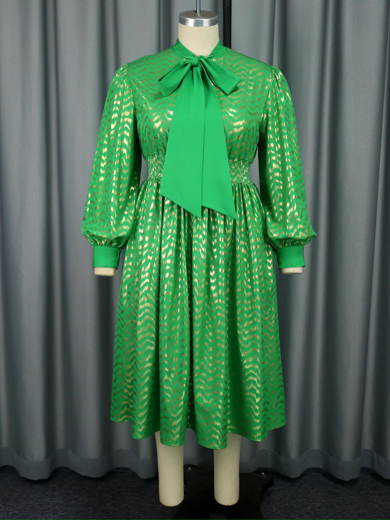Elevate your wardrobe with our Green Printed Lace-Up Bowtie A-Line Dress, perfect for a stylish and fun look. This dress features a charming green print and a flattering A-line silhouette that flows beautifully. The lace-up bowtie detail at the neckline adds a playful and feminine touch, while the long lantern sleeves provide a trendy, voluminous shape.